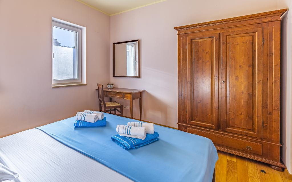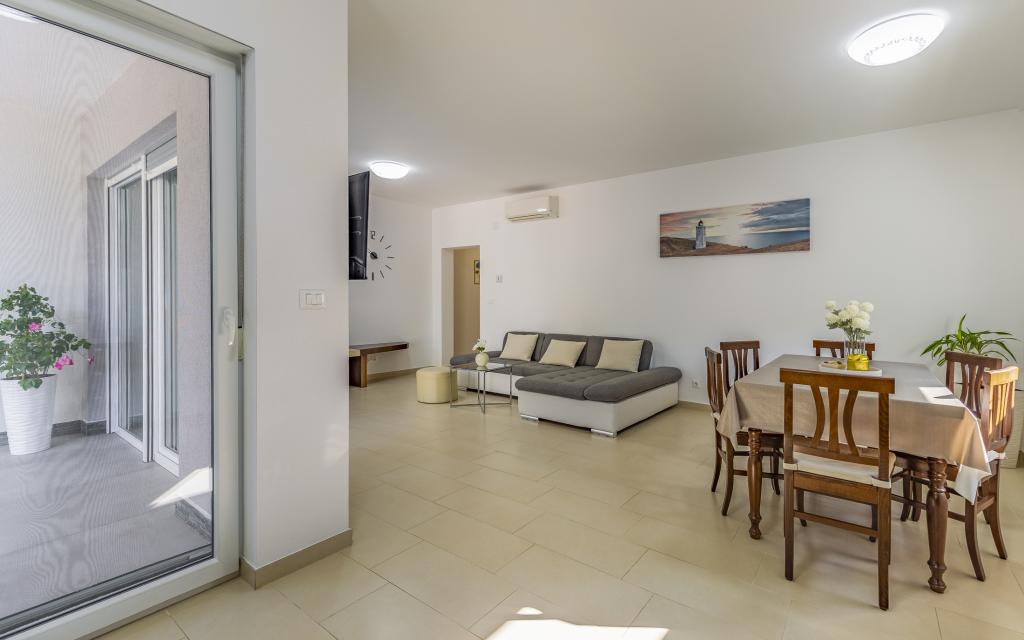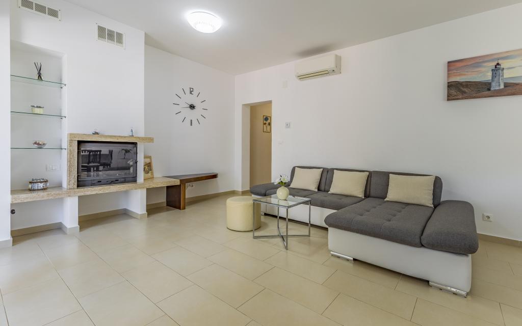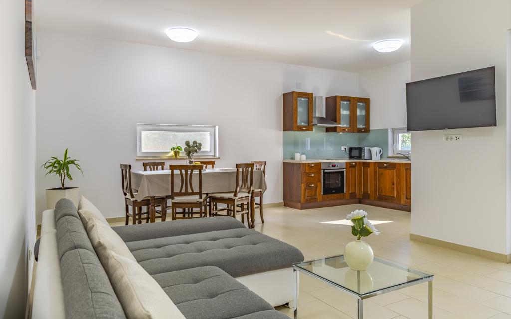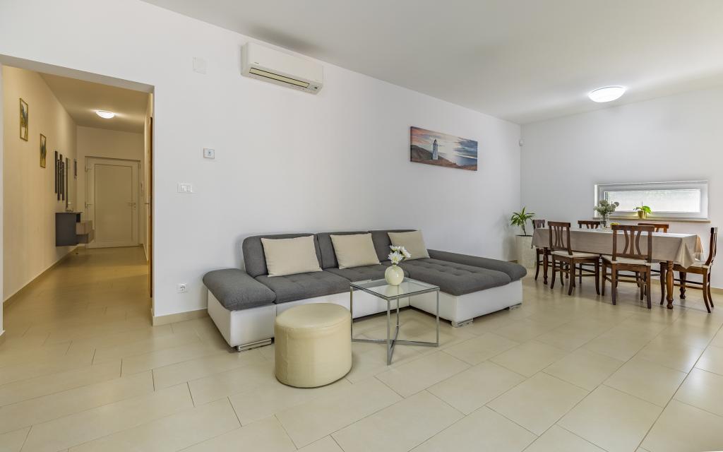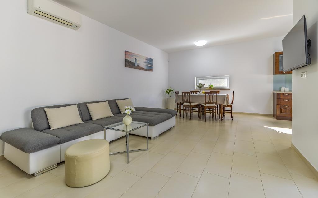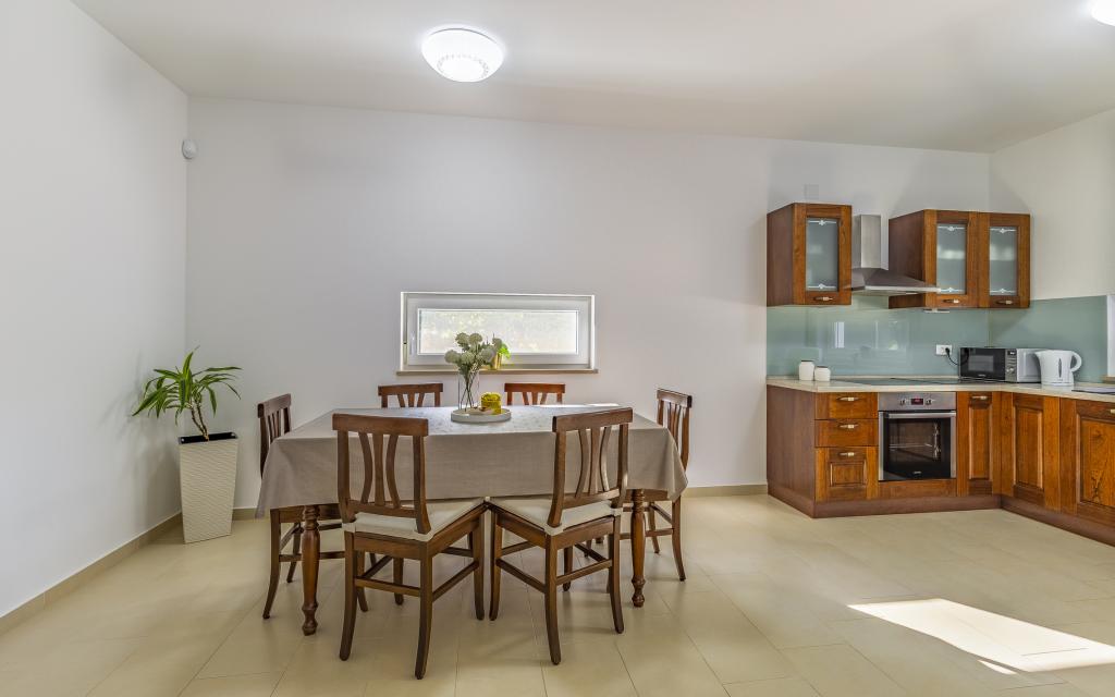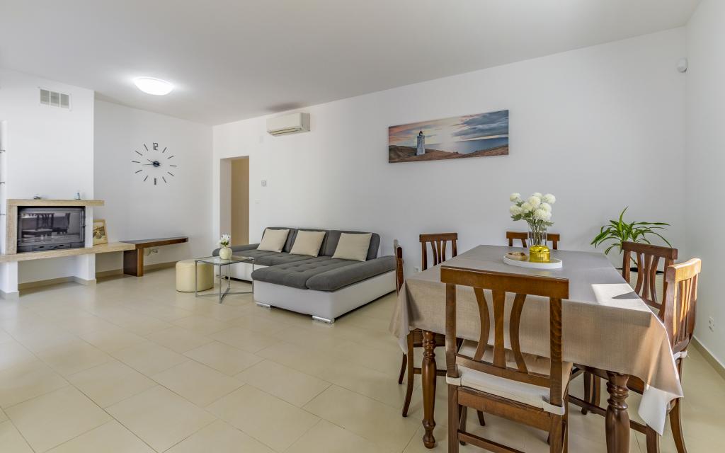Voll ausgestattete Ferienwohnung (80 m²) in exzellenter Lage in einem ruhigen Teil von Banjol. Die Unterkunft befindet sich 200 m vom Meer und 300 m von den schönsten Stränden der Gegend entfernt. Die Wohnung liegt im Erdgeschoss eines Wohnhauses mit insgesamt drei Wohnungen und verfügt über einen großen, privaten und umzäunten Garten (100 m²) mit separatem Eingang und eigenem Parkplatz direkt neben der Wohnung und dem Garten. Der Garten bietet eine große, überdachte Terrasse mit Tisch und sechs Stühlen, vier Liegestühlen, einer Außendusche und einem Grill. Hier können Sie in entspannter Atmosphäre und mit viel Privatsphäre, Sonne und Schatten gesellige Stunden verbringen. Das gesamte Gebäude ist von einer Steinmauer umgeben, und der Eingang ist mit Schiebetüren versehen. Die Wohnung besteht aus zwei Schlafzimmern mit Doppelbetten, zwei Badezimmern mit WC und Dusche, einem geräumigen Wohnzimmer mit Schlafcouch, einem Esszimmer und einer Küche. Die Wohnung ist klimatisiert und verfügt im Winter über eine Fußbodenheizung und einen Kamin, sodass sie sich auch für einen Aufenthalt in den kälteren Herbst- und Wintermonaten eignet.