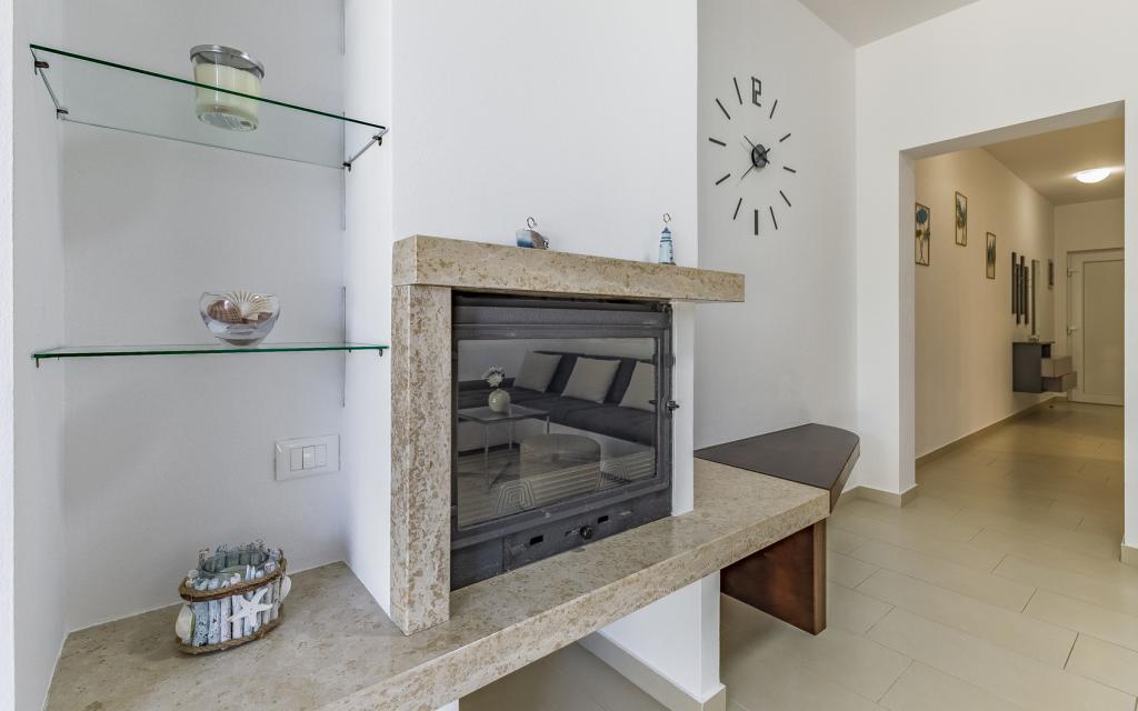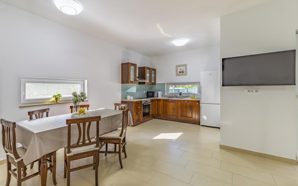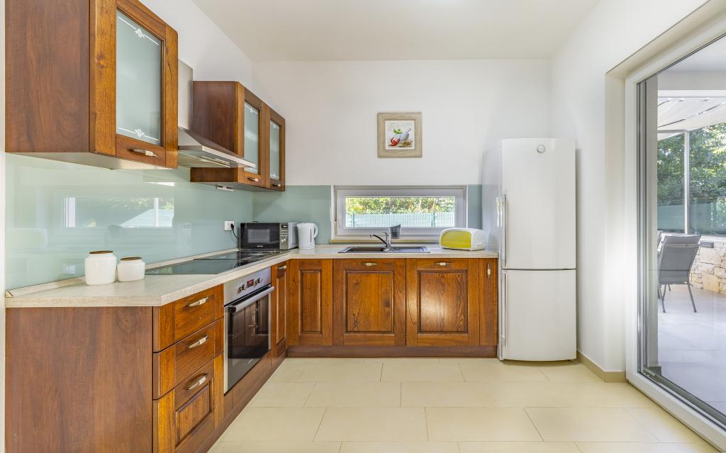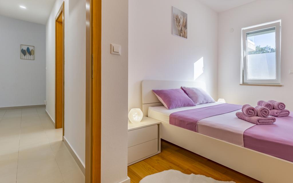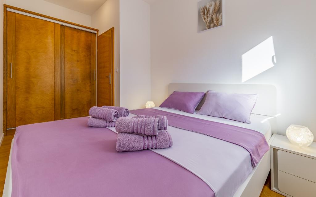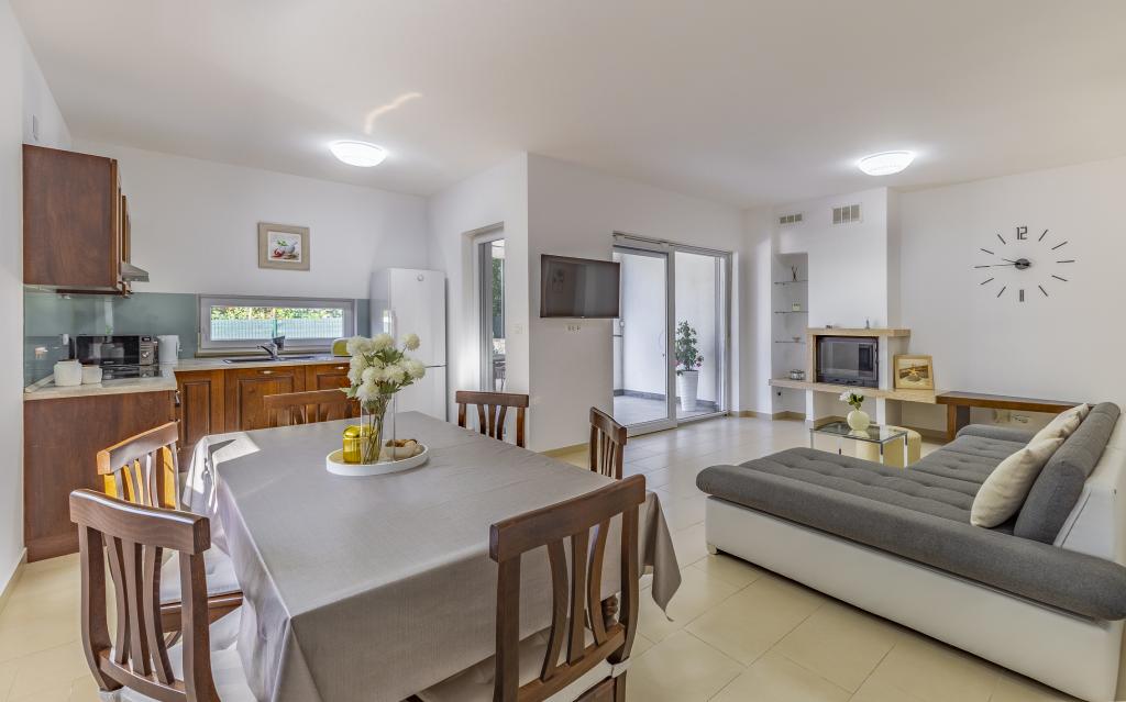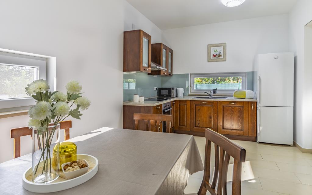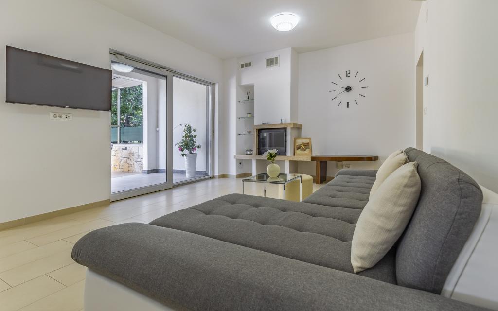 Voll ausgestattete Ferienwohnung (80 m²) in exzellenter Lage in einem ruhigen Teil von Banjol. Die Unterkunft befindet sich 200 m vom Meer und 300 m von den schönsten Stränden der Gegend entfernt. Die Wohnung liegt im Erdgeschoss eines Wohnhauses mit insgesamt drei Wohnungen und verfügt über einen großen, privaten und umzäunten Garten (100 m²) mit separatem Eingang und eigenem Parkplatz direkt neben der Wohnung und dem Garten. Der Garten bietet eine große, überdachte Terrasse mit Tisch und sechs Stühlen, vier Liegestühlen, einer Außendusche und einem Grill. Hier können Sie in entspannter Atmosphäre und mit viel Privatsphäre, Sonne und Schatten gesellige Stunden verbringen. Das gesamte Gebäude ist von einer Steinmauer umgeben, und der Eingang ist mit Schiebetüren versehen. Die Wohnung besteht aus zwei Schlafzimmern mit Doppelbetten, zwei Badezimmern mit WC und Dusche, einem geräumigen Wohnzimmer mit Schlafcouch, einem Esszimmer und einer Küche. Die Wohnung ist klimatisiert und verfügt im Winter über eine Fußbodenheizung und einen Kamin, sodass sie sich auch für einen Aufenthalt in den kälteren Herbst- und Wintermonaten eignet.