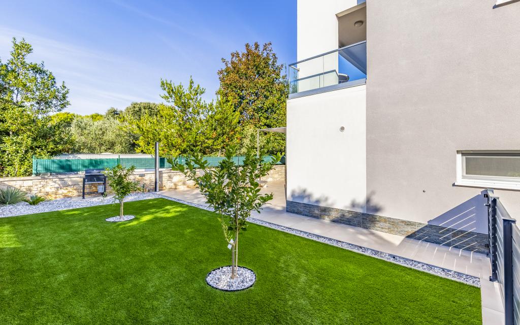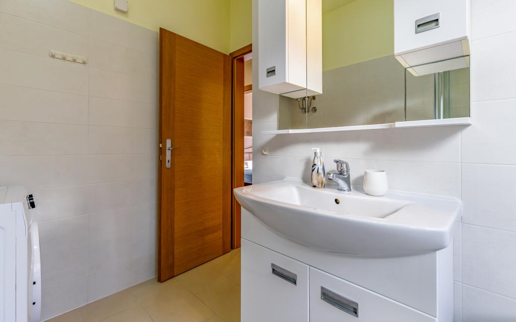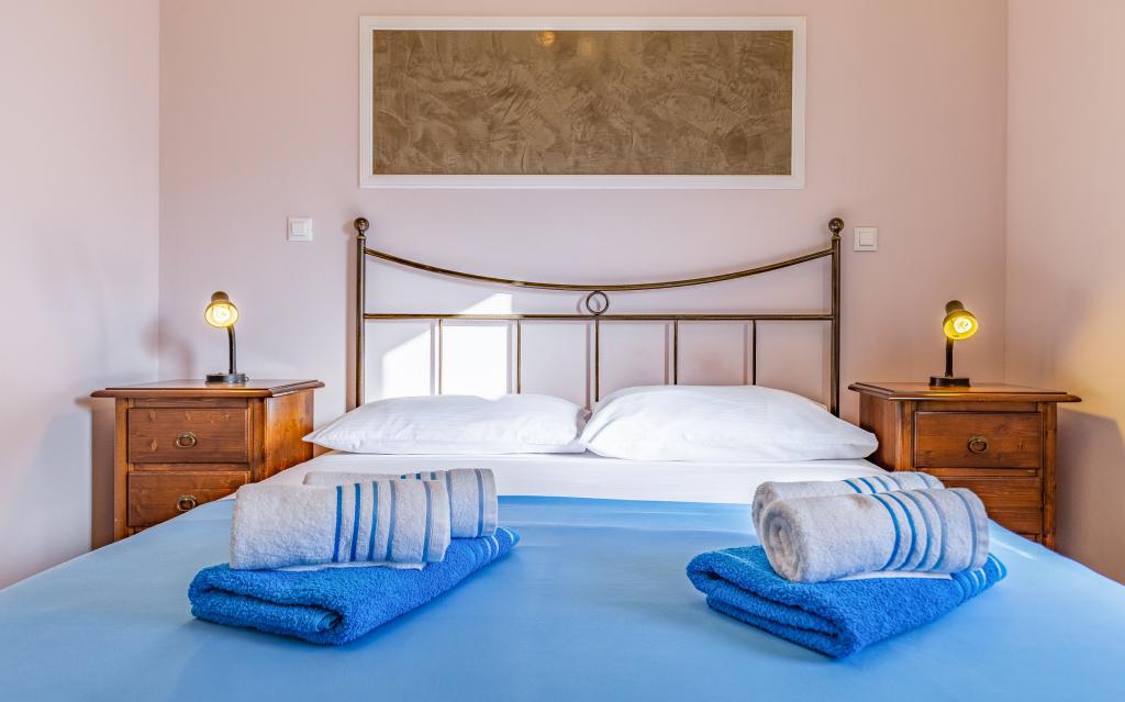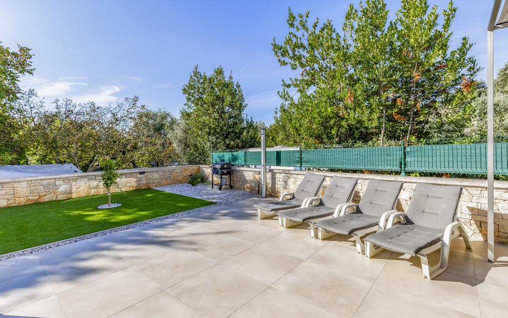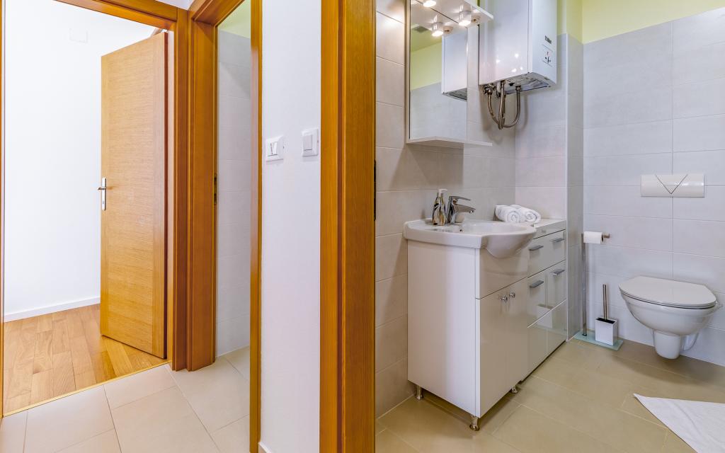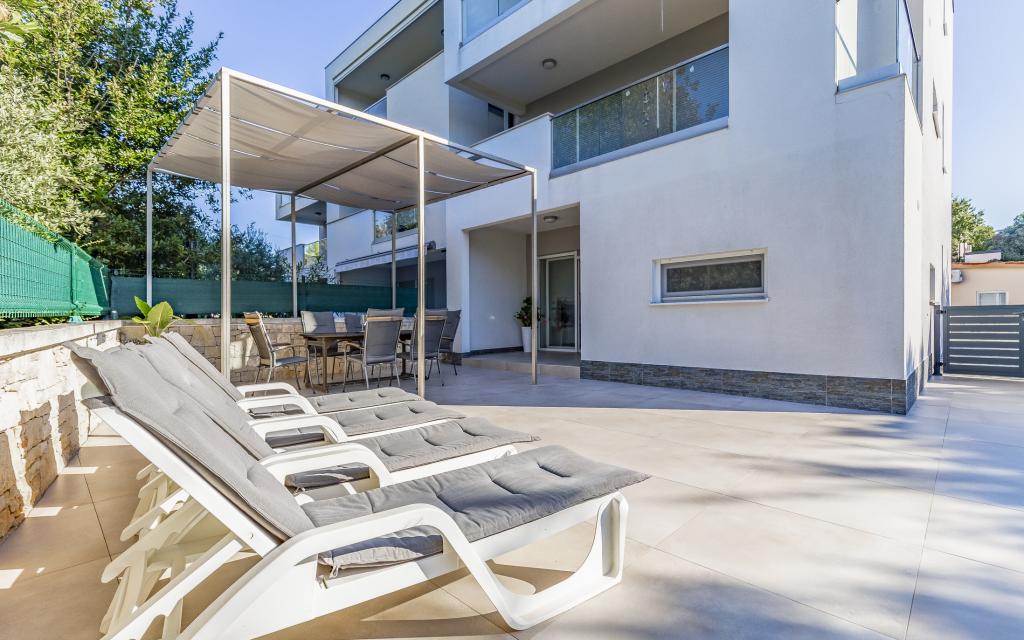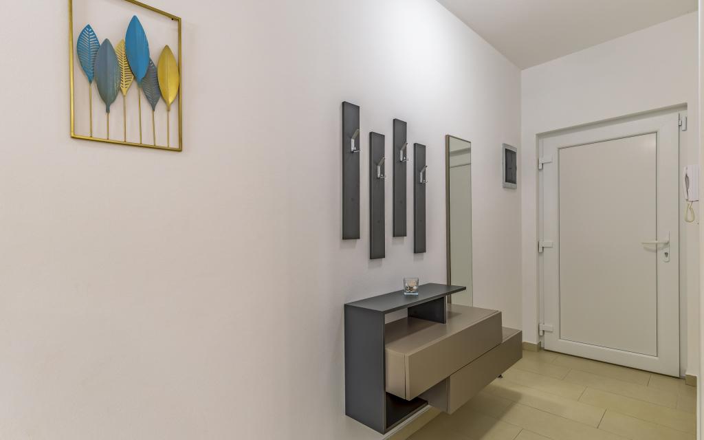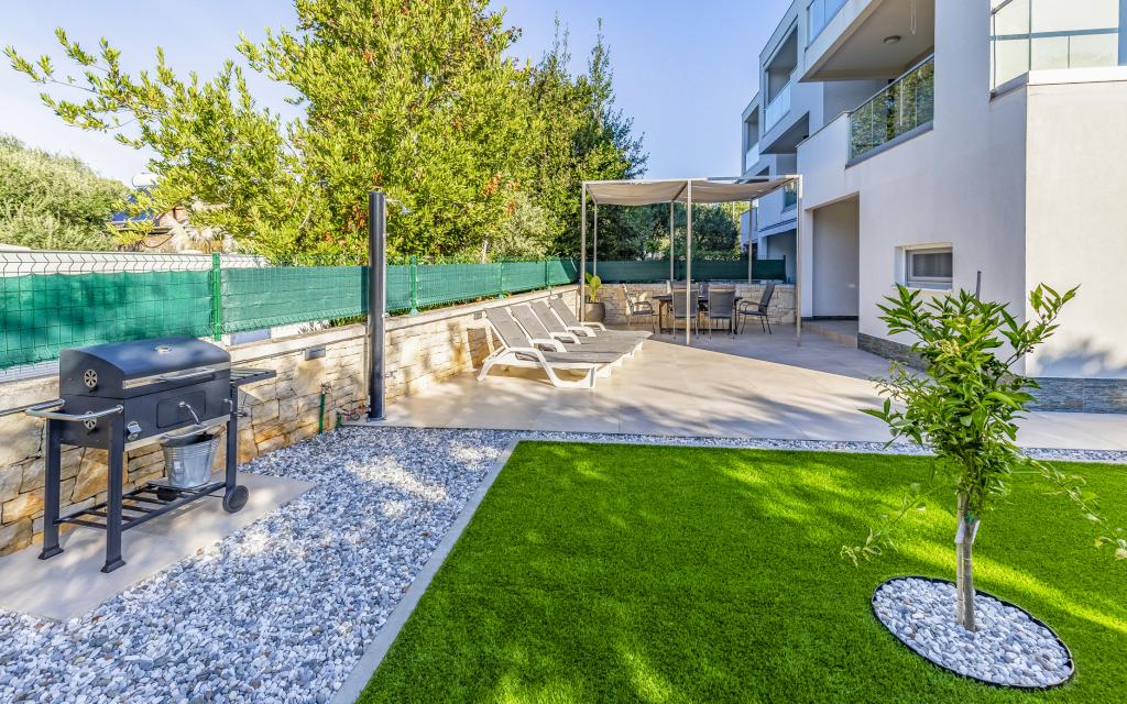 Voll ausgestattete Ferienwohnung (80 m²) in exzellenter Lage in einem ruhigen Teil von Banjol. Die Unterkunft befindet sich 200 m vom Meer und 300 m von den schönsten Stränden der Gegend entfernt. Die Wohnung liegt im Erdgeschoss eines Wohnhauses mit insgesamt drei Wohnungen und verfügt über einen großen, privaten und umzäunten Garten (100 m²) mit separatem Eingang und eigenem Parkplatz direkt neben der Wohnung und dem Garten. Der Garten bietet eine große, überdachte Terrasse mit Tisch und sechs Stühlen, vier Liegestühlen, einer Außendusche und einem Grill. Hier können Sie in entspannter Atmosphäre und mit viel Privatsphäre, Sonne und Schatten gesellige Stunden verbringen. Das gesamte Gebäude ist von einer Steinmauer umgeben, und der Eingang ist mit Schiebetüren versehen. Die Wohnung besteht aus zwei Schlafzimmern mit Doppelbetten, zwei Badezimmern mit WC und Dusche, einem geräumigen Wohnzimmer mit Schlafcouch, einem Esszimmer und einer Küche. Die Wohnung ist klimatisiert und verfügt im Winter über eine Fußbodenheizung und einen Kamin, sodass sie sich auch für einen Aufenthalt in den kälteren Herbst- und Wintermonaten eignet.