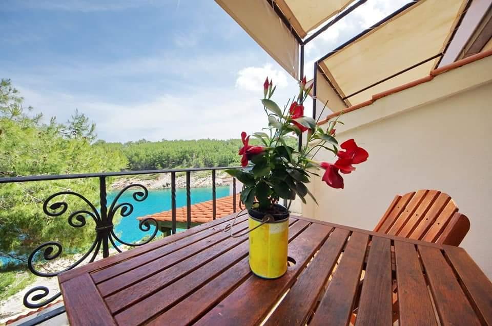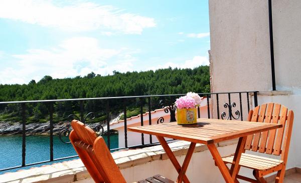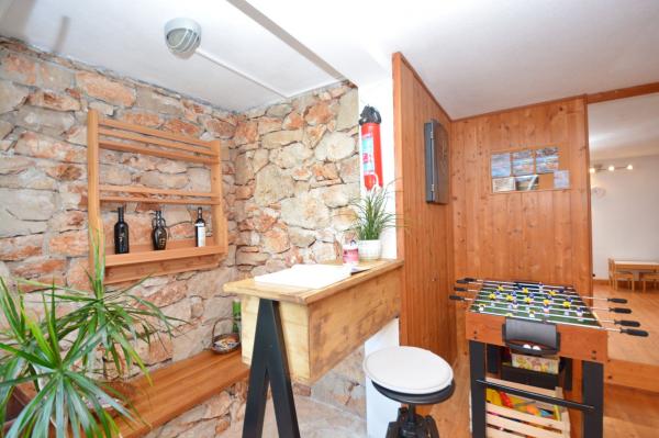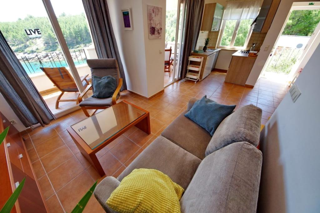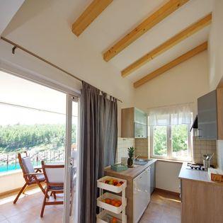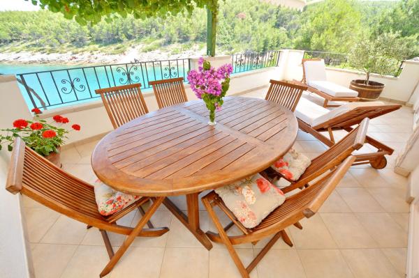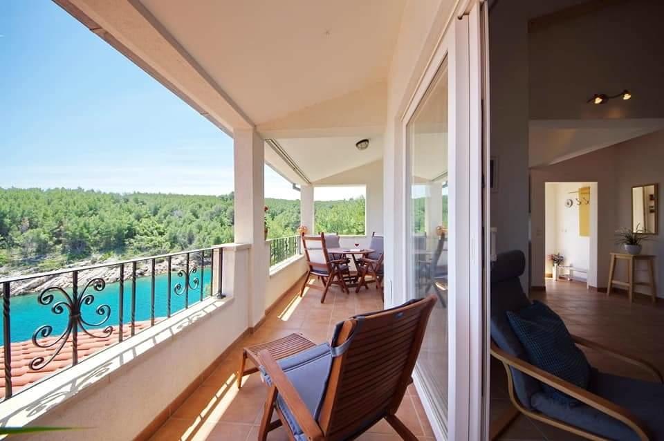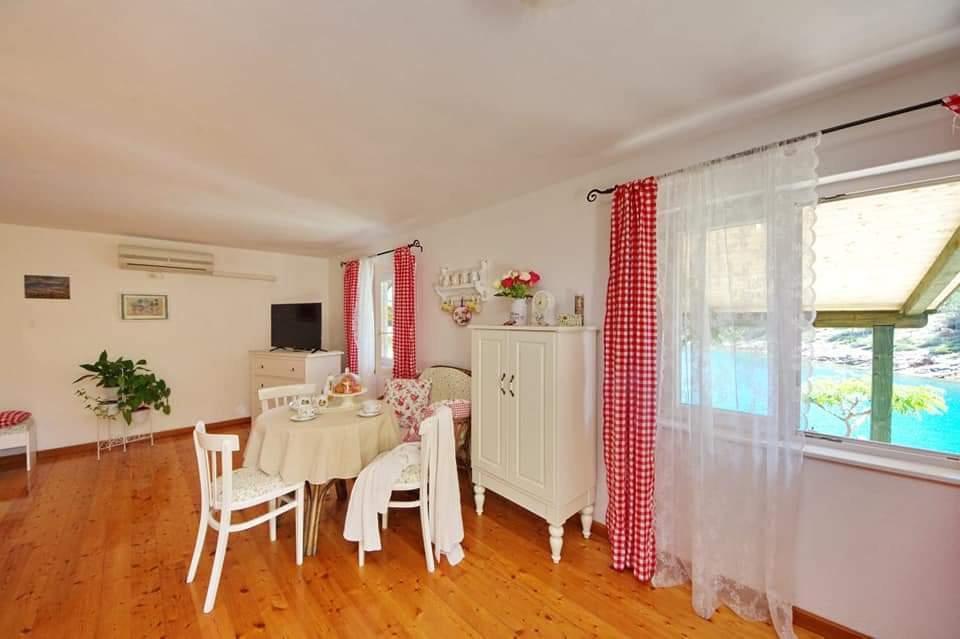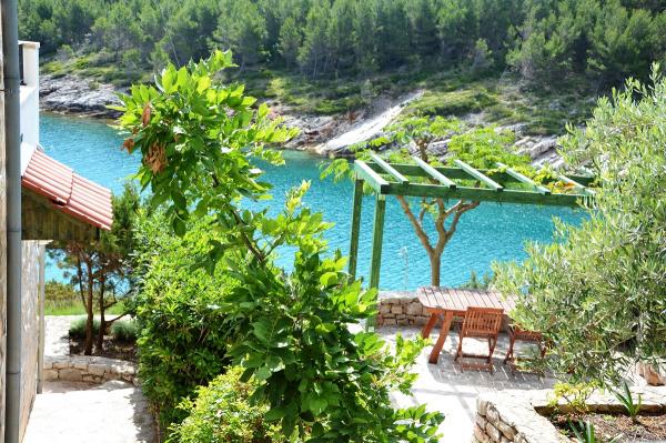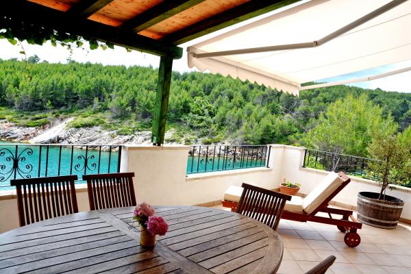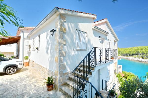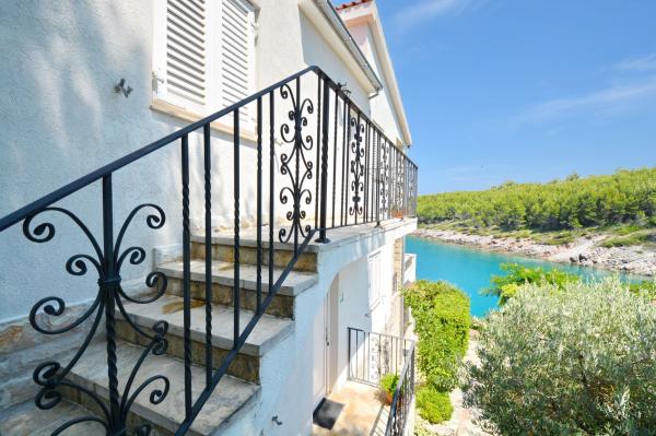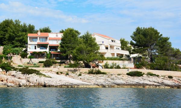 Apartmenthaus, kaskadiert, in einer wunderschönen ruhigen Bucht, erste Reihe zum Meer, mit 6 voll ausgestatteten Apartments, Fitnessraum, privatem Parkplatz, 2 Außenkaminen, 2 Außenduschen, Liegewiese, Außenwhirlpool, Kinderspielplatz und Garten. RUZMARIN (2) - 21 m2, separater Eingang, Erdgeschoss, Terrasse 20 m2, Wohnzimmer mit Küche und WC. KADULJA (4) – 60 m2, separater Eingang, mittlere Etage, Terrasse 25 m2, Wohnzimmer mit Küche und 2 Schlafzimmer mit 2 Toiletten. FIG (2) - 40 m2, separater Eingang, Obergeschoss, Terrasse 7 m2, Wohnzimmer mit Küche, WC und Schlafzimmer im Dachgeschoss. LAVANDA (4+1) – 60 m2, separater Eingang, Obergeschoss, Terrasse 15 m2, Eingangshalle, Wohnzimmer mit Küche und 2 Schlafzimmer mit 2 Toiletten. MASLINA (4) – 65 m2, separater Eingang, mittlere Etage, Terrasse 20 m2, Eingangshalle, Wohnzimmer mit Küche und Kamin, 2 Schlafzimmer mit 2 Toiletten. LOVOR (2+1) - 45 m2, separater Eingang, Erdgeschoss, Terrasse 20 m2, Wohnzimmer mit Küche und Schlafzimmer mit WC.