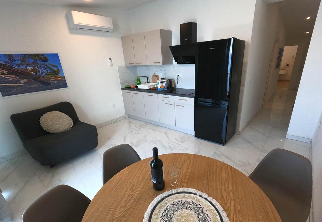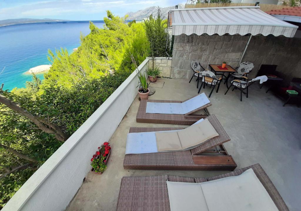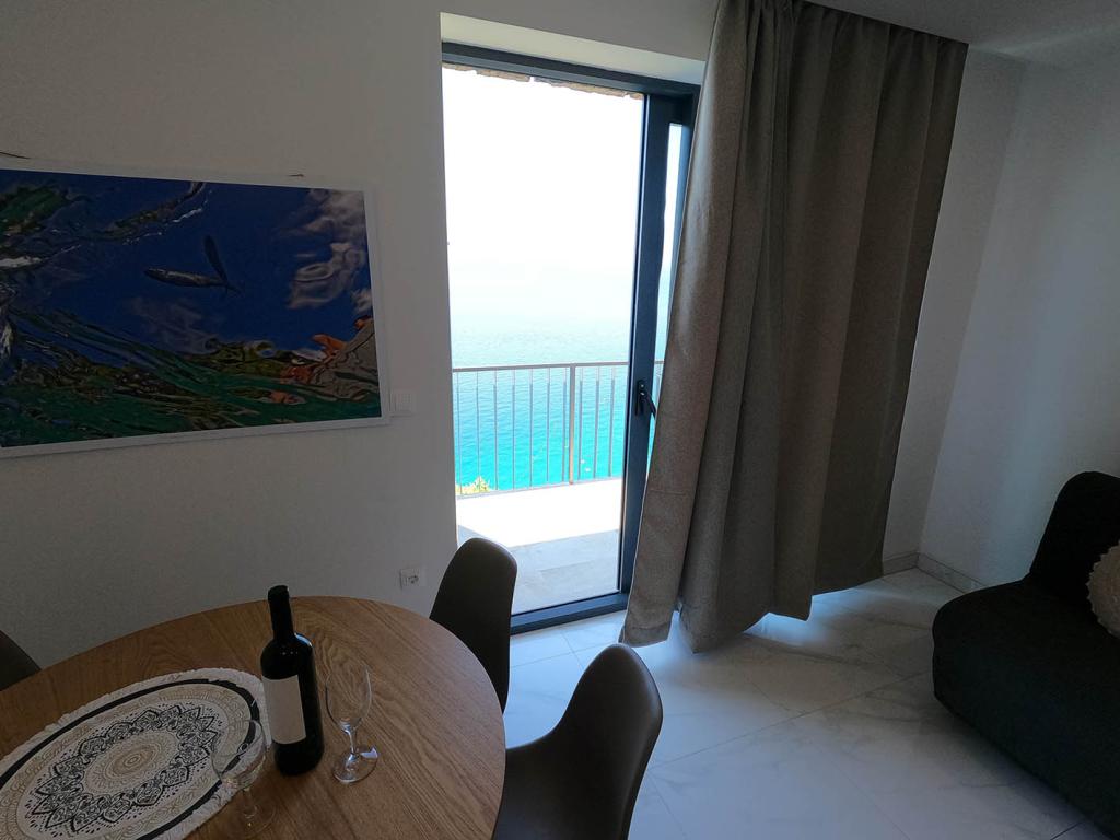 Neu renovierte und voll ausgestattete Wohnung in einer ruhigen Gegend zwischen Baska Voda und Brela, in der ersten Reihe zum Meer gelegen, über einem wunderschönen Strand. Die Anlage befindet sich 10 Minuten zu Fuß (ca. 500 m) vom Zentrum beider Orte entfernt. Große Terrasse mit Baldachin und Meerblick, 2 Doppelzimmer, zwei Badezimmer und Küche mit Zugang zur Terrasse. Alles neu. Die Wohnung befindet sich auf einer separaten Etage mit separatem Eingang, einem großen Garten, der von allen Nachbarn getrennt ist. Privatparkplatz im Schatten direkt über dem Haus.