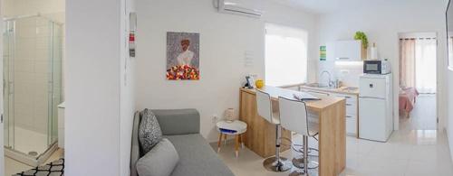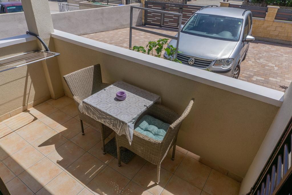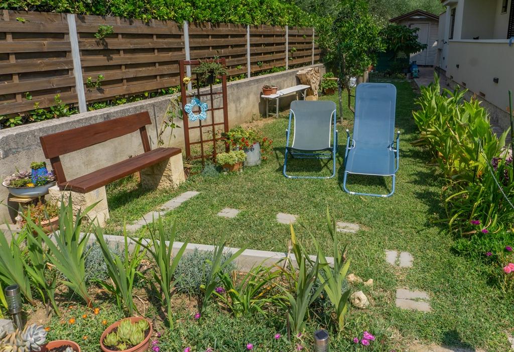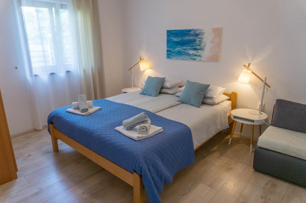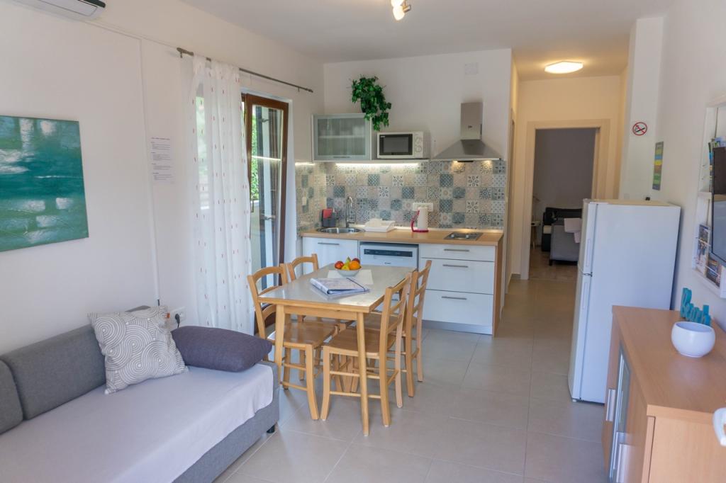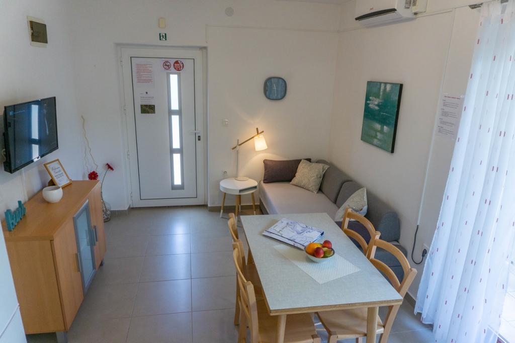 Die Ferienwohnungen befinden sich in einem Familienhaus in ruhiger Lage, nur 300 m (ca. 5 Gehminuten) vom Meer und dem Hauptstrand entfernt. Das Anwesen bietet zwei moderne Apartments im Erdgeschoss, wobei für jede Einheit ein gesicherter Parkplatz im Hof zur Verfügung steht. Die Lage ist ideal für Naturliebhaber (Rad- und Wanderwege) sowie für Entdecker des kulturellen Erbes und archäologischer Stätten. Apartment 1 (30 m² inkl. Terrasse): Verfügt über ein Schlafzimmer mit Doppelbett (160x200), ein Badezimmer mit Dusche und Haartrockner sowie einen Wohnbereich mit Küchenzeile. Im Wohnzimmer befindet sich ein Zustellbett (85x200) für ein Kind bis 12 Jahre. Apartment 2 (37 m² inkl. Terrasse): Verfügt über ein Schlafzimmer mit Doppelbett (160x200) und einen Schlafsessel (80x200) für ein Kind bis 10 Jahre, ein Badezimmer sowie einen Wohnbereich mit Küche. Im Wohnzimmer gibt es ein Sofa (90x200) für eine Person bis 18 Jahre. Beide Apartments sind klimatisiert und verfügen über kostenfreies