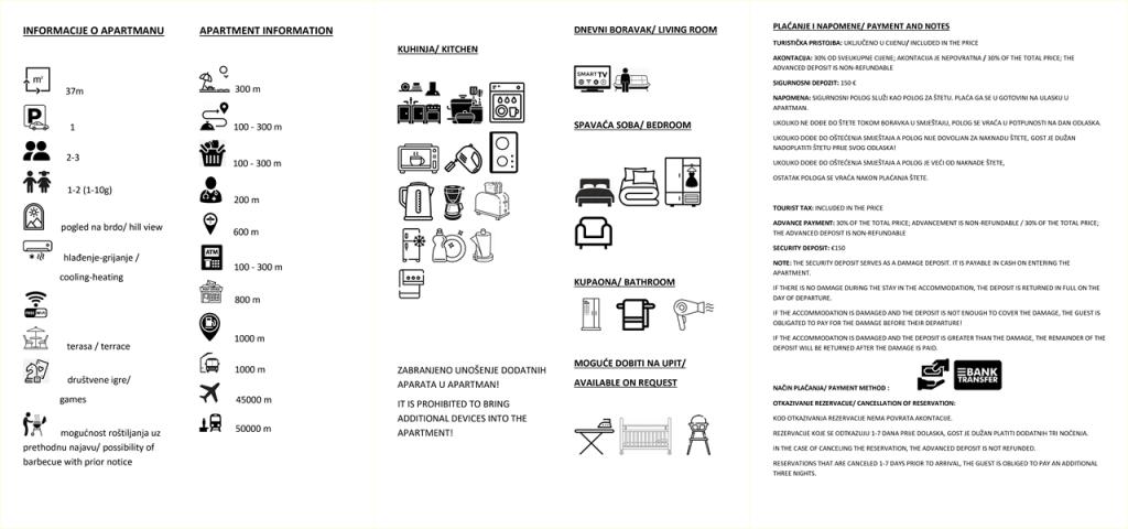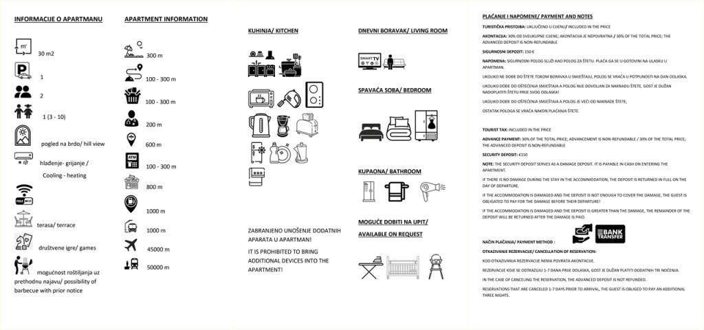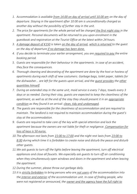 Check-in/out: Der Bezug der Wohnung ist nach 14:00 Uhr möglich, die Abreise muss bis 10:00 Uhr erfolgen. Zahlung: Reservierungen werden durch eine Anzahlung von 30% bestätigt. Der Restbetrag wird bei der Ankunft bezahlt. Kaution: Bei der Ankunft ist eine Kaution von 150 € zu hinterlegen, die am Abreisetag zurückerstattet wird, sofern keine Schäden entstanden sind. Preise: Bei Aufenthalten von bis zu 3 Nächten erhöht sich der Preis um 30%. Der Aufpreis für eine zusätzliche Person beträgt 10 € pro Nacht. Hausordnung: Nicht angemeldete Gäste und Haustiere sind nicht gestattet. Ruhezeiten: 15:00–17:00 Uhr und 23:00–08:00 Uhr. Saison: Geschlossen vom 31.10. bis 15.03. Reservierungen für 2026 werden ab dem 01.01.2026 entgegengenommen.