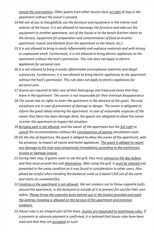 Nicht erstattungsfähige Anzahlung: Die Anzahlung von 30% dient als Buchungsgarantie und Entschädigung im Falle des Nichterscheinens; sie ist nicht erstattungsfähig. Vorzeitige Abreise (Wunsch des Gastes): Wenn ein Gast seinen Aufenthalt freiwillig verkürzt, ist der volle Reservierungsbetrag zu zahlen. Schäden: Die Kaution von 150 € dient zur Deckung eventueller Schäden. Übersteigt der Schaden die Kaution, muss der Gast die Differenz sofort begleichen. Verstoß gegen die Hausordnung: Bei Verstößen gegen die Regeln hat der Eigentümer das Recht, die Reservierung zu stornieren. In diesem Fall wird der Betrag für die verbleibenden Tage (ab dem folgenden Tag) dem Gast zurückerstattet.