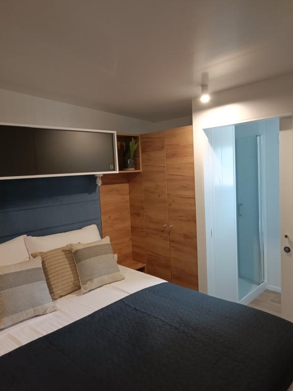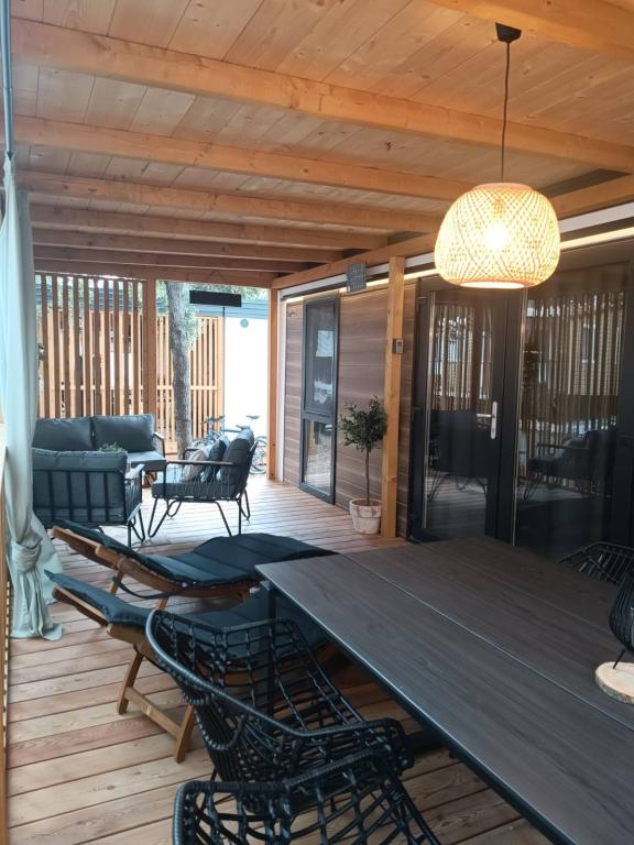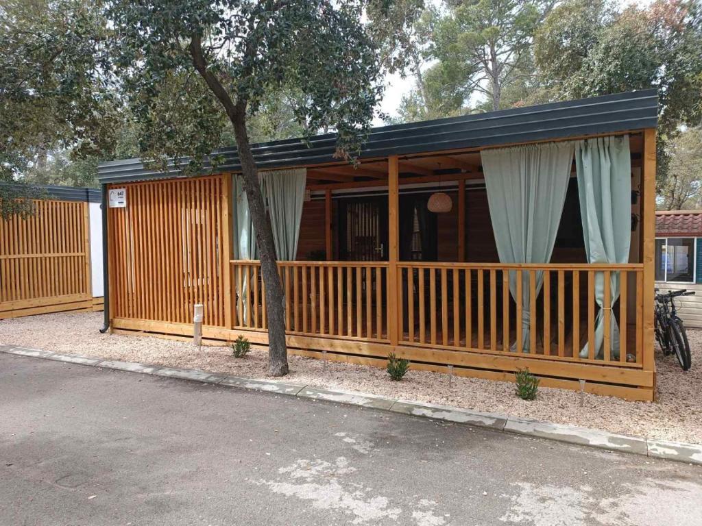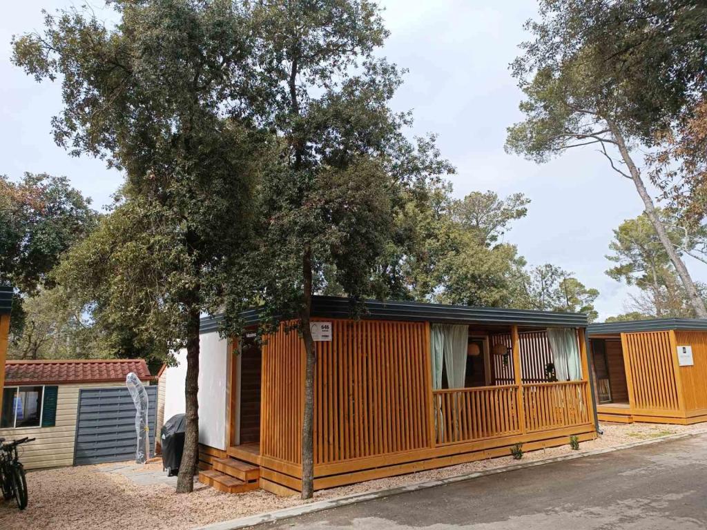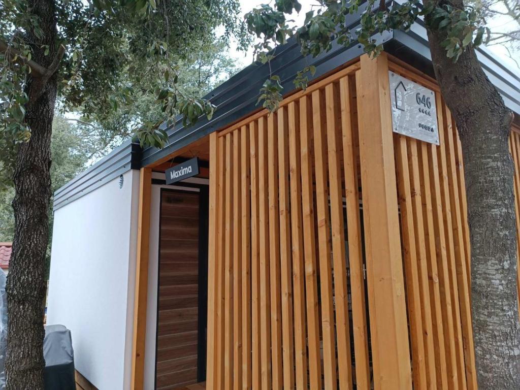Das moderne Mobilheim InnMare 646 liegt in ruhiger Lage auf dem Campingplatz Soline, inmitten eines Kiefernwaldes, und ist der ideale Ort für einen Familienurlaub. Auf 32 m² bietet es ein Schlafzimmer mit Doppelbett, ein Schlafzimmer mit zwei Einzelbetten, ein Wohnzimmer mit Schlafcouch (für 1-2 Personen), zwei separate Badezimmer mit WC, eine 32 m² große Terrasse, einen kleinen Hof und einen Parkplatz. Das Haus ist komplett möbliert. Die Küche ist neben der Standardausstattung mit Mikrowelle, Wasserkocher und Espressomaschine ausgestattet. Auf der Terrasse laden ein Esstisch und Liegestühle zum Entspannen im Kiefernduft ein. Direkt neben dem Haus befindet sich ein Grill, der ebenfalls zur Ausstattung gehört. Ein Parkplatz für ein Fahrzeug steht den Gästen zur Verfügung. Willkommen im InnMare 646, einem modernen Anwesen, das für einen ruhigen und idyllischen Familienurlaub in einem stillen Kiefernwald, in der Nähe des Meeres, der Strände und von Biograd na moru, gedacht ist!