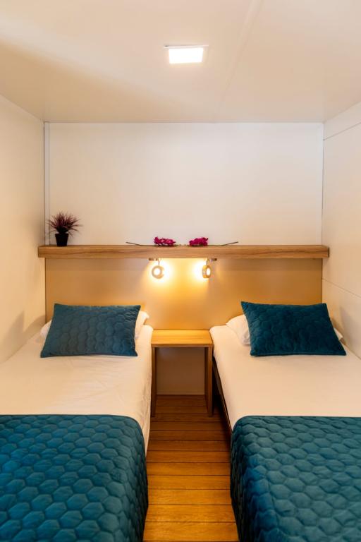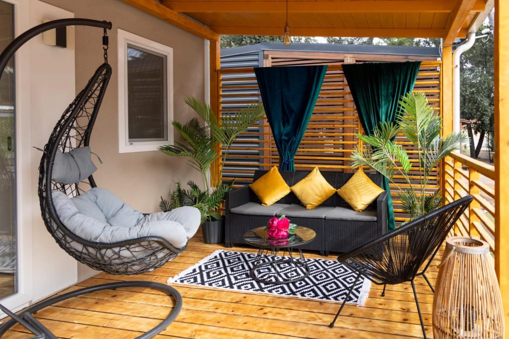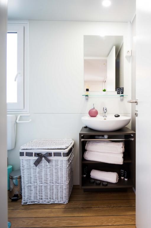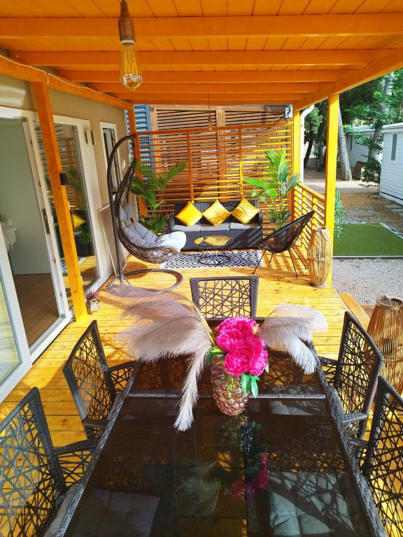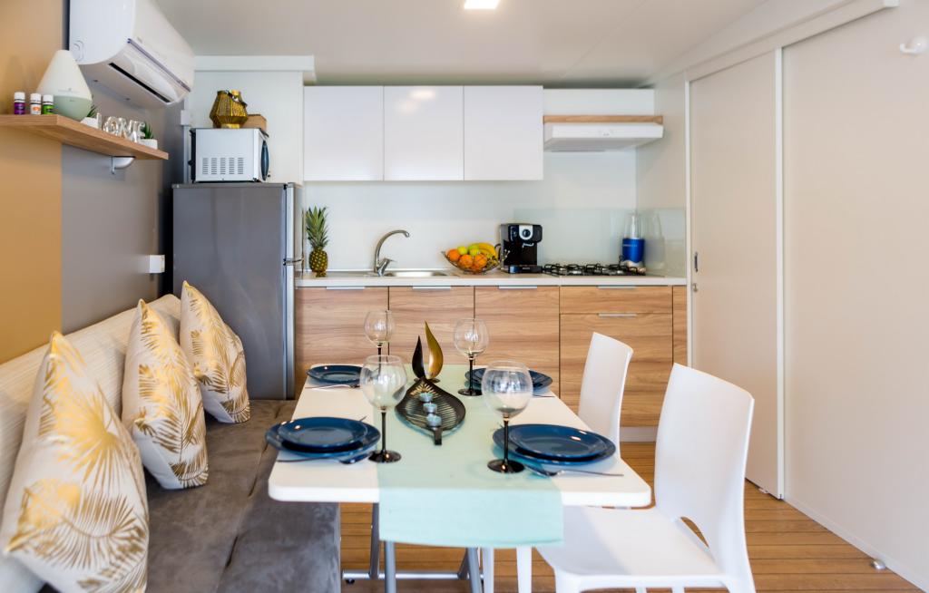 Das Mobilheim Nancy befindet sich im Camp Soline in Biograd na Moru, nur zwei Minuten vom wunderschönen Kieselstrand entfernt. Es ist mit zwei Zimmern ausgestattet, eines davon mit einem Bett (160 x 200 cm) und eigenem WC/Bad. Das zweite Zimmer verfügt über zwei Betten (80 x 200 cm), die problemlos zu einem größeren Bett zusammengestellt werden können. Es verfügt über ein Wohnzimmer, eine voll ausgestattete Küche, ein zusätzliches WC/Bad, einen Geschirrspüler, eine Mikrowelle, einen Gefrierschrank, eine Kaffeemaschine und ein Sofa, das in ein Bett umgewandelt werden kann, auf dem zwei Personen schlafen können. Das Haus bietet Platz für sechs Personen (4+2). Auf der schönen und großzügigen Terrasse können Sie entspannen und den Sonnenuntergang bei einem guten Glas Wein genießen. In Kampo gibt es ein Restaurant nur 200 m vom Haus entfernt, außerdem gibt es verschiedene Cafés und Restaurants sowie Spielplätze für Kinder. Für unsere jüngsten Gäste finden täglich Animationen statt. Das Zentrum von Biograd erreichen Sie über einen Weg durch einen dichten Kiefernwald, der Schatten spendet und allerlei Attraktionen für unsere Kleinsten und Großen bietet.