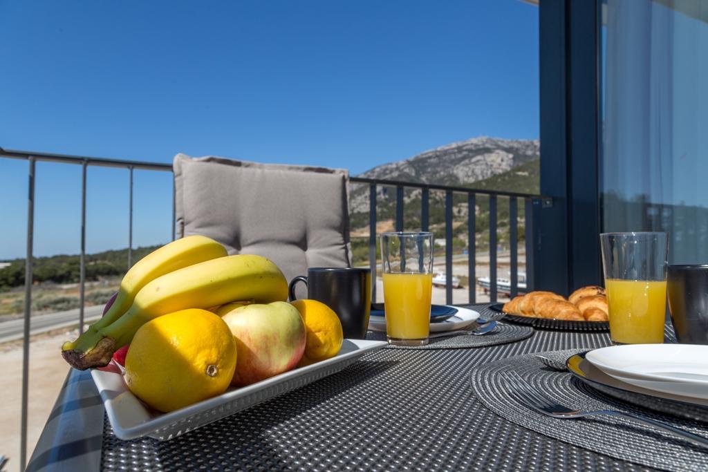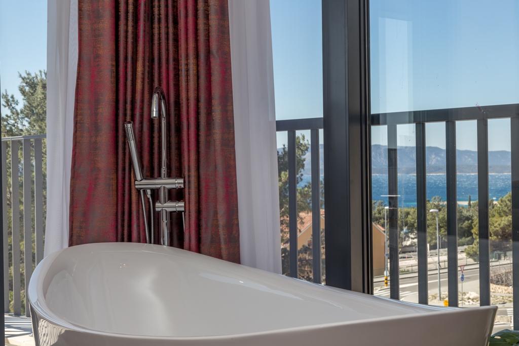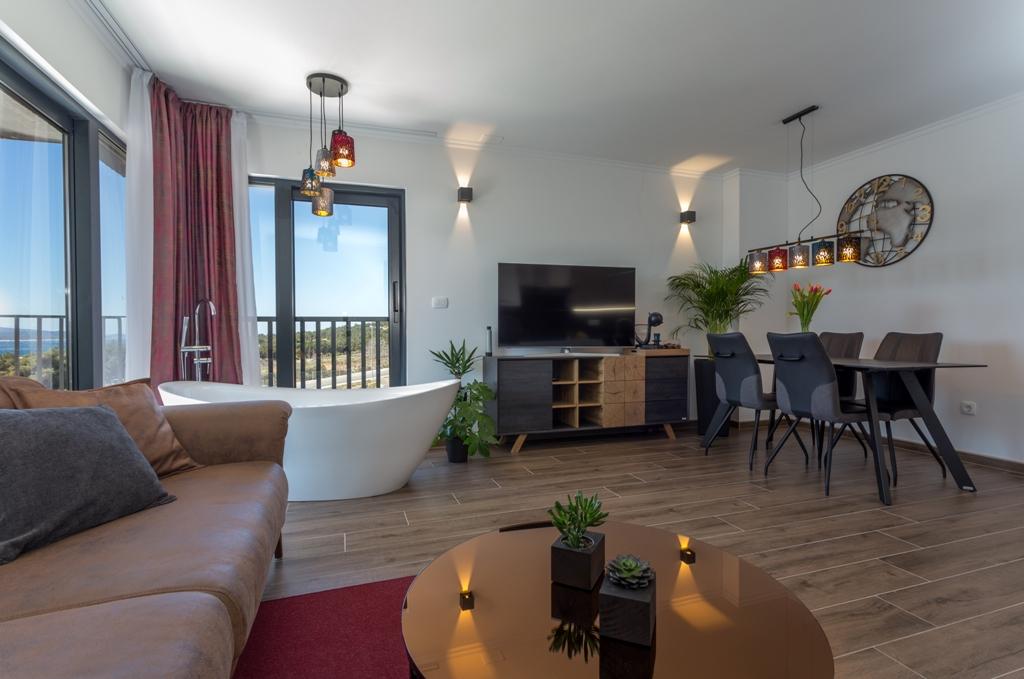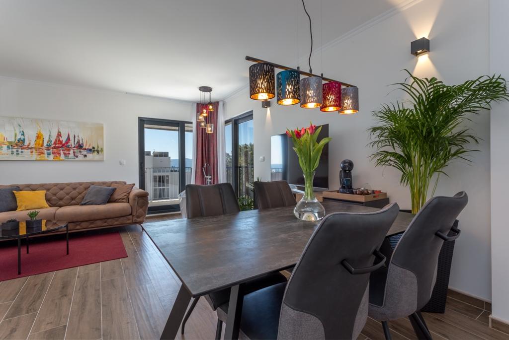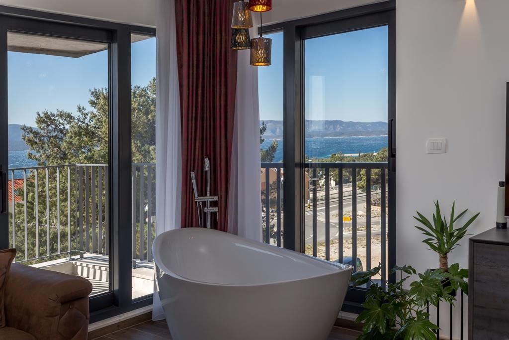 Das Apartment Pleasure Bol ist eine hervorragende Kombination aus Lage, Komfort und Konnektivität. Sie haben das Beste gewählt, denn beim Betreten der Stadt Bol gelangen Sie in Ihren Garagenplatz im Erdgeschoss der Wohnung und damit enden alle Sorgen um die Sicherheit Ihres Autos, das Sie für Ihren Aufenthalt in Bol nicht mehr benötigen. Das Betreten der Wohnung wird Ihnen ein breites Lächeln ins Gesicht zaubern, denn neben den Designerdetails wird der Blick auf die großen Glaswände gelenkt, die den Blick auf den Strand Zlatni Rat, das offene Meer und einen wunderschönen Sonnenuntergang direkt vor Ihnen freigeben. Wenn Sie auf die Terrasse hinausgehen, wird all dies durch einen ungehinderten Blick auf den höchsten Gipfel der Insel Brač ergänzt – Vidova Gora (778 m).