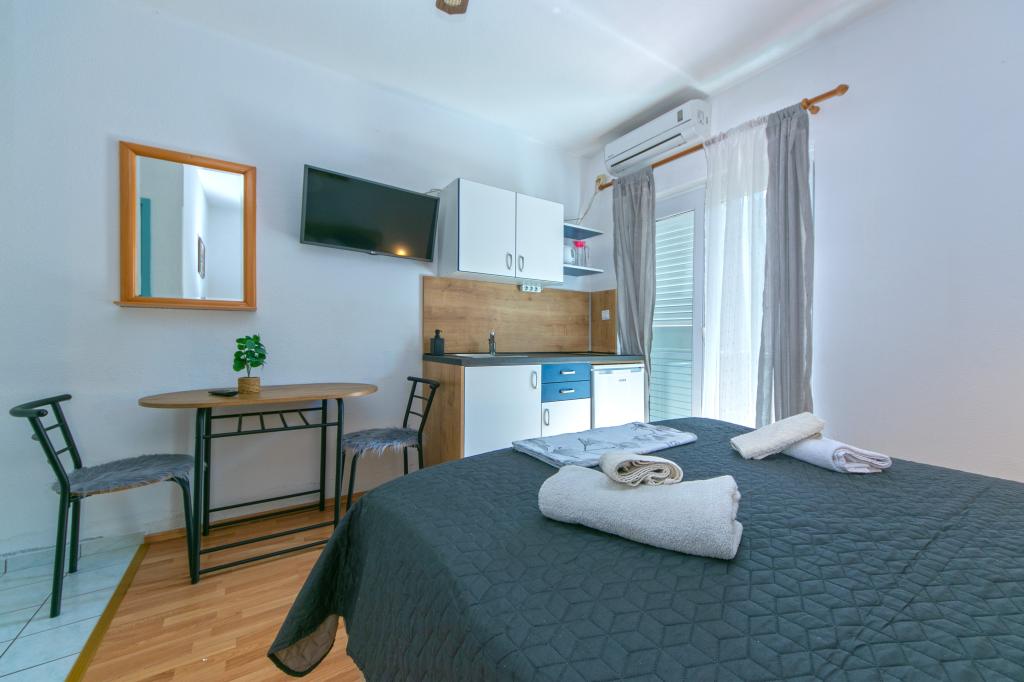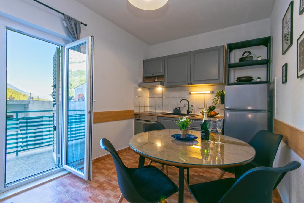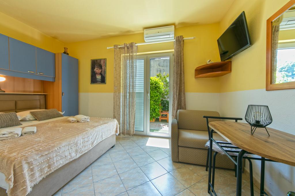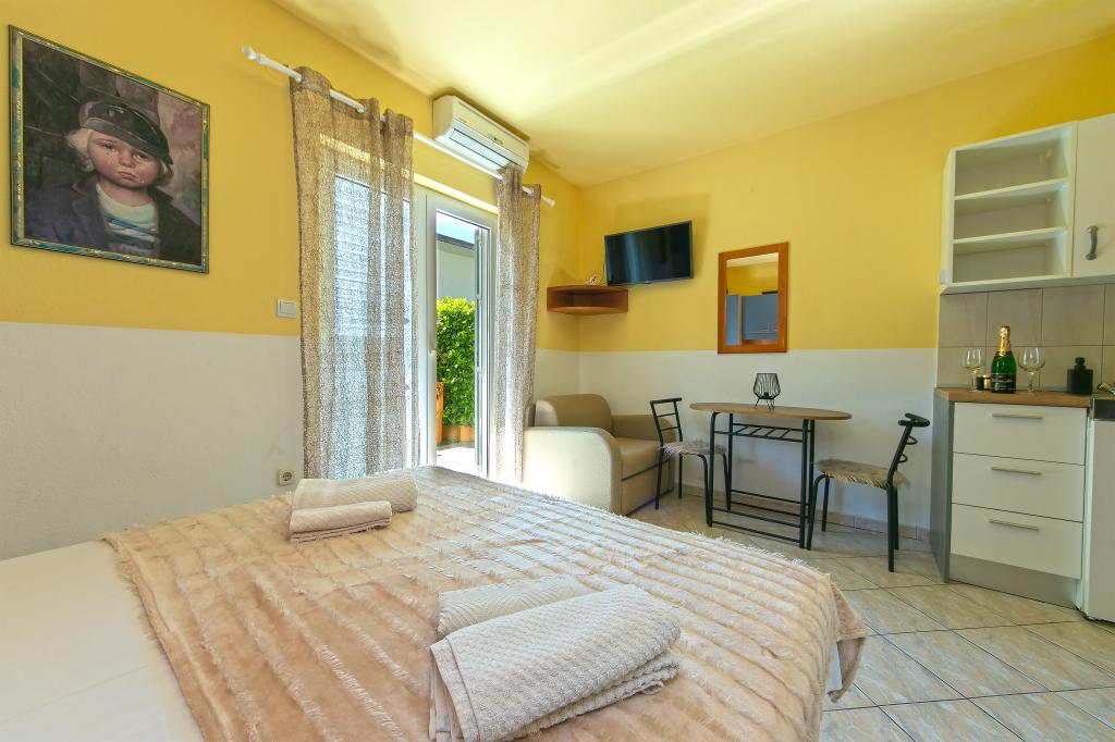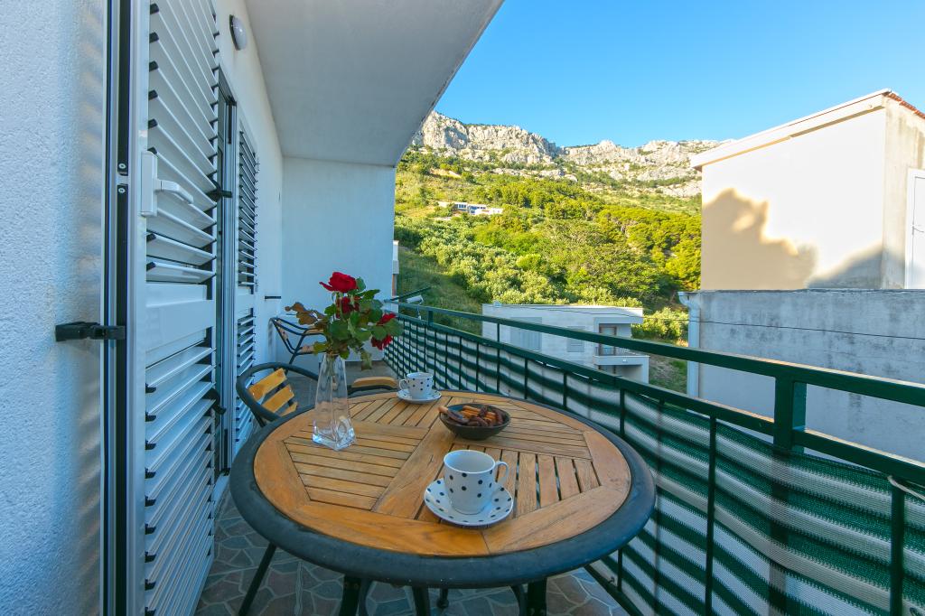 Die Apartments Hrvoje befinden sich in erhöhter Lage im ruhigen Teil der Stomarica Straße. Entfernung vom Kiesstrand ist ca. 3 min. Spaziergang oder 150 M. Auf der einen Seite des Hauses gibt es einen Blick auf das Meer und die andere hat einen Blick auf den Berg Biokovo. Das Familienangebot der Familie Jelčić ist hochwertig und die Gäste können sich in den Appartements völlig entspannen und einen unvergesslichen Urlaub verbringen. Die Apartments befriedigen alle Gäste, die einen angenehmen Urlaub verbringen möchten. Das Angebot umfasst Apartments mit Küche, Schlafzimmer, Klimaanlage, Sat-TV, Bad und Balkon. Hinter dem Haus befindet sich eine Gartenterrasse mit Tischen, wo Sie sich entspannen und die friedliche Atmosphäre mit Blick auf das Meer genießen können. Ebenfalls verfügbar ist die Verwendung eines Außengrills, aber eine freundliche Dame. Jelcic wird ihnen gerne helfen. Das Parken ist gesichert.