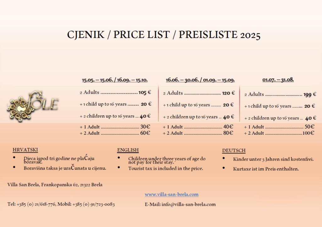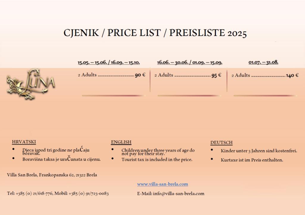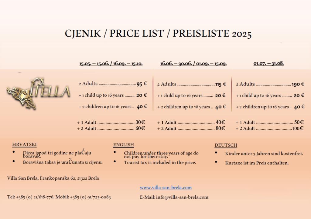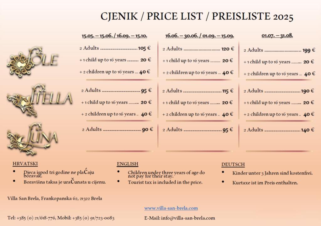 Villa SAN war ein Traum Ned und Ante, die Realität in der schönen Brela wurde und Aktien, die heute mit ihren Gästen. Auf seiner Realisierung ausgebildete Gastronomen mehr als 30 Jahren arbeiten in seiner Familie Restaurant in Deutschland haben. 1998 ihre Bemühungen wurden schließlich durch den Kauf eine alte Villa in einer ruhigen Umgebung nahe am Meer gekrönt. Sieben Jahre dauernde Arbeit der Renovierung der 1937 gebaute Villa, während alle total nicht die Wünsche von Ned und Ante entsprechen. Heute, Freunde und Gäste sind von 15 04. bis 15. 10. jedes Jahr drei schön und komfortabel eingerichtete Wohnung namens Luna, Sole und Stella. Jede Wohnung hat seinen eigenen Charme und Stil - sei es auf dem Kamin, schöne Terrasse und einen atemberaubenden Blick auf das Meer. Der idyllische Garten mit Palmen und verschiedenen Pflanzen und Blumen lädt zum Ausruhen. Für diese Oase Besitzer im Jahr 2008 von der Gemeinde einer Auszeichnung beste Gärten in Brela empfing, auf die sie besonders stolz ist.