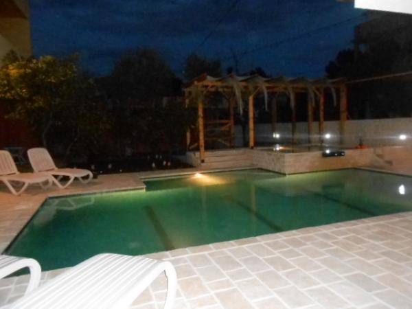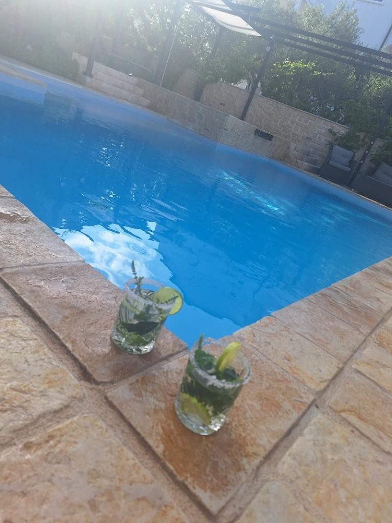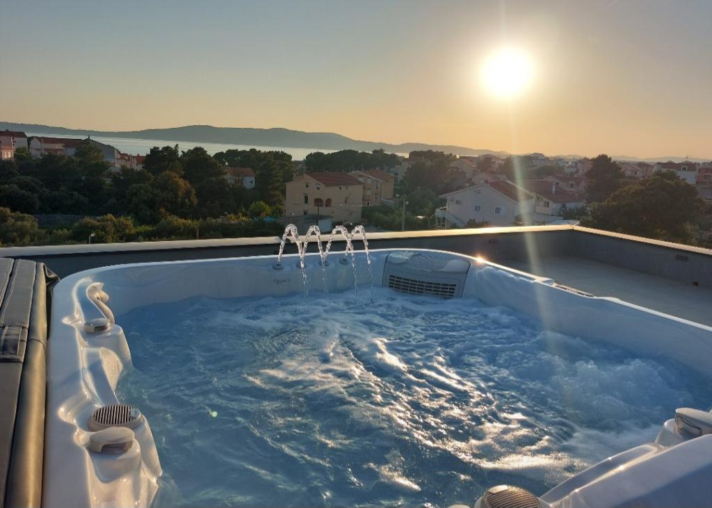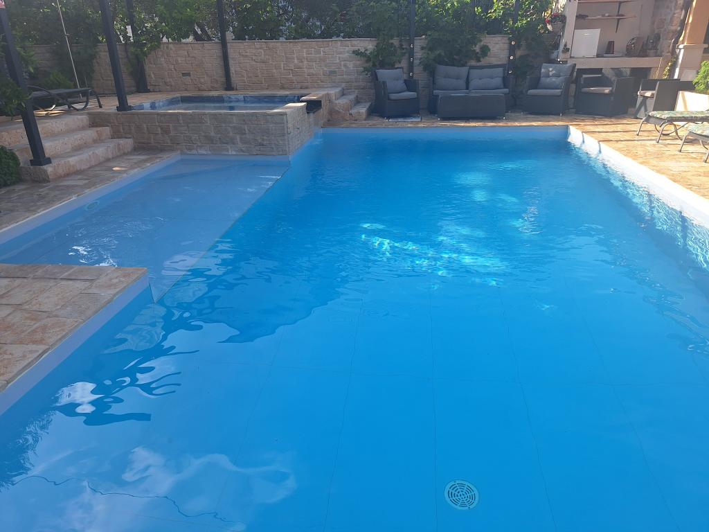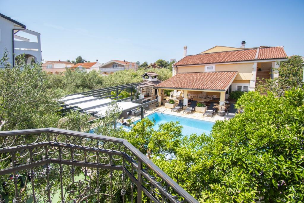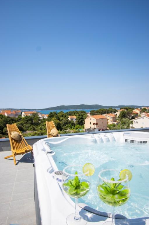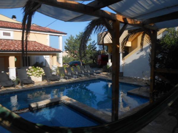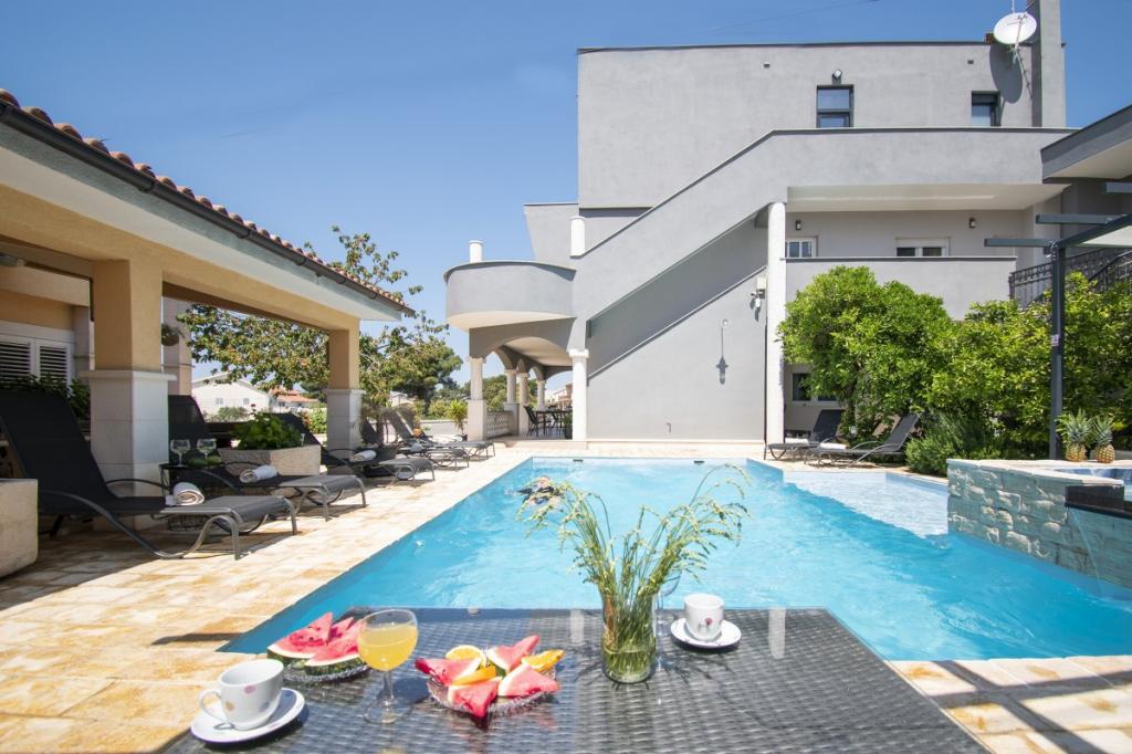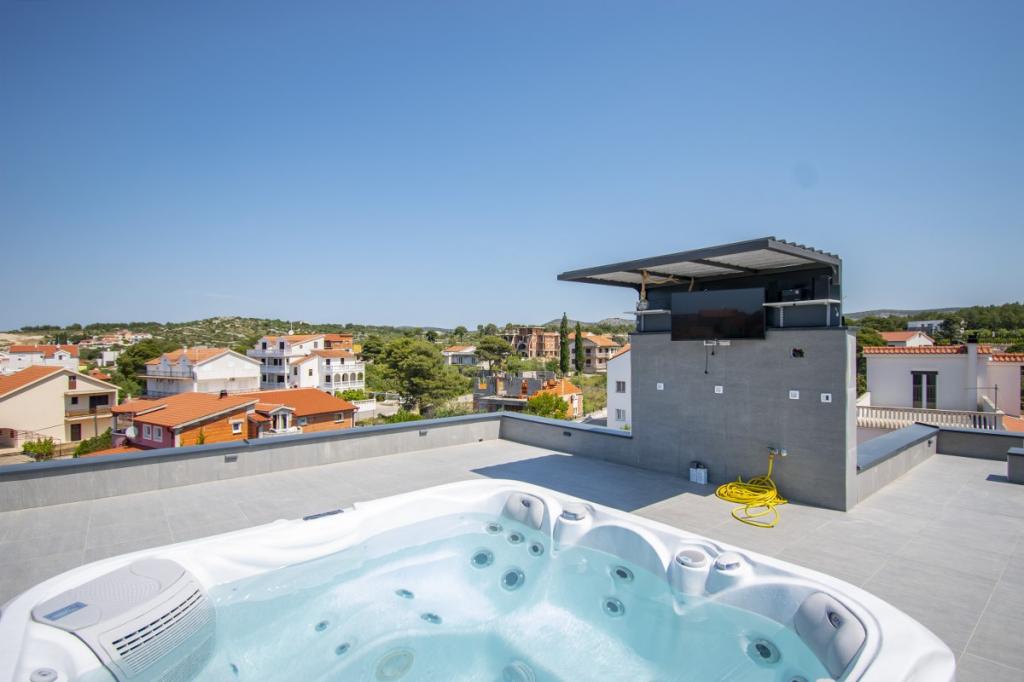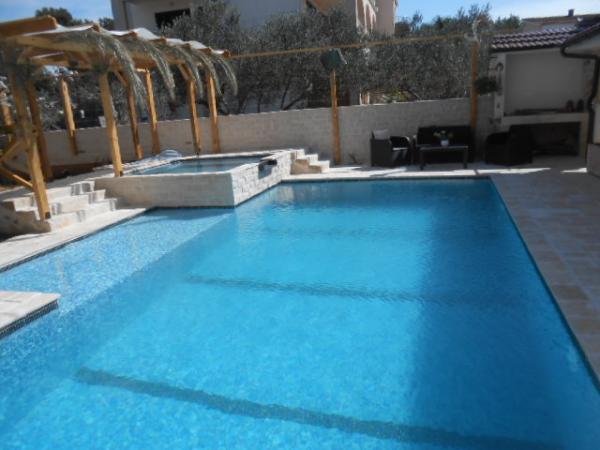 Das Haus für 10 Personen mit Swimmingpool und Whirlpool befindet sich in einer ruhigen Gegend von Brodarica, umgeben von viel Grün und Blumen. Die ersten beiden Wohnungen befinden sich im Erdgeschoss, eine ist 45 m2 und die andere 50 m2 groß. Jedes Apartment verfügt über ein Schlafzimmer mit Doppelbett, eine Küche, ein Schlafsofa, ein Badezimmer und eine Terrasse mit Tisch und Stühlen. Die dritte Wohnung ist 90 m2 groß, befindet sich im ersten Stock und verfügt über zwei große Doppelzimmer, ein großes Wohnzimmer, eine Küche, ein Badezimmer und eine 45 m2 große Terrasse mit Tisch und Stühlen. Es ist für eine etwas größere Familie und Freunde geeignet. Die Wohnung ist klimatisiert. Die vierte Wohnung ist luxuriös eingerichtet, ca. 100 m2, hat ein großes Wohnzimmer, eine voll ausgestattete Küche, ein großes Zimmer mit Fernseher und Klimaanlage, die Wohnung hat auch eine Sauna. Auf dem Dach befindet sich ein Whirlpool mit großer Terrasse. Jede Wohnung hat eine Klimaanlage und jedes Zimmer hat auch einen Fernseher. Der Pool wird geteilt. Das Haus ist 5-6 Gehminuten vom Meer entfernt. Neben dem Haus gibt es zwei weitere Apartments, eines ist 110 m2 groß und luxuriös eingerichtet, das andere 55 m2 groß.
