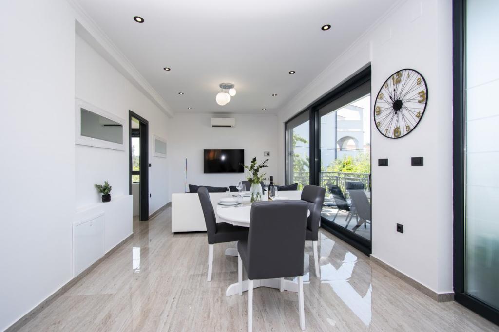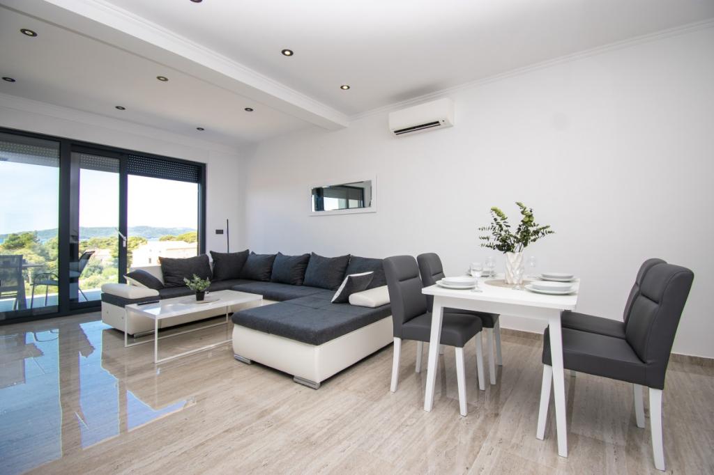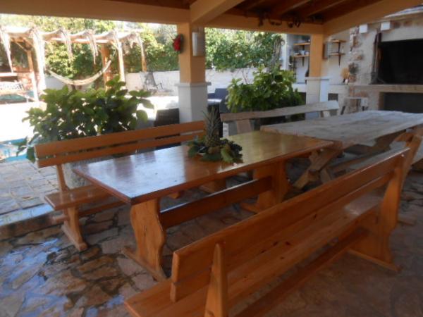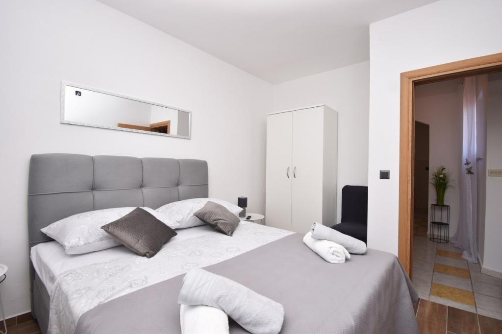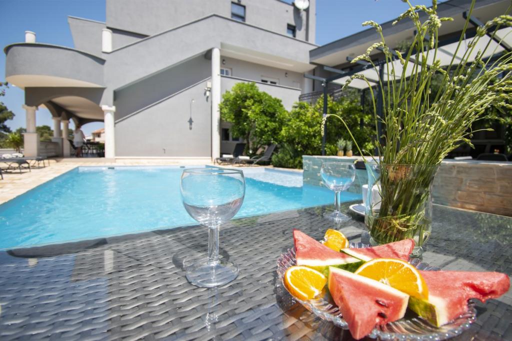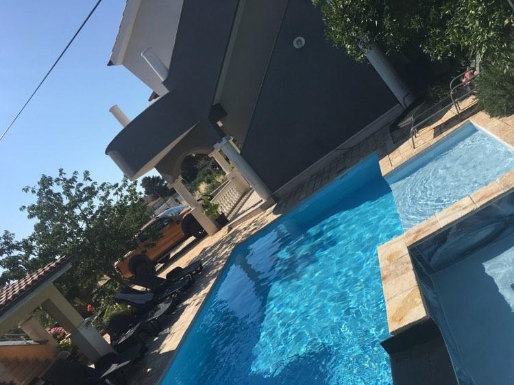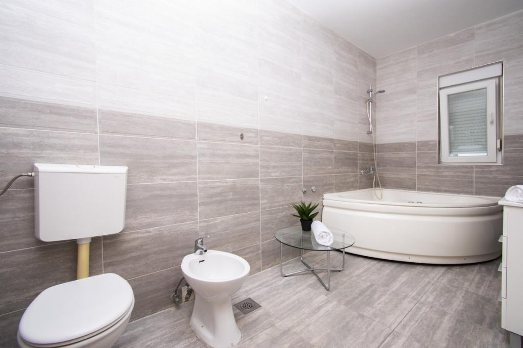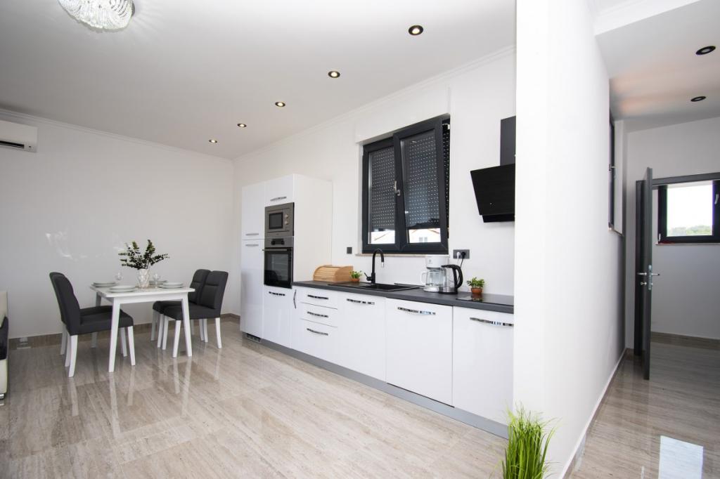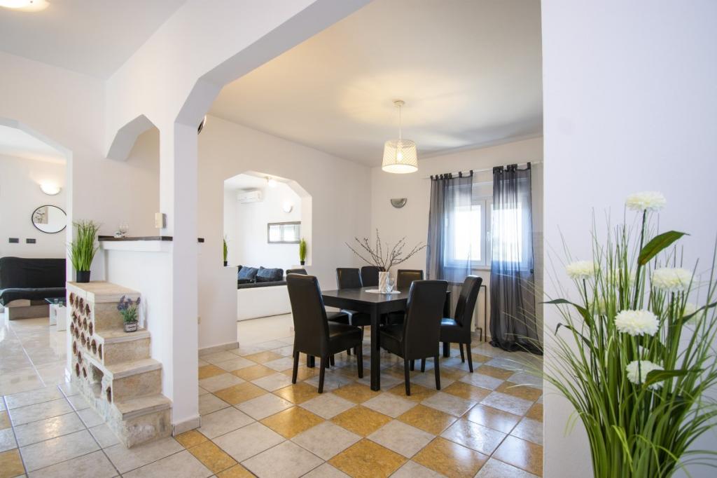 Das Haus für 10 Personen mit Swimmingpool und Whirlpool befindet sich in einer ruhigen Gegend von Brodarica, umgeben von viel Grün und Blumen. Die ersten beiden Wohnungen befinden sich im Erdgeschoss, eine ist 45 m2 und die andere 50 m2 groß. Jedes Apartment verfügt über ein Schlafzimmer mit Doppelbett, eine Küche, ein Schlafsofa, ein Badezimmer und eine Terrasse mit Tisch und Stühlen. Die dritte Wohnung ist 90 m2 groß, befindet sich im ersten Stock und verfügt über zwei große Doppelzimmer, ein großes Wohnzimmer, eine Küche, ein Badezimmer und eine 45 m2 große Terrasse mit Tisch und Stühlen. Es ist für eine etwas größere Familie und Freunde geeignet. Die Wohnung ist klimatisiert. Die vierte Wohnung ist luxuriös eingerichtet, ca. 100 m2, hat ein großes Wohnzimmer, eine voll ausgestattete Küche, ein großes Zimmer mit Fernseher und Klimaanlage, die Wohnung hat auch eine Sauna. Auf dem Dach befindet sich ein Whirlpool mit großer Terrasse. Jede Wohnung hat eine Klimaanlage und jedes Zimmer hat auch einen Fernseher. Der Pool wird geteilt. Das Haus ist 5-6 Gehminuten vom Meer entfernt. Neben dem Haus gibt es zwei weitere Apartments, eines ist 110 m2 groß und luxuriös eingerichtet, das andere 55 m2 groß.