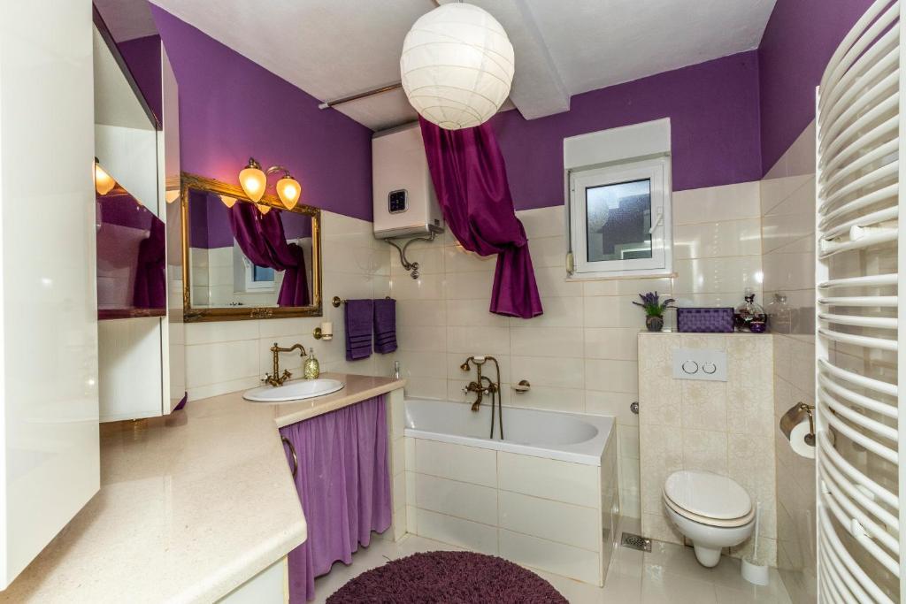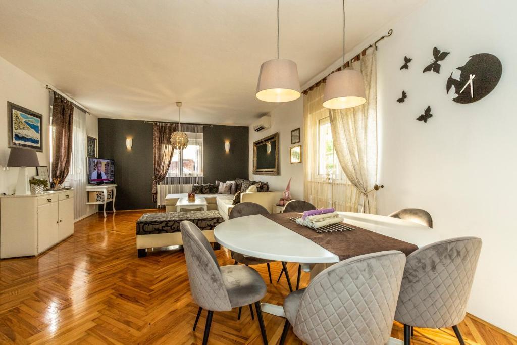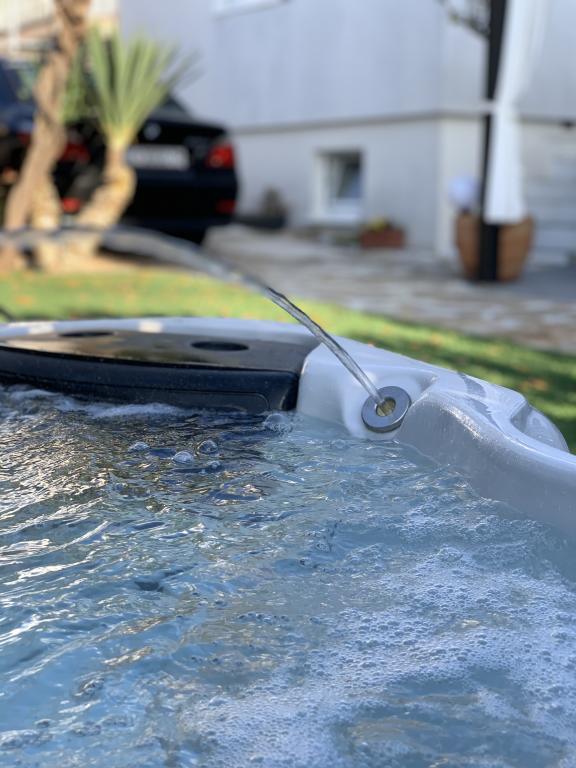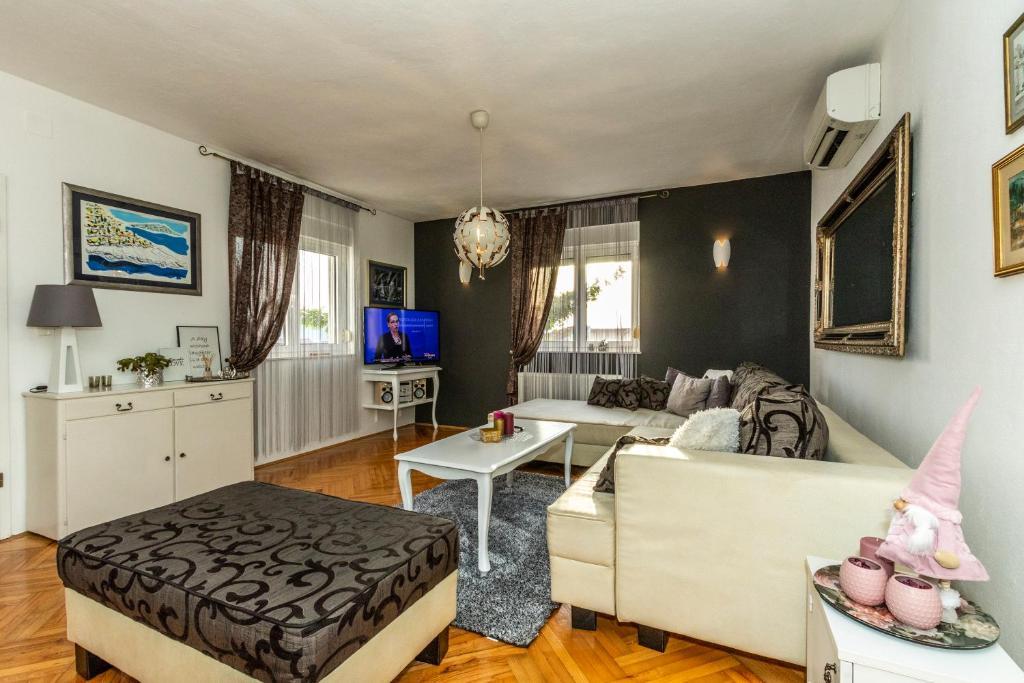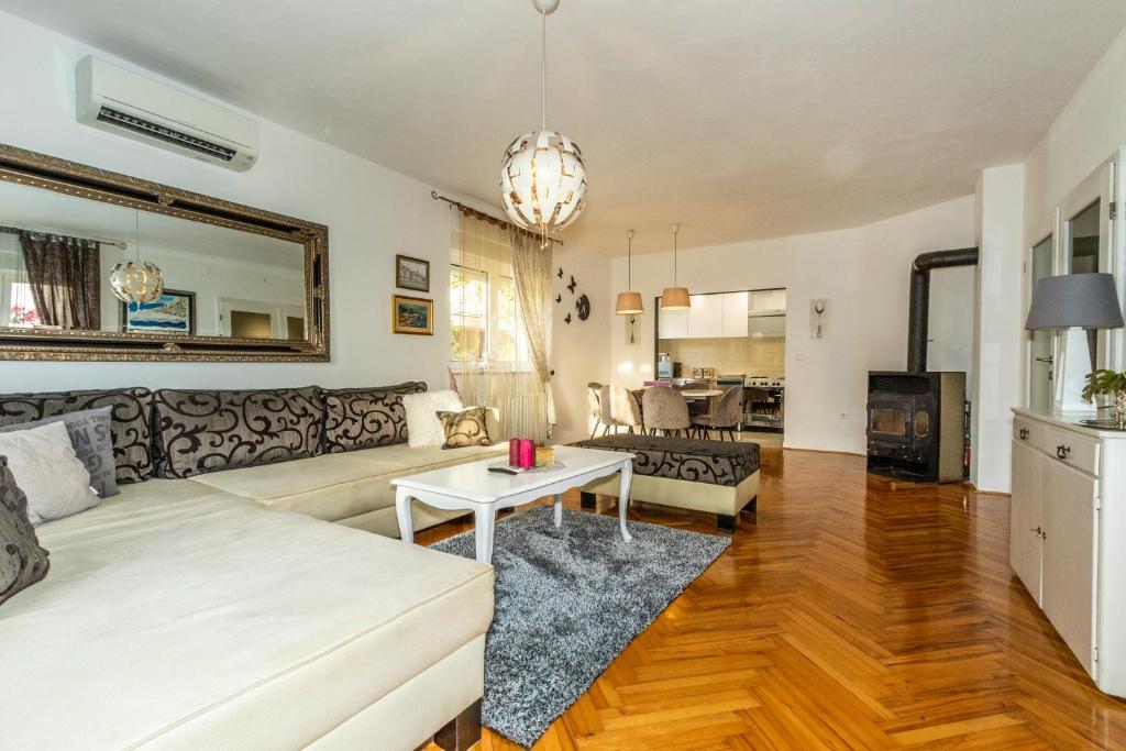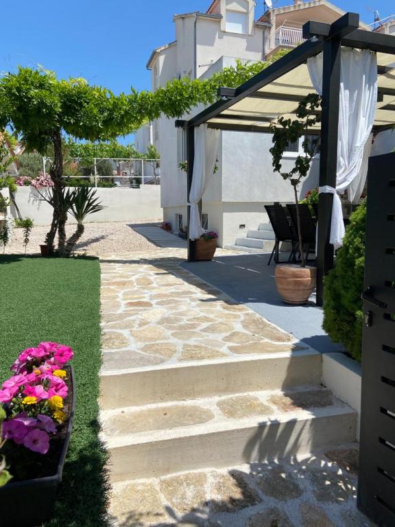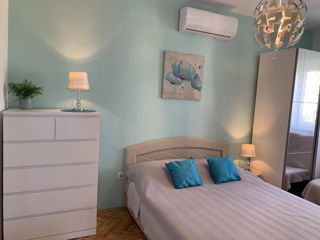 Modernes 85 m² großes Apartment im Erdgeschoss mit zwei Schlafzimmern – eines mit einem 180 cm breiten Doppelbett, das andere mit einem 160 cm breiten Doppelbett und einem Schlafsofa (für einen Erwachsenen oder zwei Kinder). Auf Wunsch kann ein Kinderbett bereitgestellt werden. Das geräumige Wohnzimmer bietet ein großes Schlafsofa für zwei weitere Personen, einen Essbereich, eine moderne Küche mit Geschirrspüler, Kühl-/Gefrierschrank, Backofen, Herd und allen notwendigen Küchengeräten und Geschirr. Ein großes Badezimmer mit Badewanne und Waschmaschine ist ebenfalls vorhanden. Vor dem Haus befindet sich eine Terrasse mit überdachtem Pavillon, Tisch und Stühlen, ein Whirlpool, Liegestühle und ein Grill im Garten. Zwei kostenlose Parkplätze stehen zur Verfügung. Kostenloses WLAN ist vorhanden. Wohnzimmer und beide Schlafzimmer sind klimatisiert. Der Strand ist 150 m entfernt. Ein Geschäft befindet sich 100 m vom Haus entfernt. Am Strand gibt es drei Strandbars/Cafés, eines davon mit einem schattigen Kinderspielplatz. Das Strandresort Solaris mit Strand, Restaurants, Wasserpark und Angeboten für Kinder und Erwachsene ist ca. 1 km vom Haus entfernt.