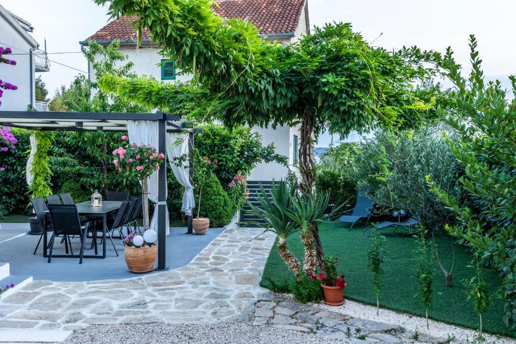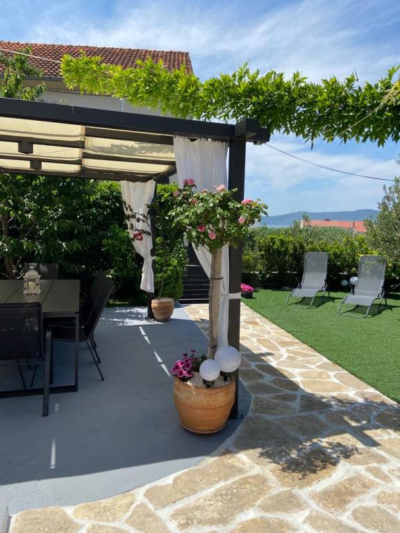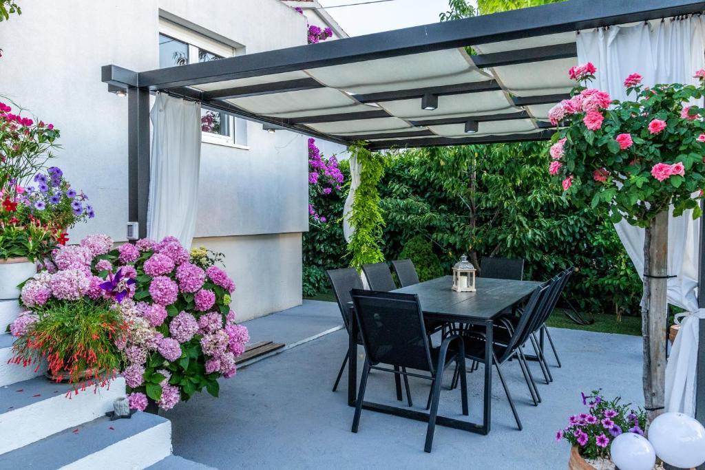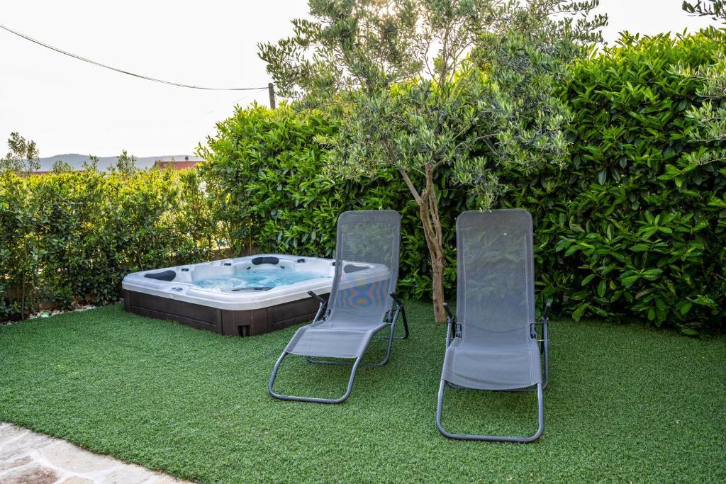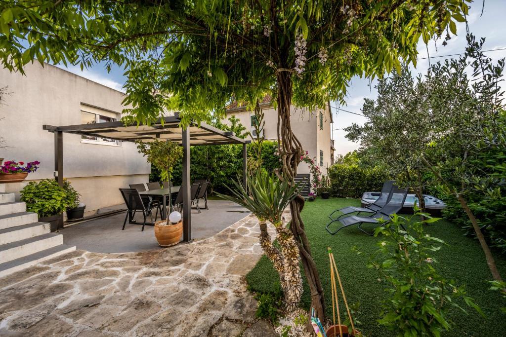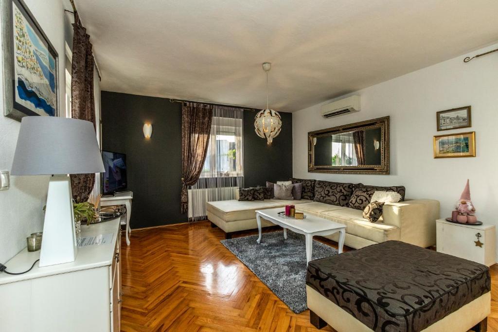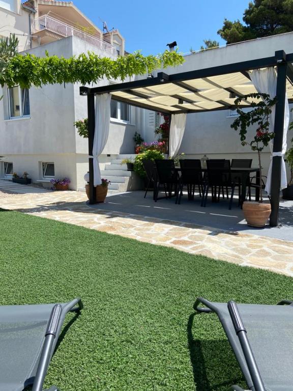 Modernes 85 m² großes Apartment im Erdgeschoss mit zwei Schlafzimmern – eines mit einem 180 cm breiten Doppelbett, das andere mit einem 160 cm breiten Doppelbett und einem Schlafsofa (für einen Erwachsenen oder zwei Kinder). Auf Wunsch kann ein Kinderbett bereitgestellt werden. Das geräumige Wohnzimmer bietet ein großes Schlafsofa für zwei weitere Personen, einen Essbereich, eine moderne Küche mit Geschirrspüler, Kühl-/Gefrierschrank, Backofen, Herd und allen notwendigen Küchengeräten und Geschirr. Ein großes Badezimmer mit Badewanne und Waschmaschine ist ebenfalls vorhanden. Vor dem Haus befindet sich eine Terrasse mit überdachtem Pavillon, Tisch und Stühlen, ein Whirlpool, Liegestühle und ein Grill im Garten. Zwei kostenlose Parkplätze stehen zur Verfügung. Kostenloses WLAN ist vorhanden. Wohnzimmer und beide Schlafzimmer sind klimatisiert. Der Strand ist 150 m entfernt. Ein Geschäft befindet sich 100 m vom Haus entfernt. Am Strand gibt es drei Strandbars/Cafés, eines davon mit einem schattigen Kinderspielplatz. Das Strandresort Solaris mit Strand, Restaurants, Wasserpark und Angeboten für Kinder und Erwachsene ist ca. 1 km vom Haus entfernt.