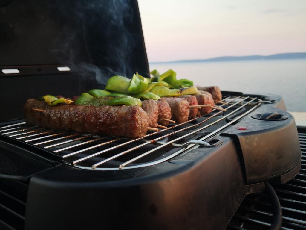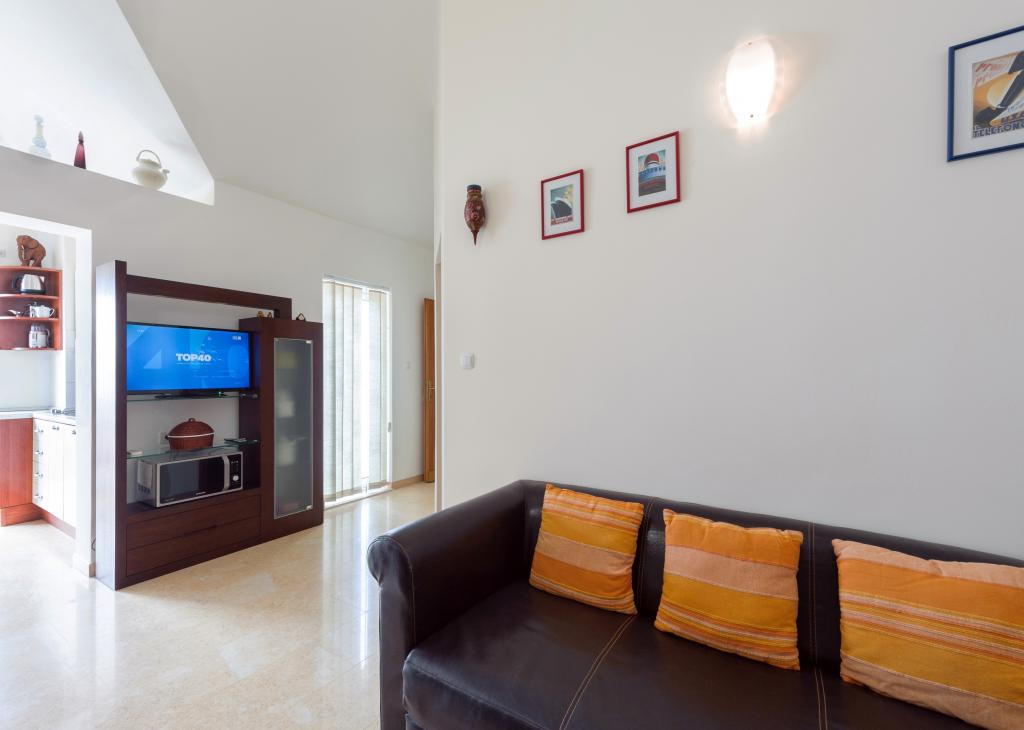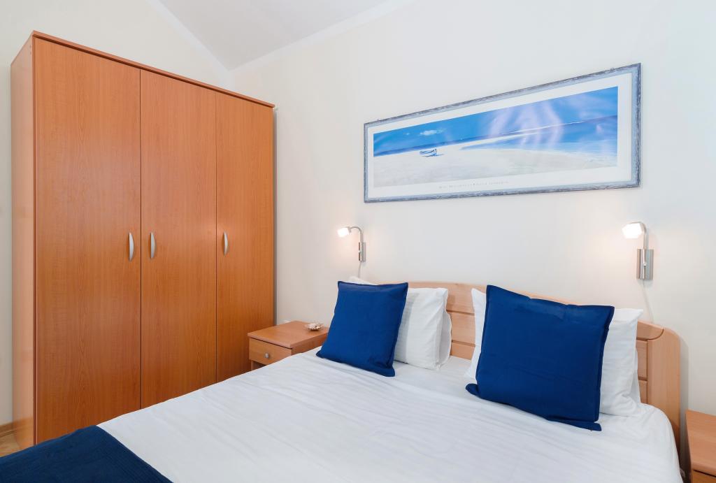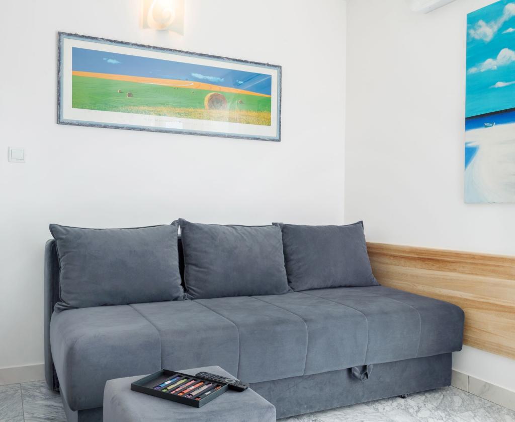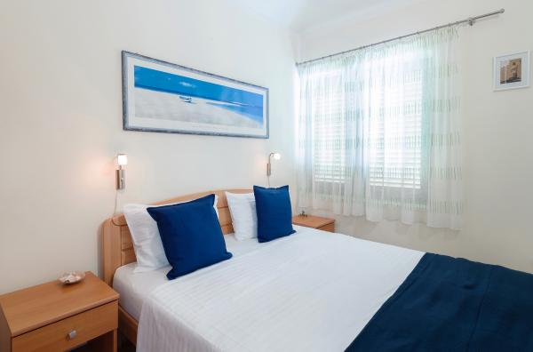 Wir waren zwei in einer Wohnung für maximal Personen, einem Schlafzimmer mit einem großen Bett und einem Wohnzimmer mit einer Küchenzeile, einem Schlafsofa und Zugang zu einem großen Balkon mit einem Tisch. Schöner Meerblick, schönes großes Wohnzimmer. Klimaanlage natürlich. Im Kühlschrank warteten kühle Getränke auf uns, in den Schränken hausgemachtes Olivenöl, Frittieröl, Mehl, Salz und Zucker, Weinessig und Pfeffer. Unten ein Steingrill mit einem Tisch daneben. Ausreichend Parkplätze, nahe am Meer und ein tolles Familienrestaurant (Preise niedriger als in der Stadt)