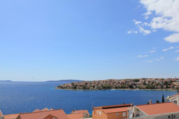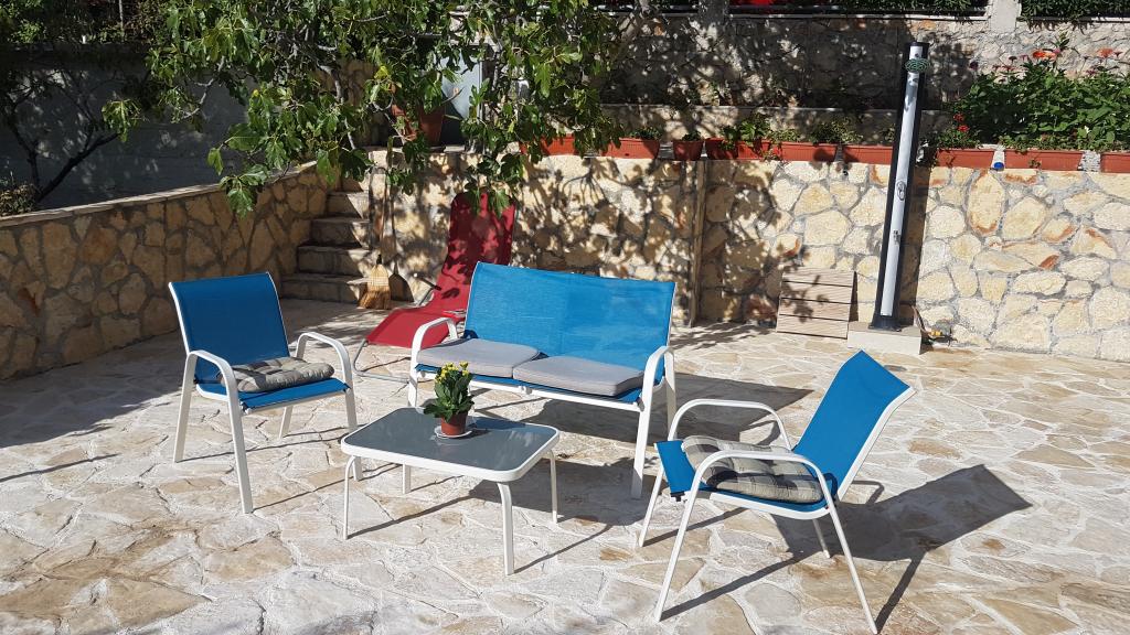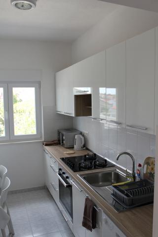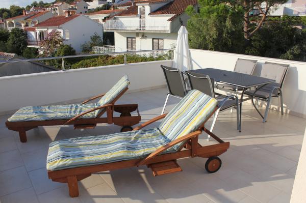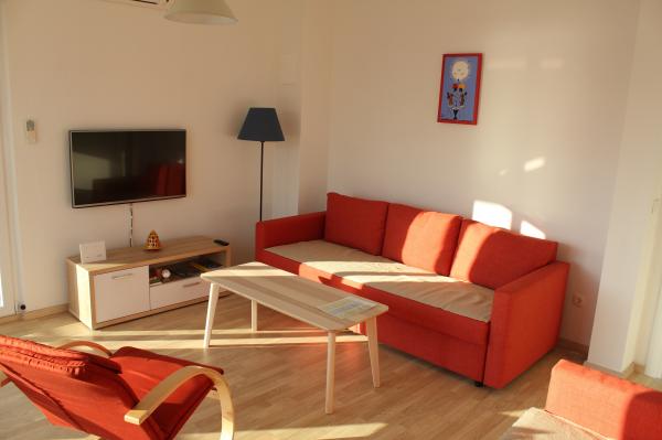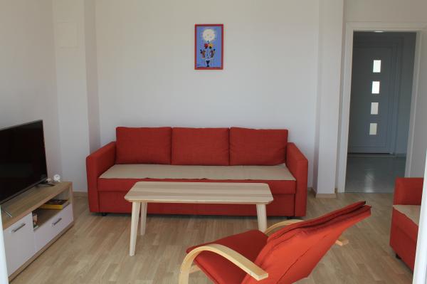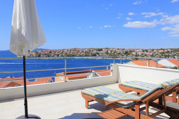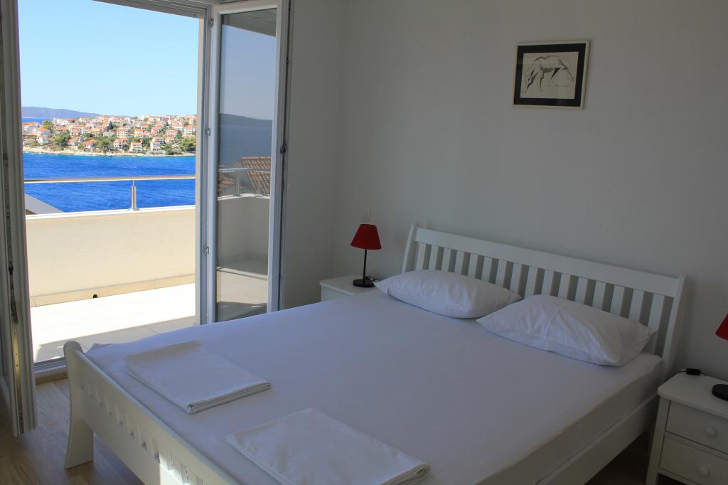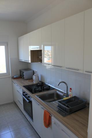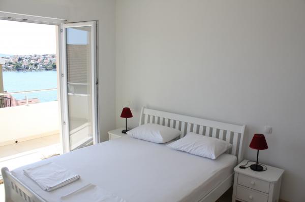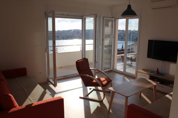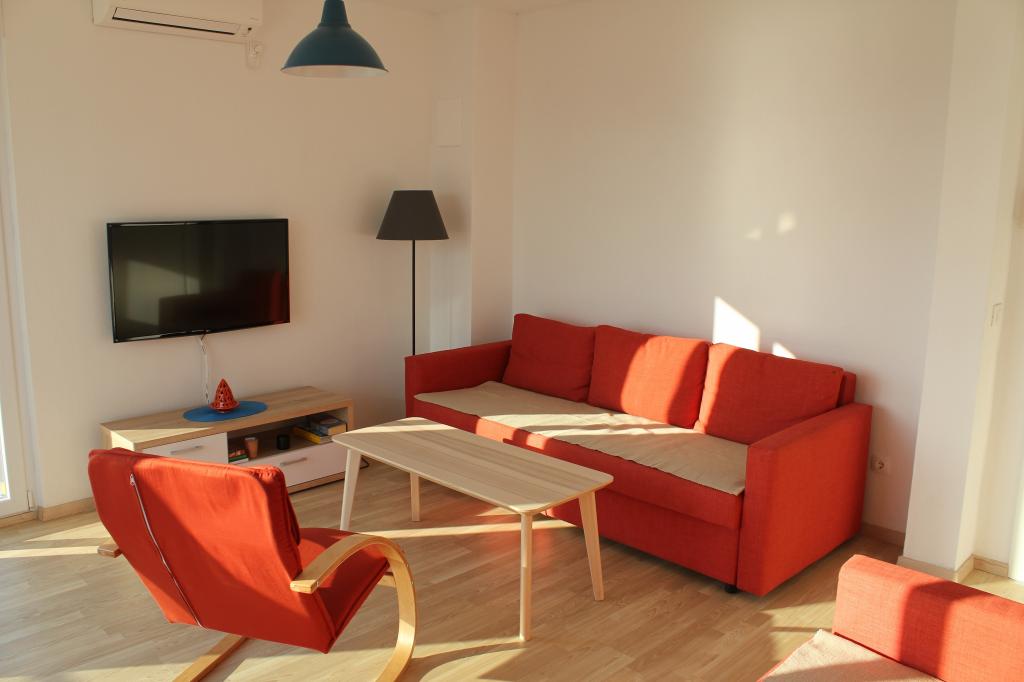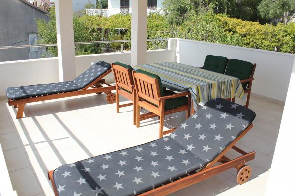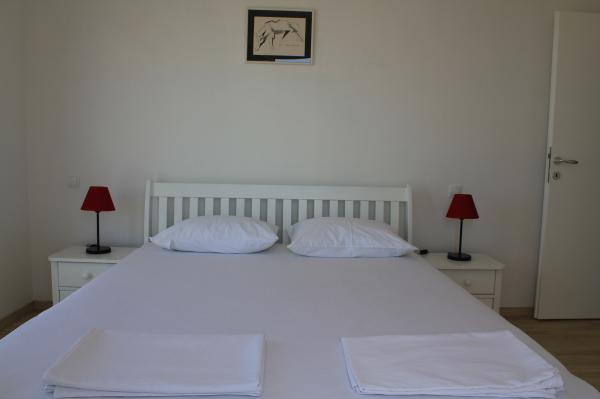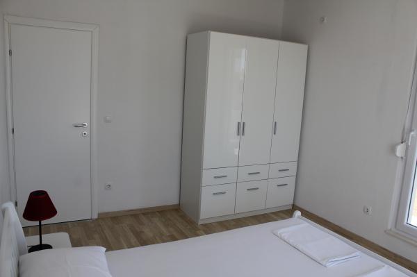 Die nach Süden ausgerichteten Apartments eignen sich sowohl für Einzelreisende als auch für Paare, kleinere Gruppen und Familien (4–5 Personen). Die Apartments wurden neu gebaut und sind mit modernen und hochwertigen Materialien und Geräten ausgestattet. Küche, Wohnzimmer, Schlafzimmer und Badezimmer sind vom Flur aus zugänglich. Die Apartments sind luftig und lichtdurchflutet in allen Räumen mit der Möglichkeit der Verdunkelung durch Jalousien. Der Innenraum (56 m²) wird durch eine zusätzliche 35 m² große Terrasse und einen Balkon ergänzt, die vom Wohnzimmer und Schlafzimmer aus zugänglich sind. Sie bieten einen wunderschönen Blick auf das 120 m entfernte Meer. Das Apartment ist mit einem 43-Zoll-Fernseher, WLAN, Geschirrspüler, Cerankochfeld und Backofen, Kühlschrank, Nespresso-Kaffeemaschine und Mikrowelle ausgestattet. Für einen angenehmen Schlaf sind die Betten mit Taschenfederkernmatratzen und den Maßen 160 x 200 cm sowie hochwertiger Bettwäsche ausgestattet. 2 Ausziehsofas (140 x 200 cm) im Wohnzimmer. Parkplatz. Waschmaschine.