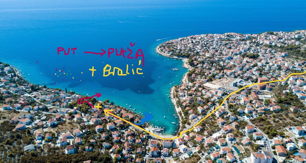 FAMILY APARTMENTS-Bralić liegen auf der Südseite von ČIOVA mit Blick auf die Insel ŠOLTA, in einer ruhigen Gegend der Bucht MAVARČICA. Das Haus liegt in der zweiten Reihe vom Meer entfernt, 30 m vom STRAND entfernt. ALLE Wohnungen haben einen separaten Eingang VOM HOF DES HAUSES. Jedes Apartment verfügt über ein Wohnzimmer, ein Ehezimmer und einen Balkon mit Meerblick. A1 und A2 haben (ein EHE-Zimmer und 2 weitere Zimmer mit 1 Bett. A3 und A4 haben ein EHE-ZIMMER, 2 Betten im WOHNZIMMER, das durch Harmo-Türen von der Küche getrennt ist, und eine Toilette-Dusche in der Nähe des EHE-Zimmers und ein WC. Dusche in der Nähe des WOHNZIMMERS. Das Apartment A3 verfügt über eine TERRASSE für GÄSTE bis zu 10 Personen. Sie gelangen über die NEUE Brücke nach MAVARČICA km auf der neuen Straße nach OKRUG GORNJI – Von der MAVARČICA-Café-Bar aus sehen Sie (rechts) die Straße KRALJA KREŠIMIRA und das Haus ist auf der linken Seite. DER STRAND IST STEIN, DEN WIR NICHT AKZEPTIEREN