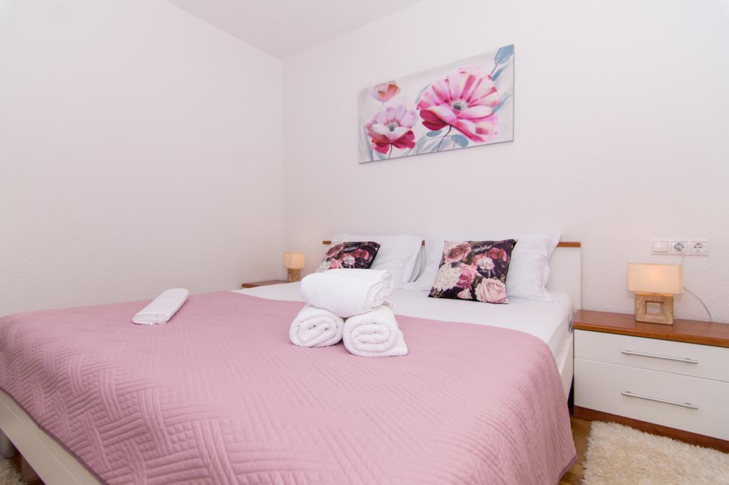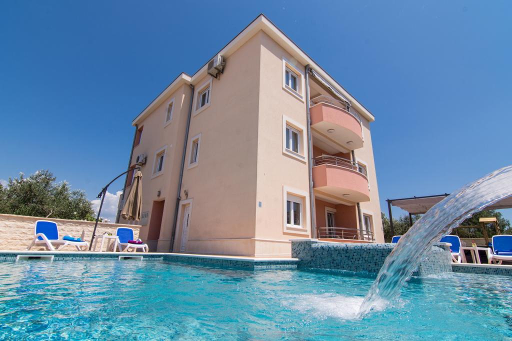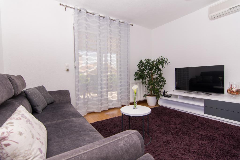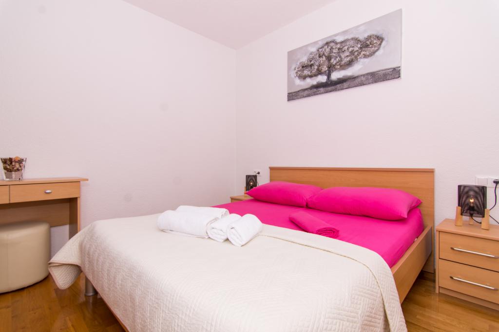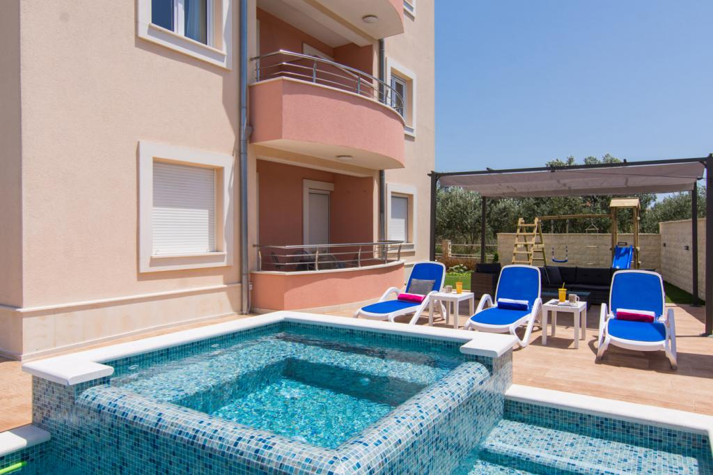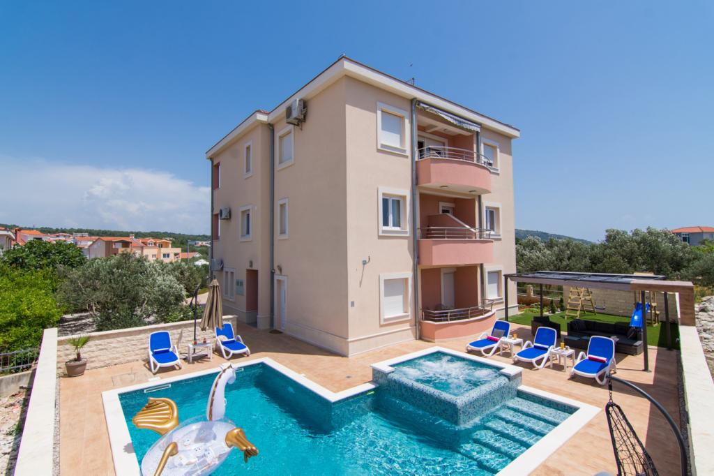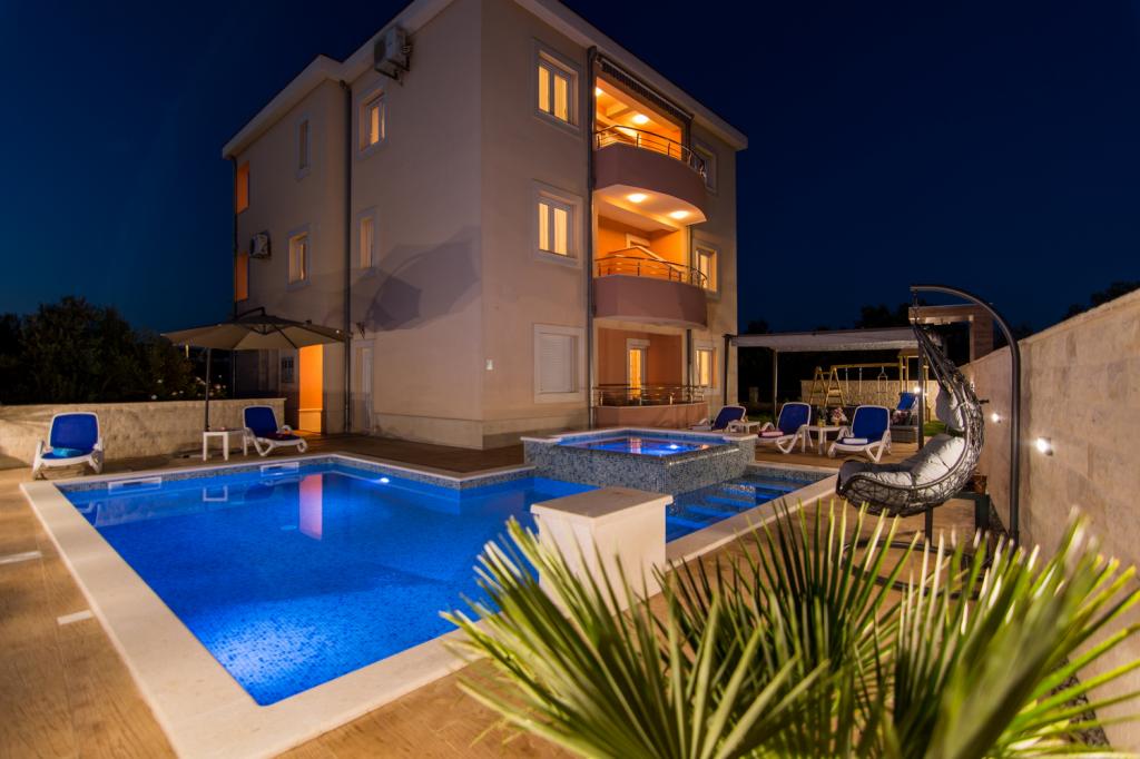 Die modern ausgestatteten und klimatisierten Apartments Villa Peky befinden sich in einem Familienhaus auf der Insel Čiovo in Okrug Gornji. Zwei A2 2-Apartments und ein 4 2-Apartment bieten Platz für bis zu 14 Personen. Vor dem Haus gibt es einen Parkplatz für Gäste. Auf der Rückseite des Hauses gibt es einen beheizten Swimmingpool mit Whirlpool, einen Kinderspielplatz und einen überdachten Außengrill mit großem Tisch. Das beliebteste Reiseziel in der Region Trogir ist Okrug Gornji auf der Insel Čiovo mit seinem wunderschönen Strand. Das alte Dorf Okrug liegt auf einem kleinen Hügel, an dessen Fuß sich ein Fischereihafen befindet, etwa 4 km vom Zentrum von Trogir oder 8 km vom Flughafen Split entfernt. Am Strand in Okrug Gornji können Sie einen Roller oder Jetski mieten, Parasailing und andere Aktivitäten auf See genießen. Im Sommer können Sie in Okrug auch den Schatten von Cafés oder Restaurants genießen, die neben anderen Gerichten auch dalmatinische Spezialitäten anbieten. Die Tauchschule Trogir Diving Center in Mavarčica führt Sie in die Schönheiten der Unterwasserwelt Mitteldalmatiens ein.