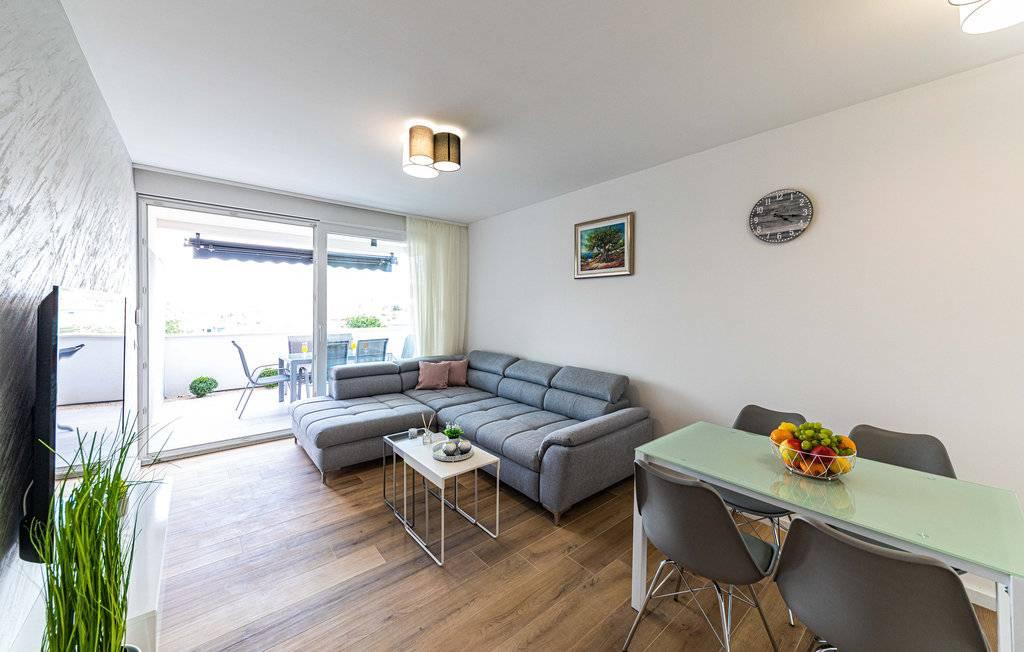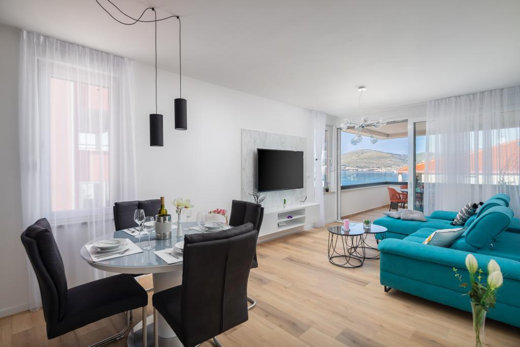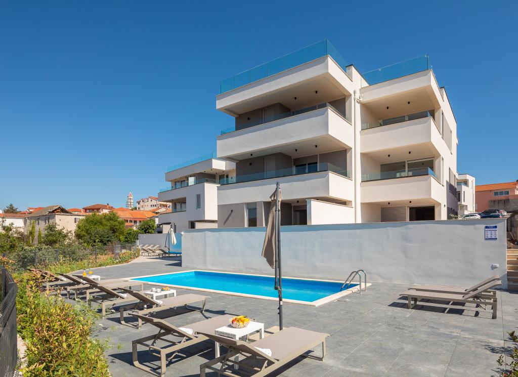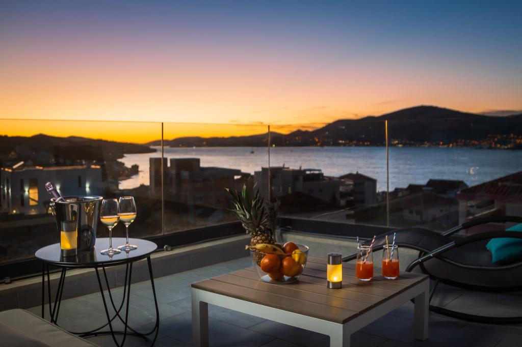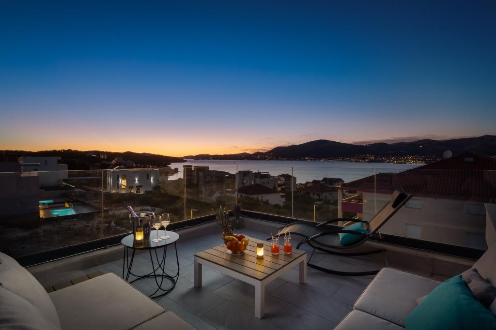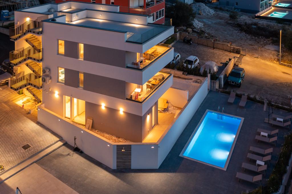 Dieses brandneue und moderne Apartment (Baujahr 2021) ist die perfekte Wahl für Gäste, die ein luxuriöses Strandapartment in Kroatien suchen. Es verfügt über einen privaten Pool exklusiv für die Gäste, drei sichere Parkplätze und liegt nur 250 Meter vom Strand entfernt (ca. 6 Gehminuten). Das Apartment befindet sich im 2. Stock und bietet höchsten Komfort und absolute Privatsphäre. Alle Fenster sind mit elektrischen Rollläden und Moskitonetzen ausgestattet, und jedes Zimmer verfügt über eine separate Klimaanlage – für einen angenehmen Aufenthalt das ganze Jahr über. Das Apartment bietet einen wunderschönen Panoramablick über die gesamte Bucht, der besonders abends beeindruckend ist. Den Gästen steht eine großzügige, 70 m² große private Terrasse zur Verfügung, ideal zum Entspannen und geselligen Beisammensein mit Familie und Freunden. Ein Grill mit kompletter Grillausrüstung sowie Sonnenliegen, Sonnenschirme, eine Außendusche und die gesamte Poolausstattung stehen Ihnen kostenfrei zur Verfügung. Das Gebäude und der Parkplatz sind videoüberwacht, und die Eingangstür ist einbruchsicher.