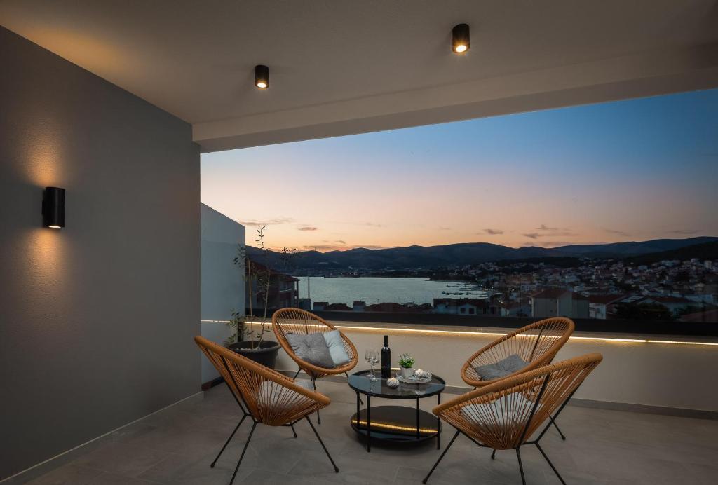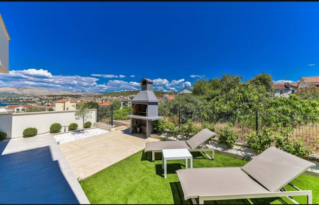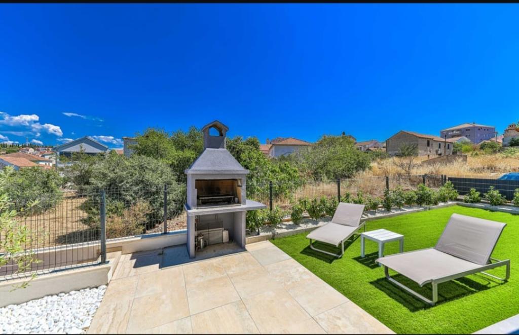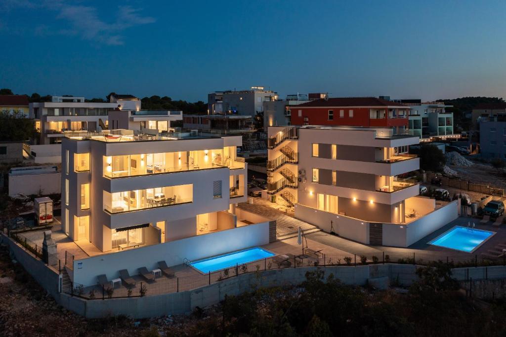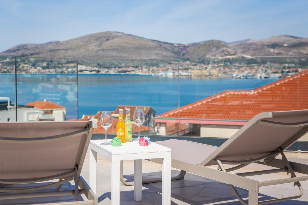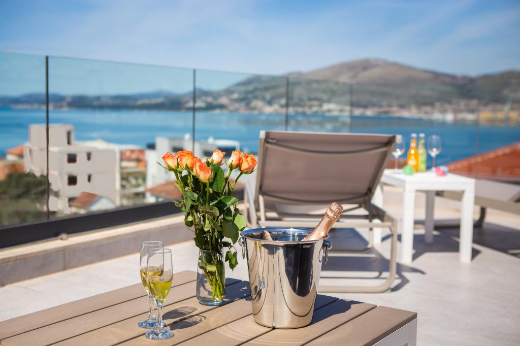 Dieses brandneue und moderne Apartment (Baujahr 2021) ist die perfekte Wahl für Gäste, die ein luxuriöses Strandapartment in Kroatien suchen. Es verfügt über einen privaten Pool exklusiv für die Gäste, drei sichere Parkplätze und liegt nur 250 Meter vom Strand entfernt (ca. 6 Gehminuten). Das Apartment befindet sich im 2. Stock und bietet höchsten Komfort und absolute Privatsphäre. Alle Fenster sind mit elektrischen Rollläden und Moskitonetzen ausgestattet, und jedes Zimmer verfügt über eine separate Klimaanlage – für einen angenehmen Aufenthalt das ganze Jahr über. Das Apartment bietet einen wunderschönen Panoramablick über die gesamte Bucht, der besonders abends beeindruckend ist. Den Gästen steht eine großzügige, 70 m² große private Terrasse zur Verfügung, ideal zum Entspannen und geselligen Beisammensein mit Familie und Freunden. Ein Grill mit kompletter Grillausrüstung sowie Sonnenliegen, Sonnenschirme, eine Außendusche und die gesamte Poolausstattung stehen Ihnen kostenfrei zur Verfügung. Das Gebäude und der Parkplatz sind videoüberwacht, und die Eingangstür ist einbruchsicher.
