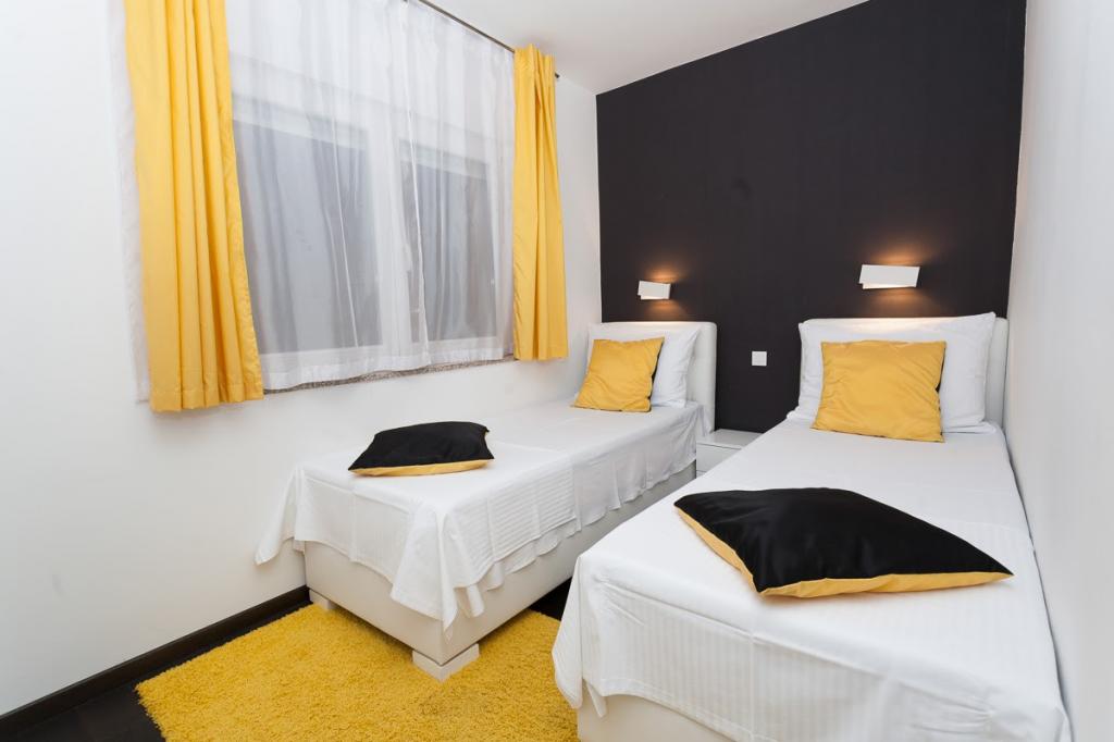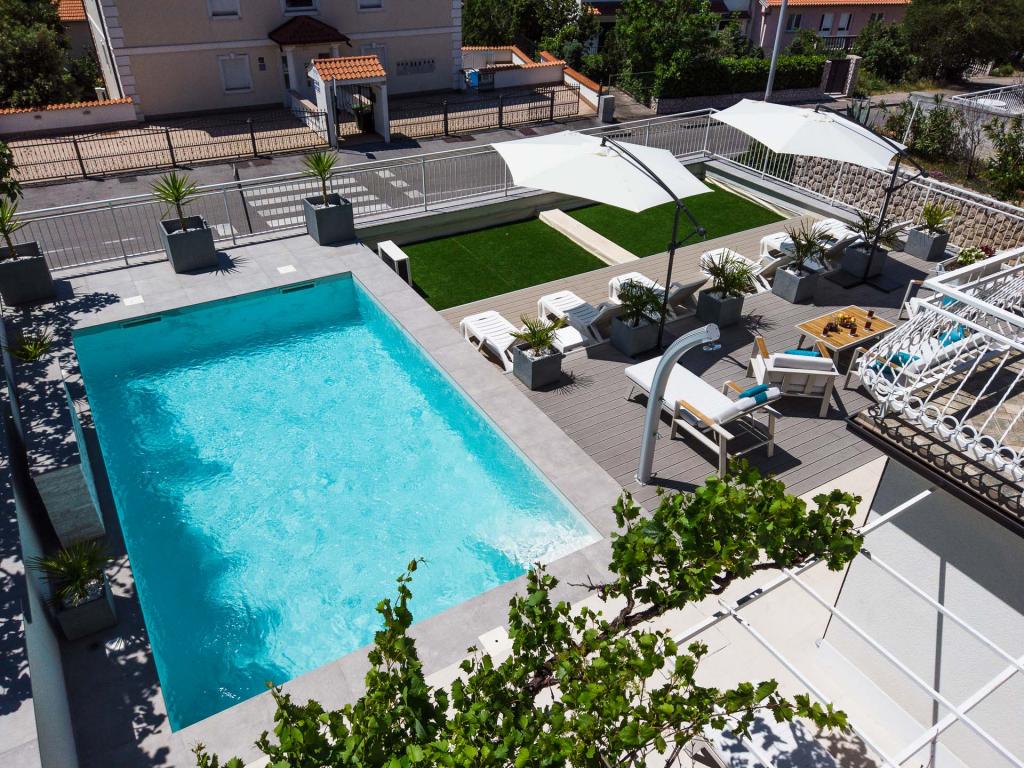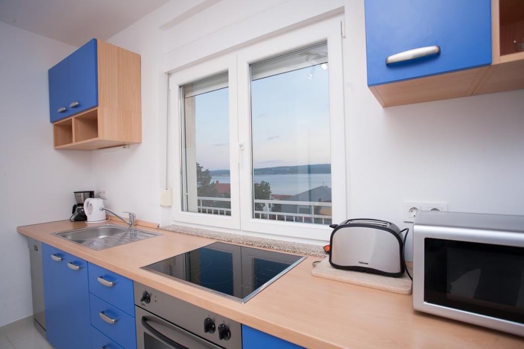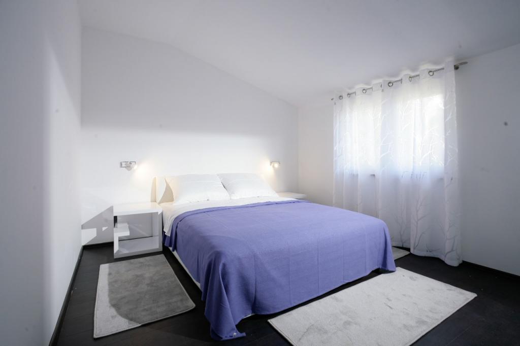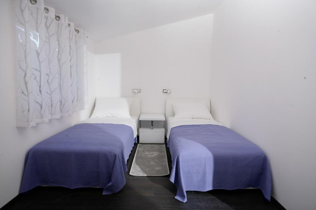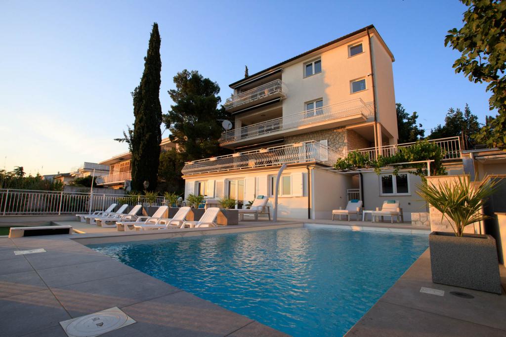 Modern ausgestattete, luxuriöse Apartments mit 4 Sternen, Klimaanlage und kostenlosem Internet. Mögliche Unterbringung einer weiteren Person auf einem Zustellbett (15 €/Tag). Haustiere erlaubt (10 €/Tag). Nutzung einer Waschmaschine (7 Euro pro Waschgang). Die Apartments bestehen aus zwei Schlafzimmern, Wohnzimmer, Küche, Badezimmer mit Toilette und einer weiteren separaten Toilette. Auf der Südseite des Hauses verfügt jede Wohnung über eine Terrasse mit Blick auf das Meer und den Pool. Der Pool ist umweltfreundlich, das heißt, er riecht weder Chlor noch reizt er Augen oder Haut. Sehr sicher für die Gesundheit von Kindern. Jede Wohnung verfügt über einen eigenen Parkplatz, der 24 Stunden am Tag videoüberwacht ist. Im Erdgeschoss des Hauses befindet sich ein Shop mit Speisen und Getränken. Der nächste Strand ist 4 Gehminuten entfernt. Die Anlage liegt 20 Gehminuten vom Stadtzentrum entfernt, es besteht die Möglichkeit der Beförderung mit dem Touristenzug, dessen Haltestelle sich vor dem Haus befindet.