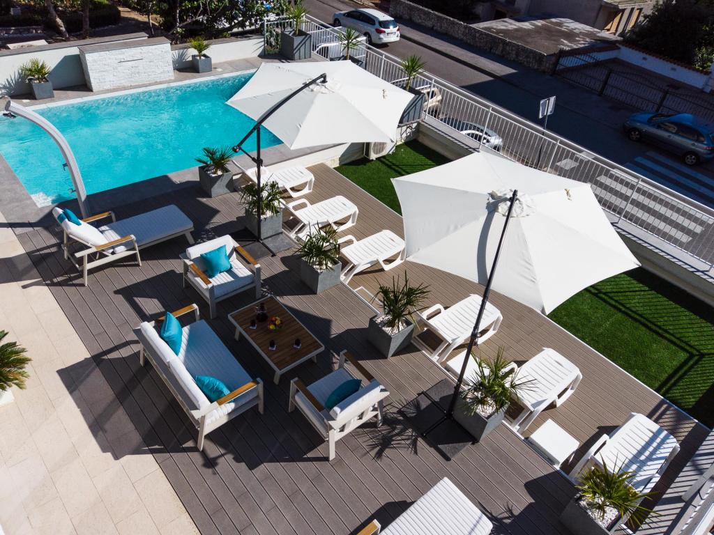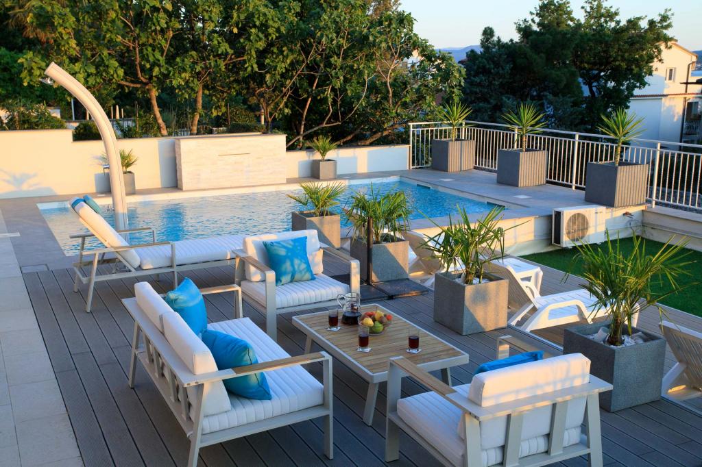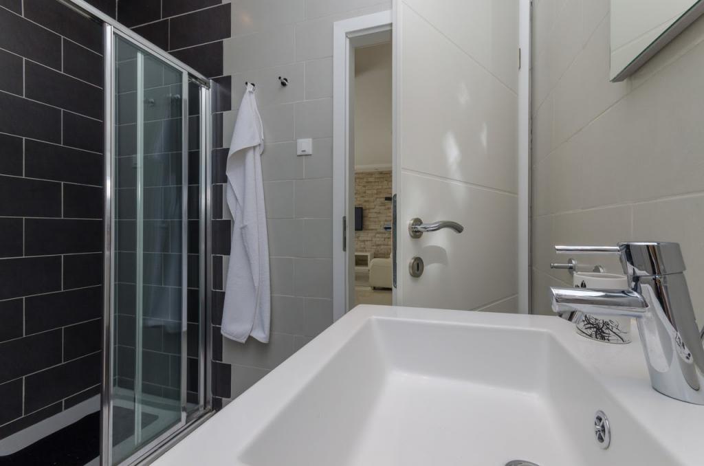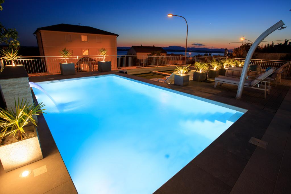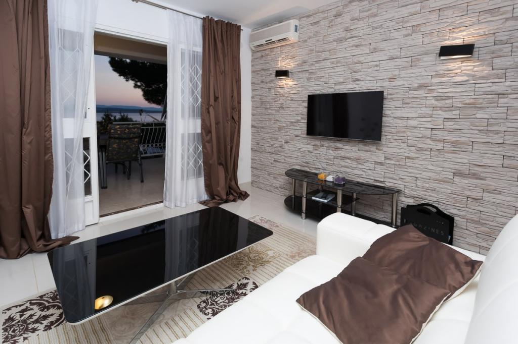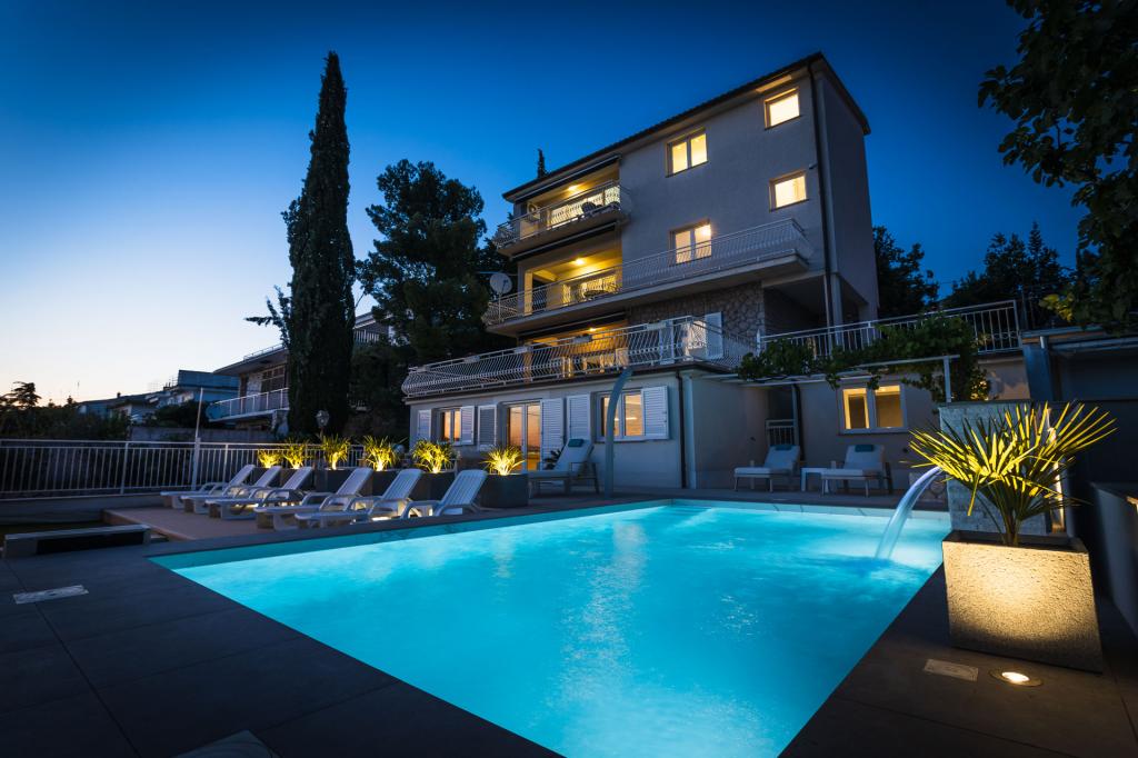 Modern ausgestattete, luxuriöse Apartments mit 4 Sternen, Klimaanlage und kostenlosem Internet. Mögliche Unterbringung einer weiteren Person auf einem Zustellbett (15 €/Tag). Haustiere erlaubt (10 €/Tag). Nutzung einer Waschmaschine (7 Euro pro Waschgang). Die Apartments bestehen aus zwei Schlafzimmern, Wohnzimmer, Küche, Badezimmer mit Toilette und einer weiteren separaten Toilette. Auf der Südseite des Hauses verfügt jede Wohnung über eine Terrasse mit Blick auf das Meer und den Pool. Der Pool ist umweltfreundlich, das heißt, er riecht weder Chlor noch reizt er Augen oder Haut. Sehr sicher für die Gesundheit von Kindern. Jede Wohnung verfügt über einen eigenen Parkplatz, der 24 Stunden am Tag videoüberwacht ist. Im Erdgeschoss des Hauses befindet sich ein Shop mit Speisen und Getränken. Der nächste Strand ist 4 Gehminuten entfernt. Die Anlage liegt 20 Gehminuten vom Stadtzentrum entfernt, es besteht die Möglichkeit der Beförderung mit dem Touristenzug, dessen Haltestelle sich vor dem Haus befindet.