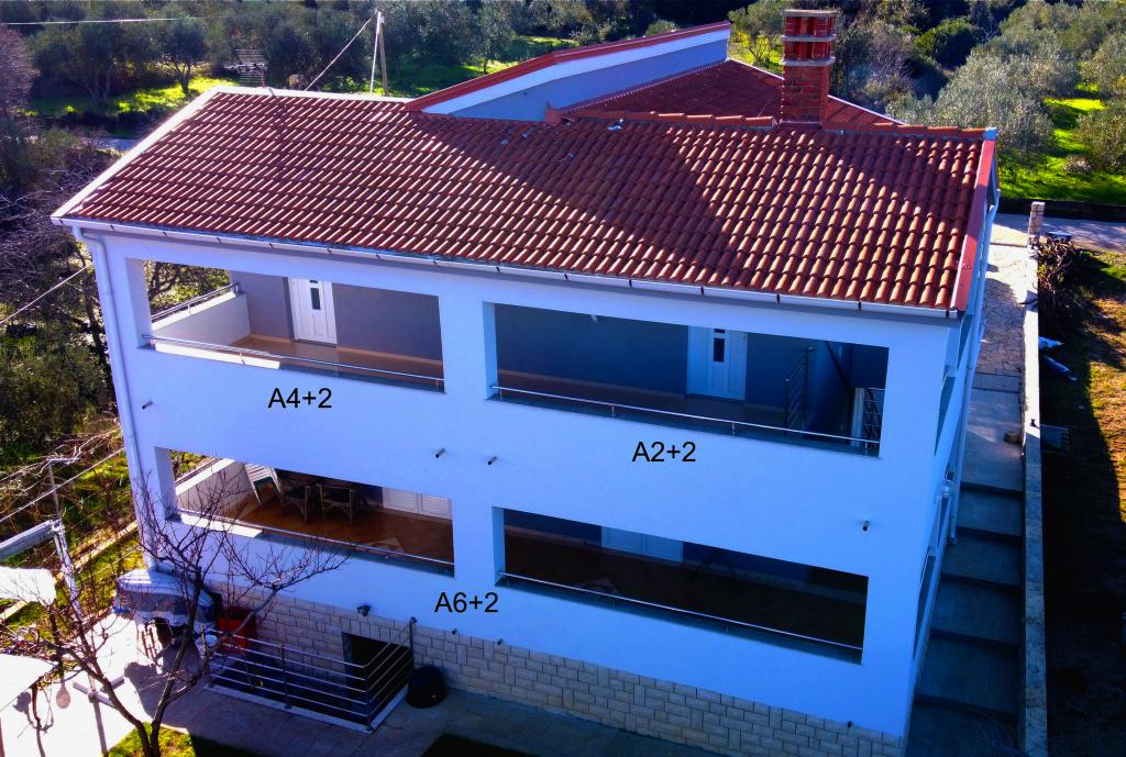 Das Gebäude verfügt über drei Apartments. Das größte Apartment (A6+1) erstreckt sich über das gesamte Erdgeschoss (ca. 90 m²) und bietet eine 30 m² große Terrasse. Im ersten Stock befinden sich die Apartments A4+1 und A2+1 mit jeweils ca. 45 m² Wohnfläche und einer gemeinsamen 30 m² großen Terrasse. Die Terrassen bieten Meerblick. Die Apartments sind komplett ausgestattet und klimatisiert. Das Gebäude liegt 50 m vom Meer entfernt in einer ruhigen und ruhigen Gegend. Der Strandabschnitt vor dem Apartment ist betoniert und zur Hälfte beschattet. Vor dem Gebäude befindet sich ein Parkplatz. Ein großer Grillplatz mit Tisch und Bänken steht den Gästen kostenlos zur Verfügung. Der Ort Dobropoljana ist 200 m entfernt. Das Stadtzentrum erreichen Sie in 5 Gehminuten. Dort finden Sie zwei Geschäfte, einen großen, gepflegten Sandstrand, ein erstklassiges Restaurant und einen kleinen Bootshafen. Vor dem Gebäude gibt es außerdem Platz zum Anlegen eines Bootes, und in Dobropoljana kann das Boot mit einem Anhänger ins Meer gelassen oder wieder herausgeholt werden.