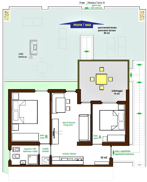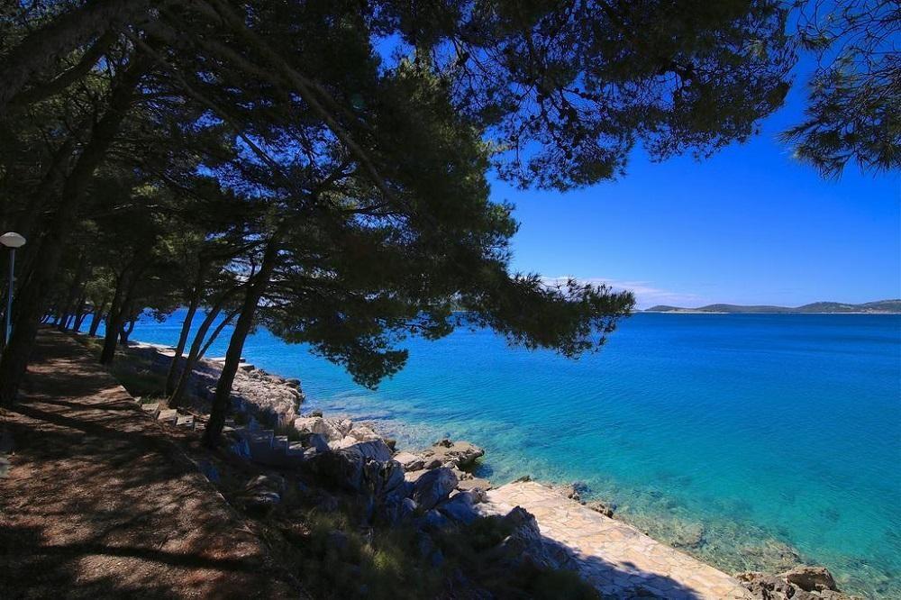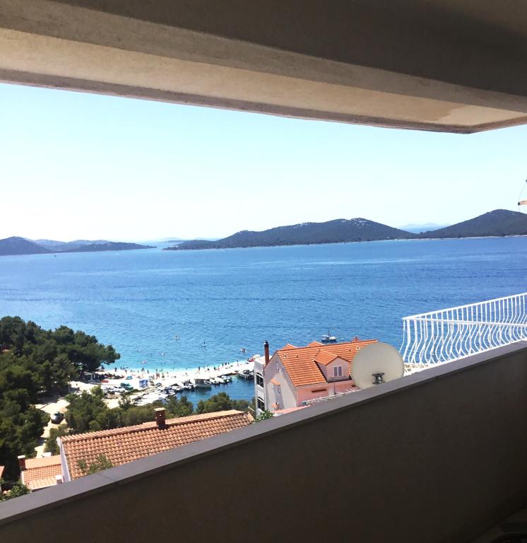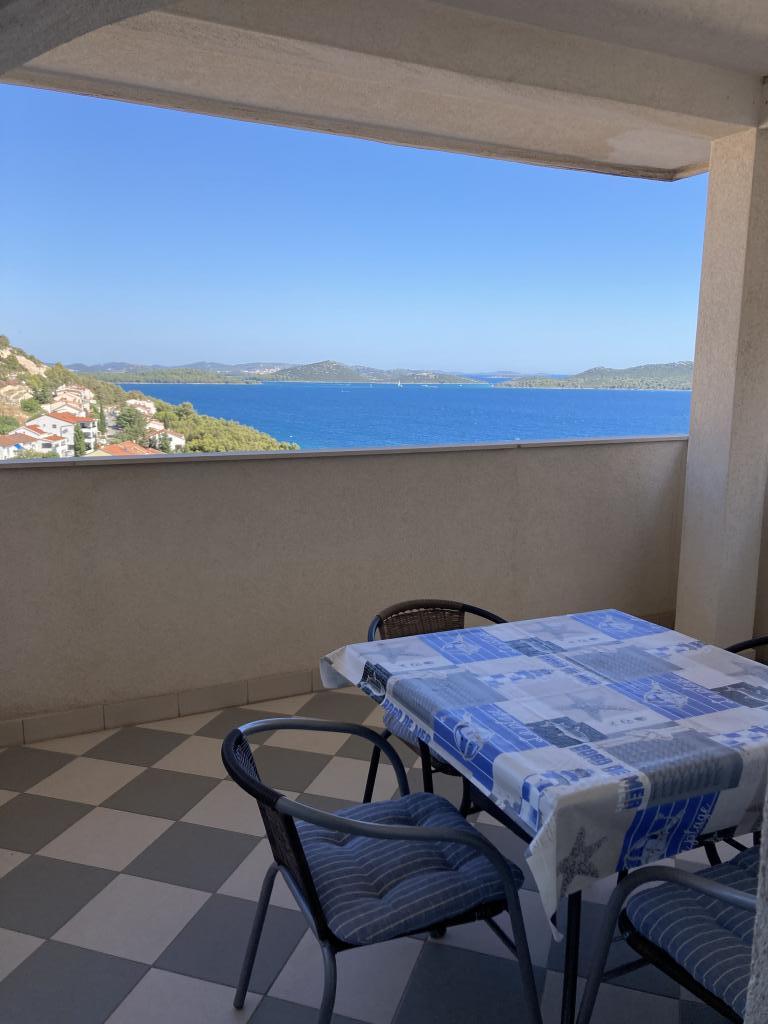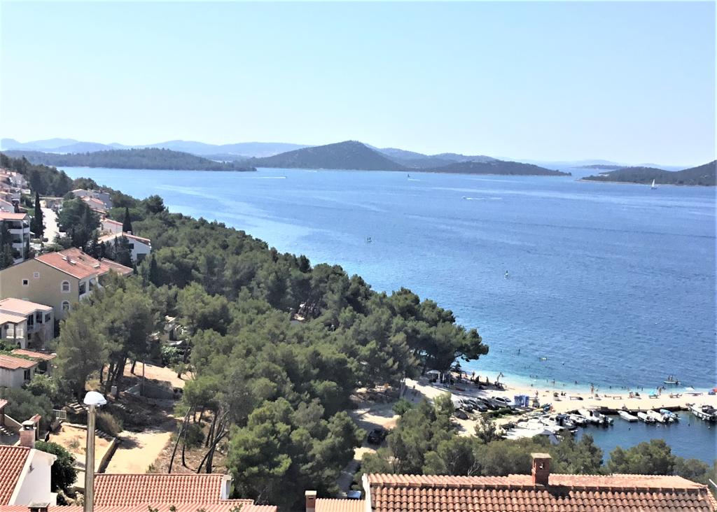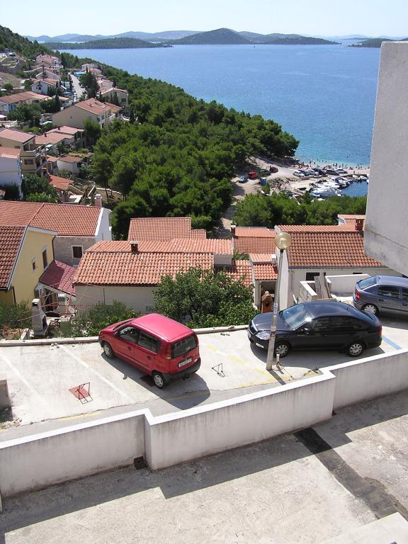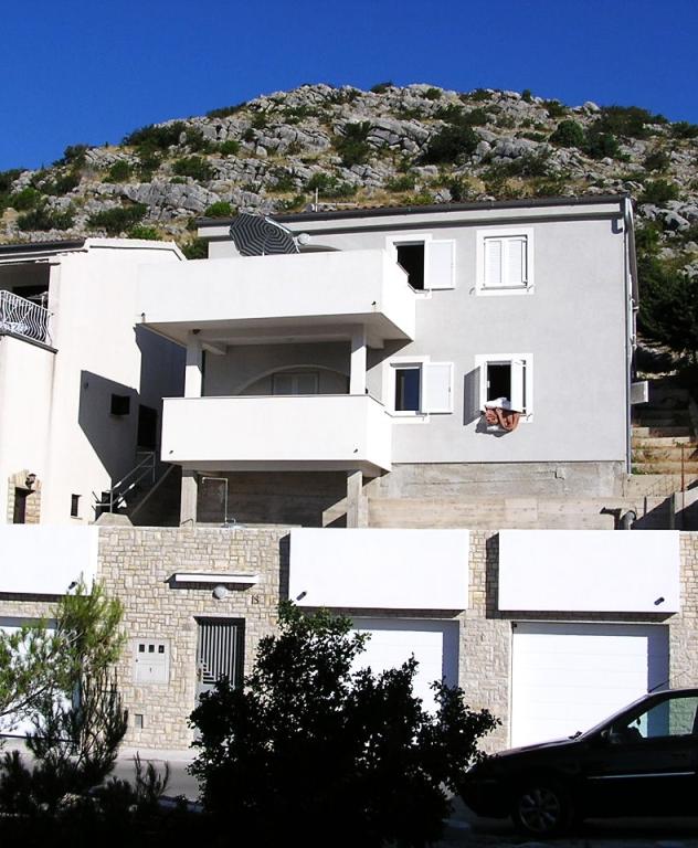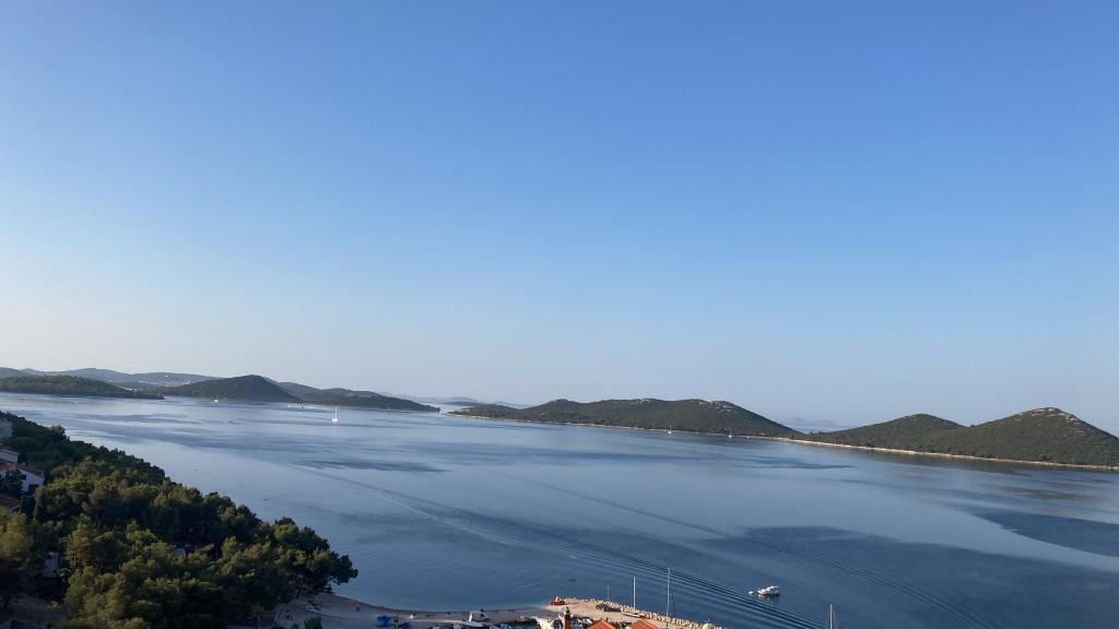 Das Anwesen befindet sich in der dritten Reihe des Feriendorfes Dolaška draga, einem Ortsteil von Drage, ca. 100 m Luftlinie vom Meer und den Stränden entfernt, die sich entlang des Feriendorfes bis zum dichten Kiefernwald und der Promenade erstrecken. Dank der erhöhten Lage des Anwesens (ca. 50 m über dem Meeresspiegel) bieten alle Apartments und Terrassen einen wunderschönen Panoramablick auf das Feriendorf, den Hafen, die umliegenden Strände, die nahegelegenen Inseln sowie die Stadt Murter und die Kornati-Inseln in der Ferne. Die Entfernung zum Meer (Strände umgeben von dichten Kiefernwäldern und einer Promenade) beträgt ca. 300 m über die Zufahrtsstraße durch das Feriendorf Dolaška draga; zu Fuß entlang der Straße ca. 10 Minuten oder mit dem Auto 2 Minuten. Das Meer ist zu Fuß in nur 5 Minuten erreichbar, wenn man ein kurzes Stück der Zufahrtsstraße und eine der Treppen im Wochenenddorf benutzt, das speziell für den Zugang zum Meer, Strand, zur Promenade, zum Pinienwald, zum Hafen, zum Café usw. angelegt wurde. Die Anlage verfügt über zwei Apartments (im 2. und 3. Stock), von denen nur das Apartment im 2. Stock vermietet wird. Die Gastgeber (2–4 Personen) wohnen im Sommer im Apartment im 3. Stock und stehen den Gästen daher täglich zur Verfügung, ohne deren Ruhe und Privatsphäre zu stören. Gästen steht ein Pkw-Stellplatz in der Garage der Anlage zur Verfügung. Auf der 80 m² großen Panoramaterrasse über der Garage (1. Stock) können sie die vorhandenen Geräte (Grill, Gartentisch mit 4 Stühlen und 2 Liegestühle) uneingeschränkt nutzen.