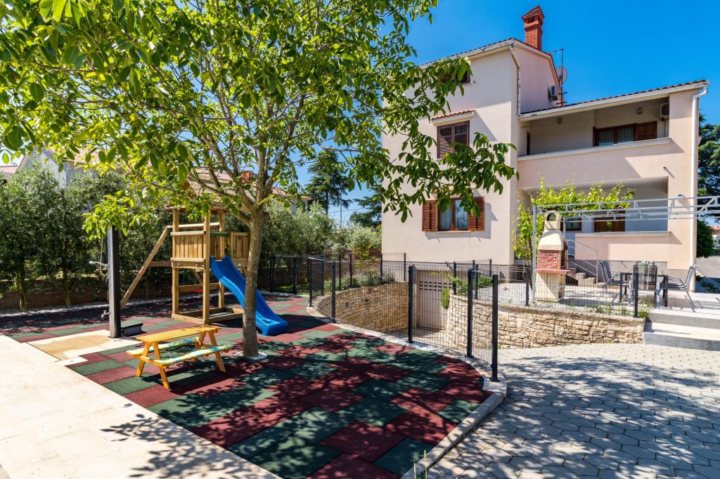 Voll ausgestattetes Apartment für 8 Personen, mit drei Schlafzimmern und eigenem Bad, nur 800 m vom Strand entfernt. Ein privater Swimmingpool mit Salzwasser, ein Kinderspielplatz und ein Grill werden Ihren Urlaub unvergesslich machen. Jedes Schlafzimmer verfügt über einen eigenen Sat-TV, Klimaanlage und Heizung, die Küche ist komplett ausgestattet, Parkplätze und kostenfreies WLAN sind ebenfalls vorhanden. Die Wohnung liegt zwischen dem kleinen Fischerdorf Fažana und dem antiken Pula, in der Nähe des Nationalparks Brijuni.
