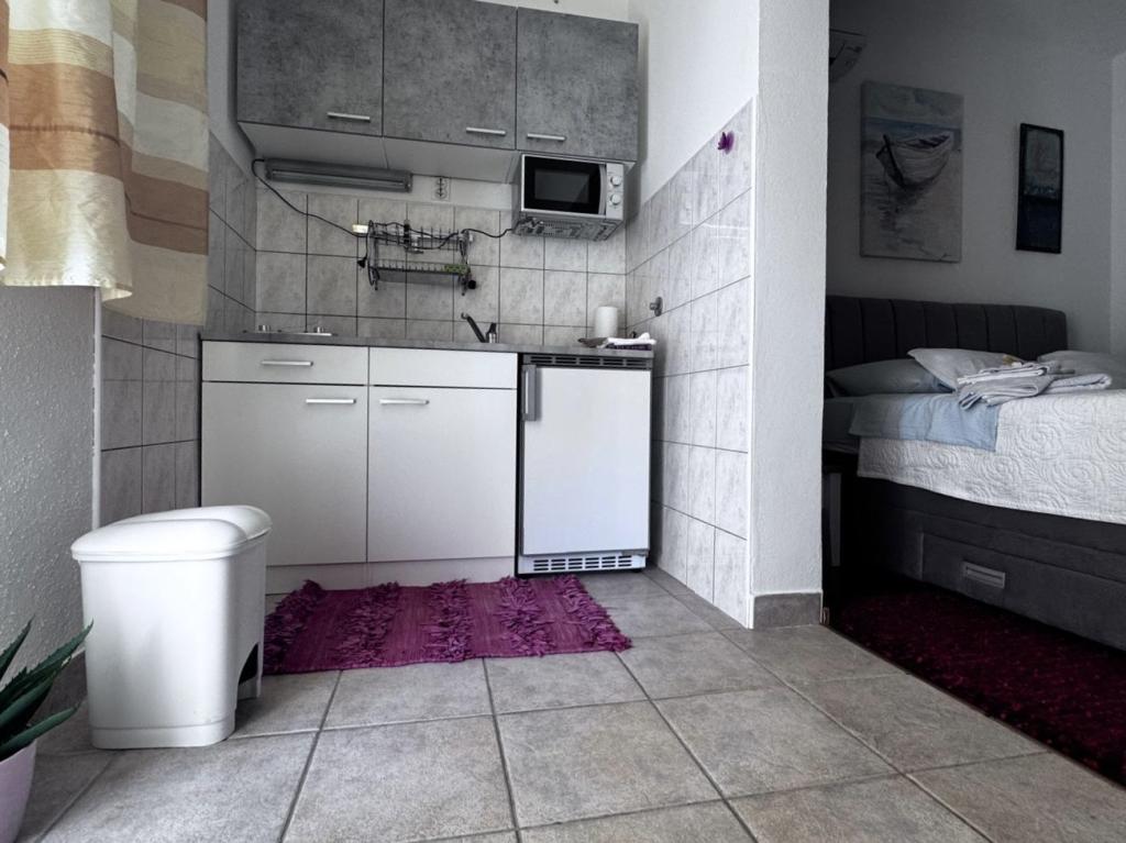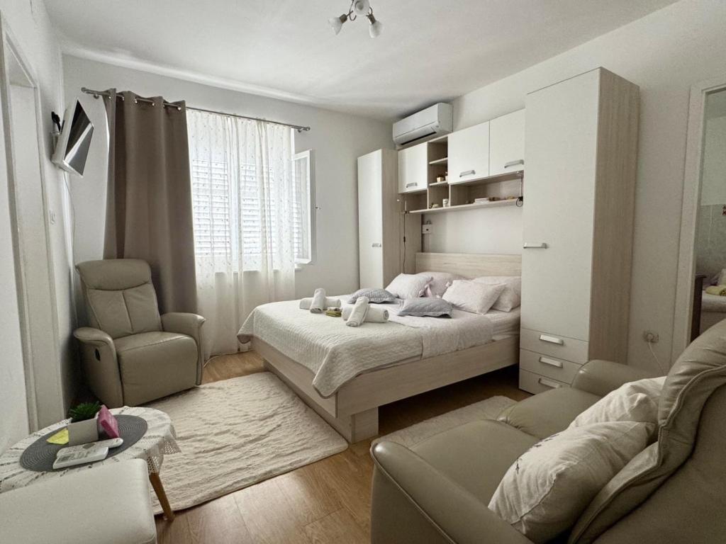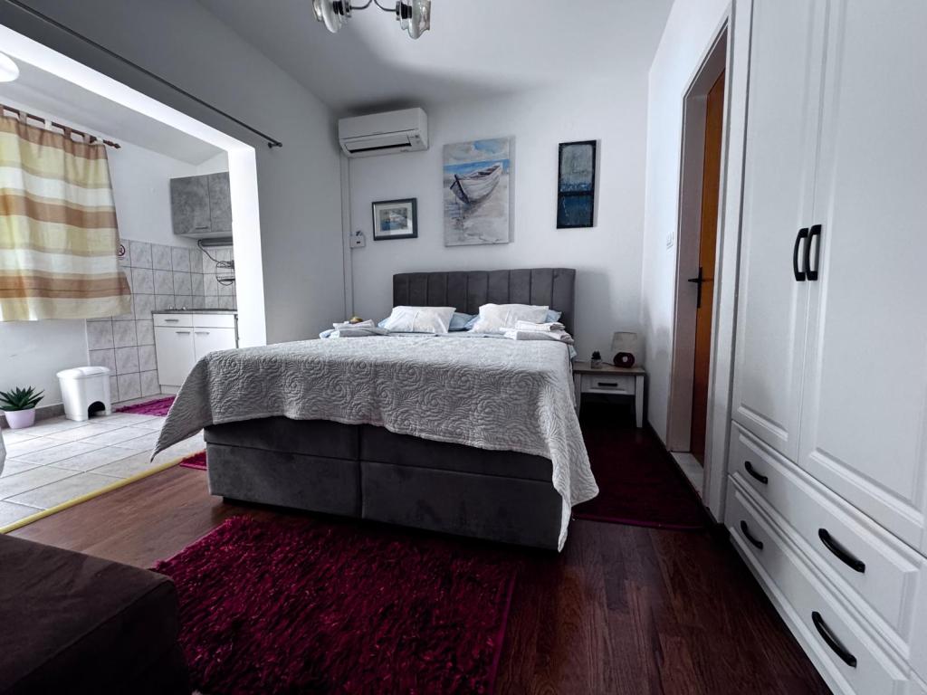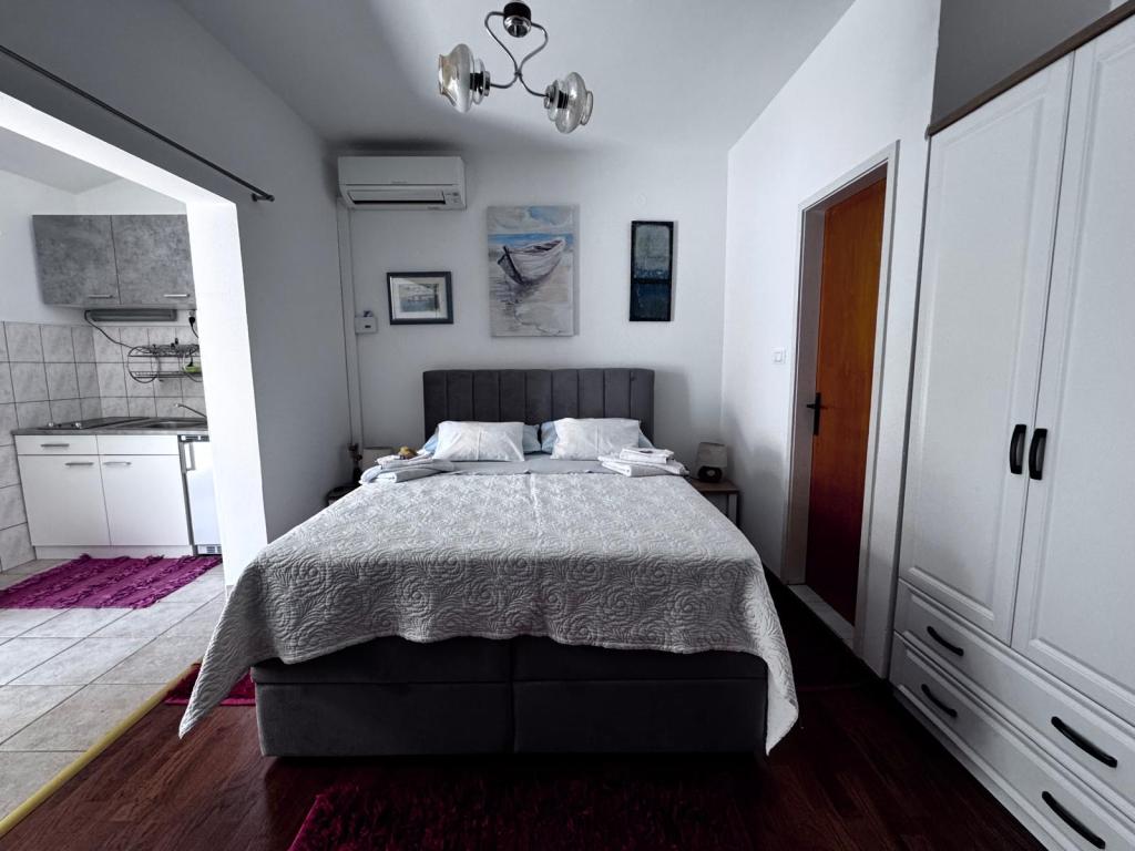 Ich empfehle diesen Ort wärmstens Familien mit Kindern, Paaren oder älteren Menschen, die Wohnung hat alle Erwartungen erfüllt, sauber, bequeme Betten, Waschmaschine, voll ausgestattete 4-Flammen-Küche, Klimaanlage nur 10 Stunden am Tag, aber ausreichend, Waschmaschine, Toaster, großer Kühlschrank, ein ruhiger Ort und eine wunderschöne Aussicht, die exotische Lage des Gebäudes neben wunderschönen Palmen, die Nähe zum Meer und zum Strand, der sauber und nicht überfüllt war - es war eine Offenbarung, und Sonnenliegen und Im Übernachtungspreis enthaltene Sonnenschirme sind wirklich selten. Daneben ist Sudenac und ein Ort mit Döner und Pommes, wenn man das Gebäude verlässt, gibt es überall am Meer und an der Promenade Kneipen, nebenan gibt es auch eine Bäckerei und die Besitzer Leo und Anita kümmern sich darum, dass alles gut für die ist Gäste. Selbst als wir einen Ganztagesausflug machten, wurde unsere Wäsche vor dem Sturm abgeholt, damit sie nicht nass wurde, was sehr schön war. Ich empfehle diesen Ort jedem, der das Meer zum Greifen nah haben möchte, a guter Preis und nicht sehr überfüllt. Ein großer Pluspunkt ist auch die ebene Fläche zum Spazierengehen mit Kinderwagen und Kindern