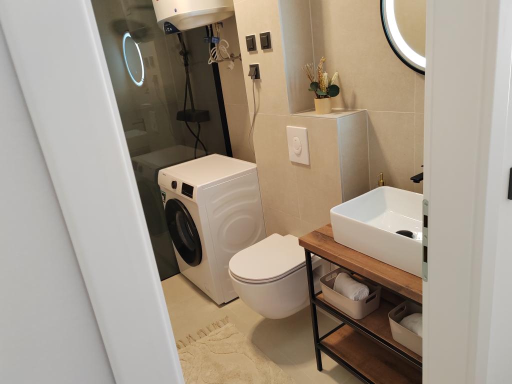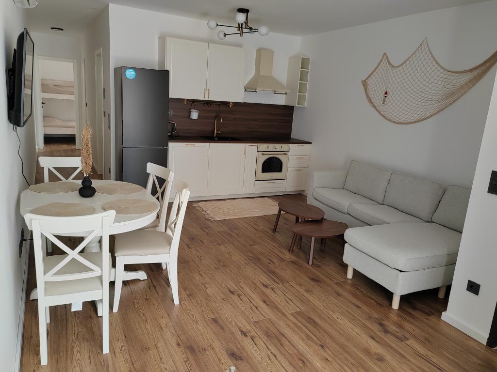 Komplett möblierte Wohnung in einem neuen Gebäude, nur 20 m vom Strand entfernt. Wir liegen 5 Gehminuten vom Zentrum entfernt. In der Nähe von Geschäften, Restaurants und Cafés. Am Strand gibt es eine Strandbar mit Sonnenliegen, natürlichem Schatten und einen Aquapark. Die Anlage verfügt über einen eigenen Parkplatz direkt vor der Terrasse.