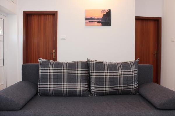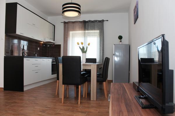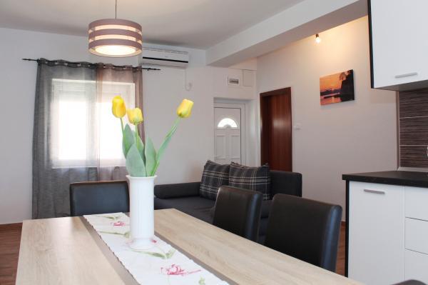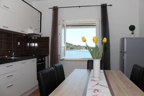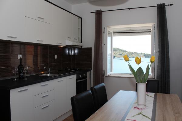 Voll ausgestattetes Apartment im ruhigen Dorf Kali, in erster Reihe zum Meer und 15 Gehminuten von der Stadt Preko entfernt. In Preko gibt es einen Fährhafen und Sie können den Hafen von Gaženica mit der Fähre in 25 Minuten und mit der Schnellbootlinie (ca. 15 Minuten) in die Altstadt erreichen. Der Innenbereich der Wohnung (Esszimmer, 2 Schlafzimmer und Badezimmer) hat eine Fläche von 50 m2 und verfügt zusätzlich über 2 Balkone. Der Hauptbalkon ist 25 m² groß und bietet Meerblick. Der kleinere Balkon ist 11 m² groß. Jedes Zimmer verfügt über eine eigene Klimaanlage. Es gibt einen Grill und einen Parkplatz unter der Wohnung.