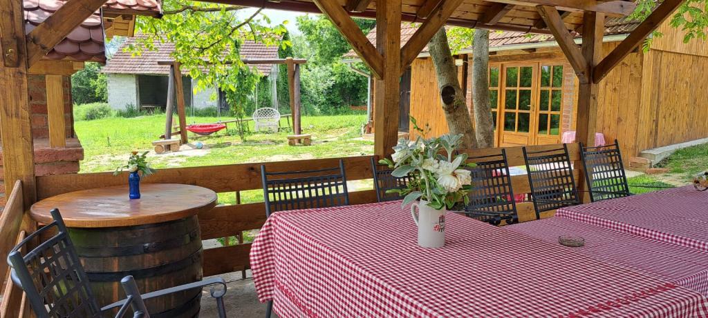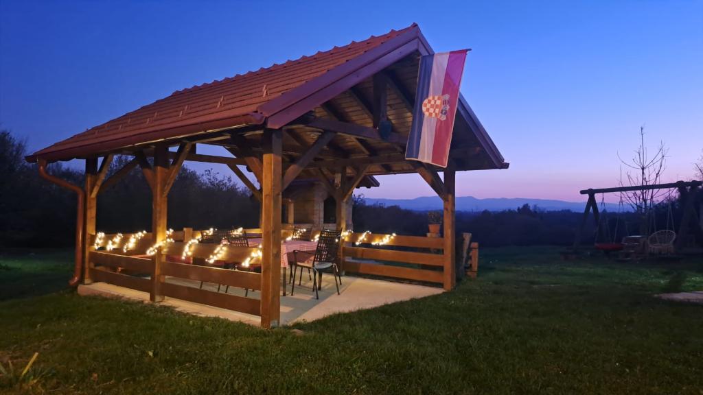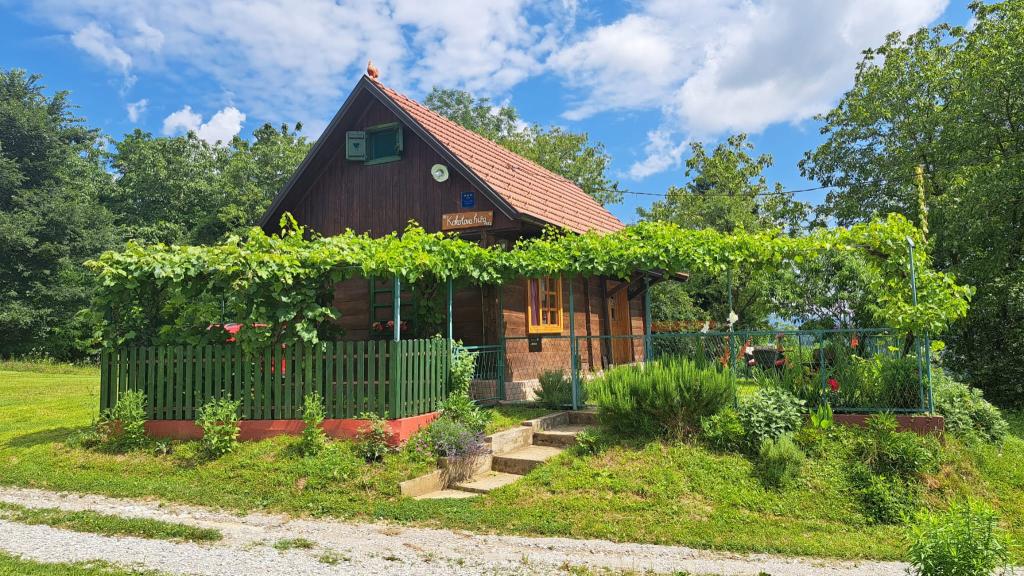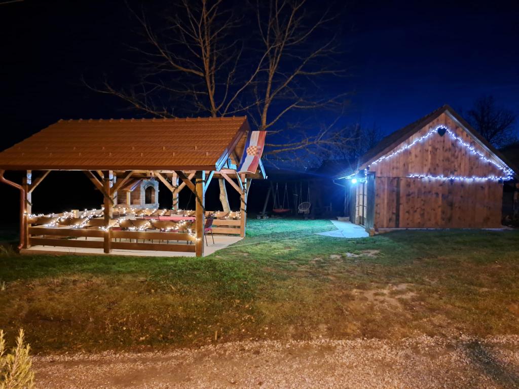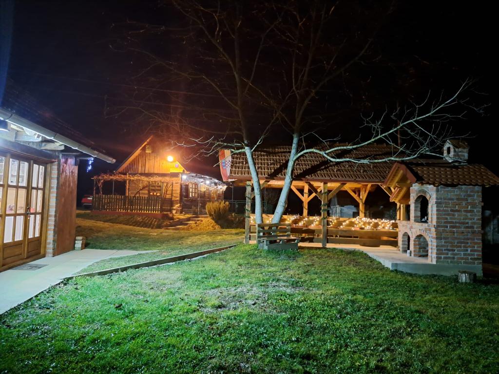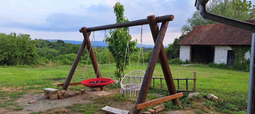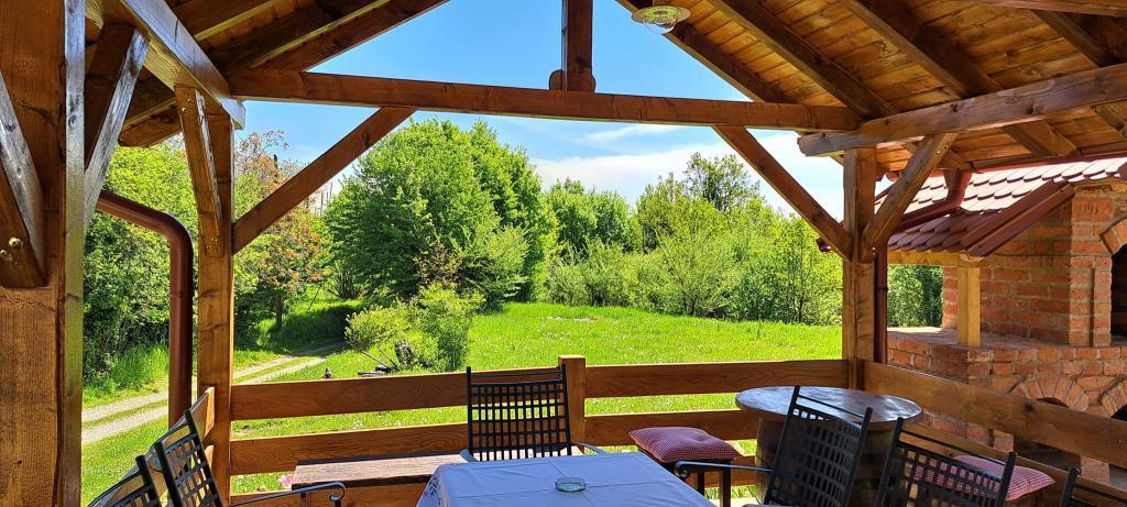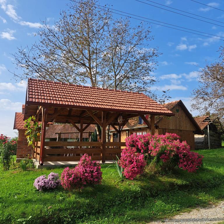 Das Ferienhaus Kokotova hiža befindet sich im kleinen Dorf Klimen im kroatischen Zagorje. Es besteht aus vier Holzgebäuden, einem Haus von 55 m2, einem Pavillon von 20 m2 mit gemauertem Grill und einem Gebäude mit einem Pavillon von 20 m2, einem Pavillon mit Whirlpool für 5 bis 7 Personen, kostenlosen Parkplätzen, Evo-TV, WLAN, ein Kinderspielplatz, Schaukeln für Erwachsene und Kinder, ein Blick auf den Berg Ivanščica auf der einen Seite und auf den Berg Medvednica auf der anderen Seite. Der umzäunte Hof des Hauses ist ideal für Haustiere. Hof von 700m2. Das Haus besteht aus einer Küche, einem Badezimmer und einem Wohnzimmer im Erdgeschoss sowie einem Schlafzimmer im Dachgeschoss mit drei Betten. Im Wohnzimmer gibt es ein Klappsofa für zwei Personen. Im Stall gibt es einen Raum zum geselligen Beisammensein und ein Badezimmer. Das Haus liegt abgelegen am Waldrand und ist ideal für den Urlaub sowie für die Bewirtung einer größeren Gruppe.