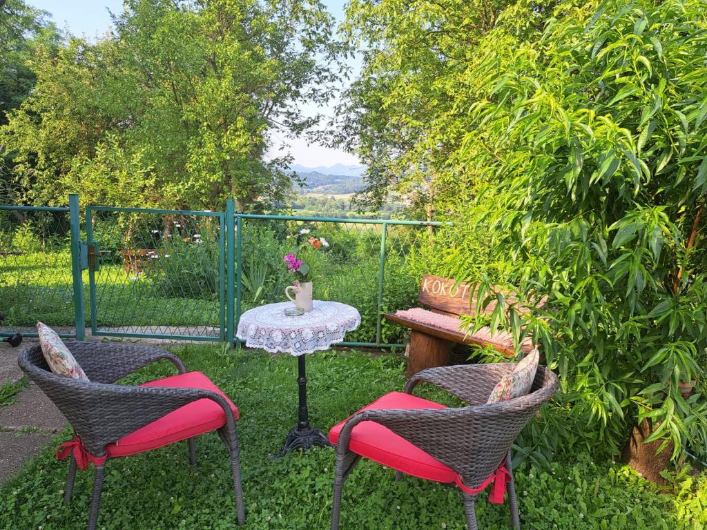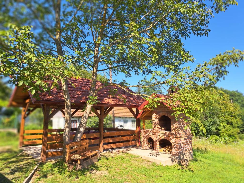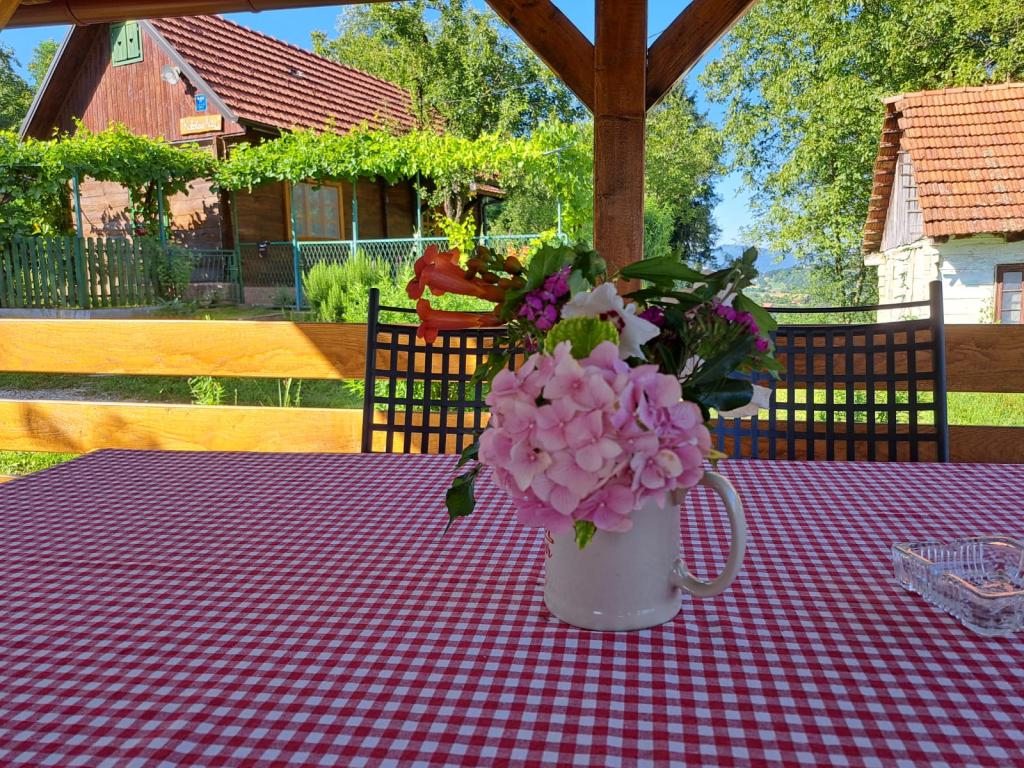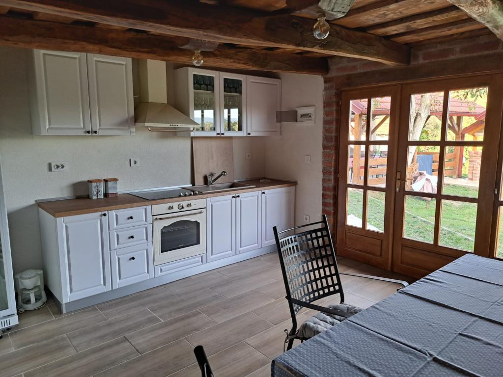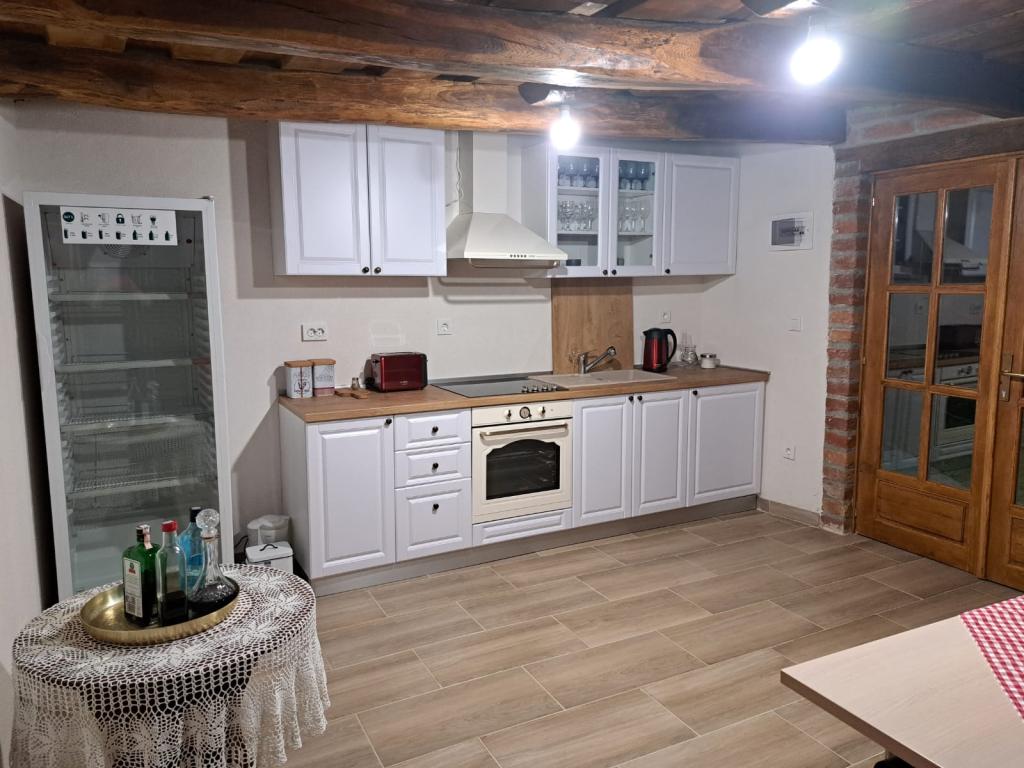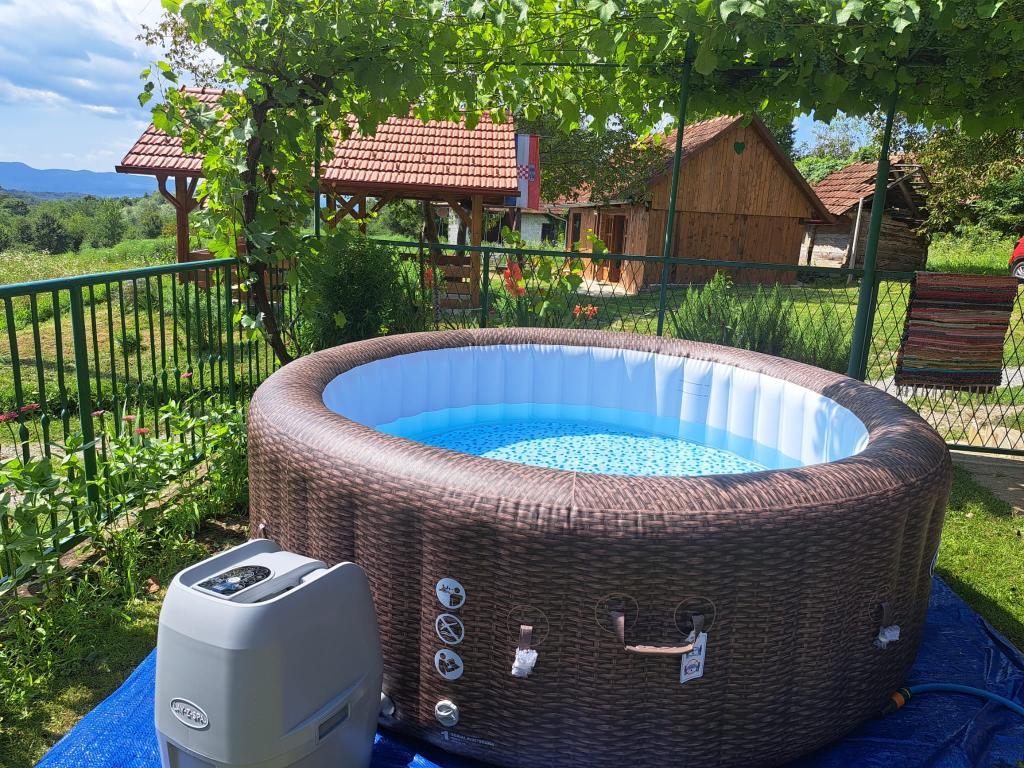 Das Ferienhaus Kokotova hiža befindet sich im kleinen Dorf Klimen im kroatischen Zagorje. Es besteht aus vier Holzgebäuden, einem Haus von 55 m2, einem Pavillon von 20 m2 mit gemauertem Grill und einem Gebäude mit einem Pavillon von 20 m2, einem Pavillon mit Whirlpool für 5 bis 7 Personen, kostenlosen Parkplätzen, Evo-TV, WLAN, ein Kinderspielplatz, Schaukeln für Erwachsene und Kinder, ein Blick auf den Berg Ivanščica auf der einen Seite und auf den Berg Medvednica auf der anderen Seite. Der umzäunte Hof des Hauses ist ideal für Haustiere. Hof von 700m2. Das Haus besteht aus einer Küche, einem Badezimmer und einem Wohnzimmer im Erdgeschoss sowie einem Schlafzimmer im Dachgeschoss mit drei Betten. Im Wohnzimmer gibt es ein Klappsofa für zwei Personen. Im Stall gibt es einen Raum zum geselligen Beisammensein und ein Badezimmer. Das Haus liegt abgelegen am Waldrand und ist ideal für den Urlaub sowie für die Bewirtung einer größeren Gruppe.
