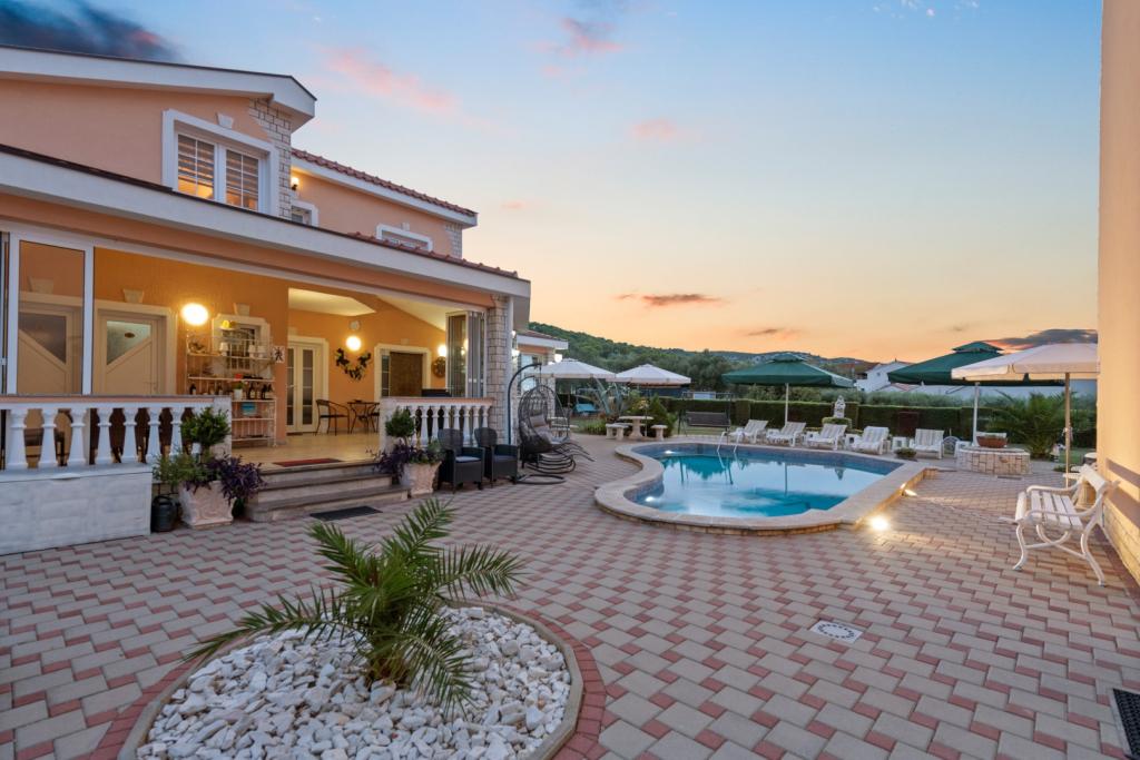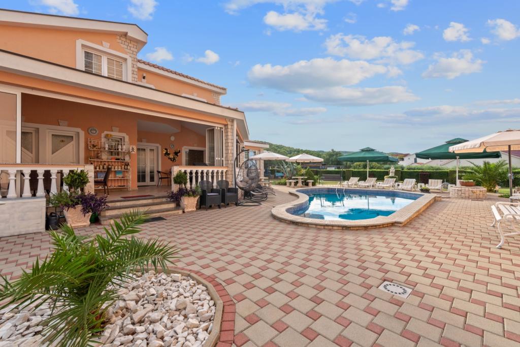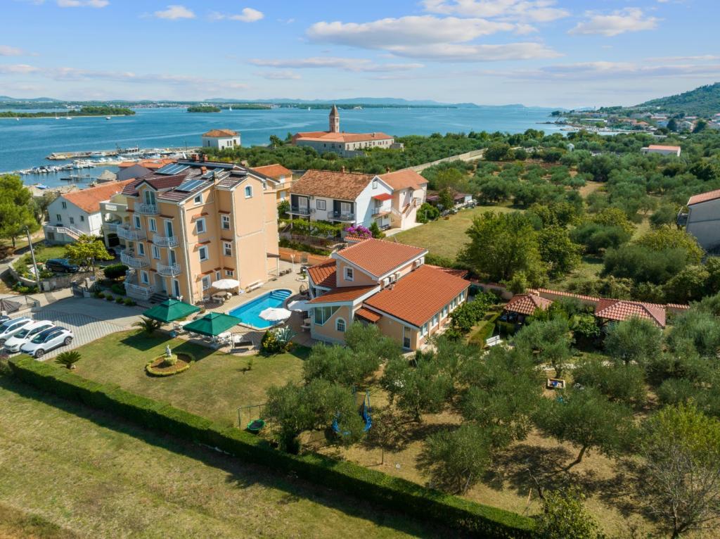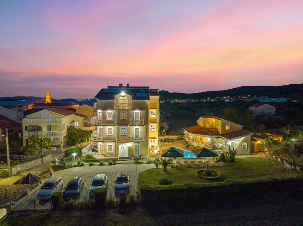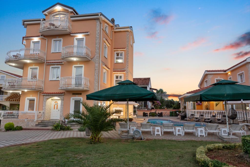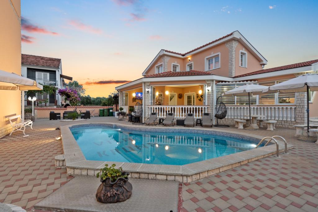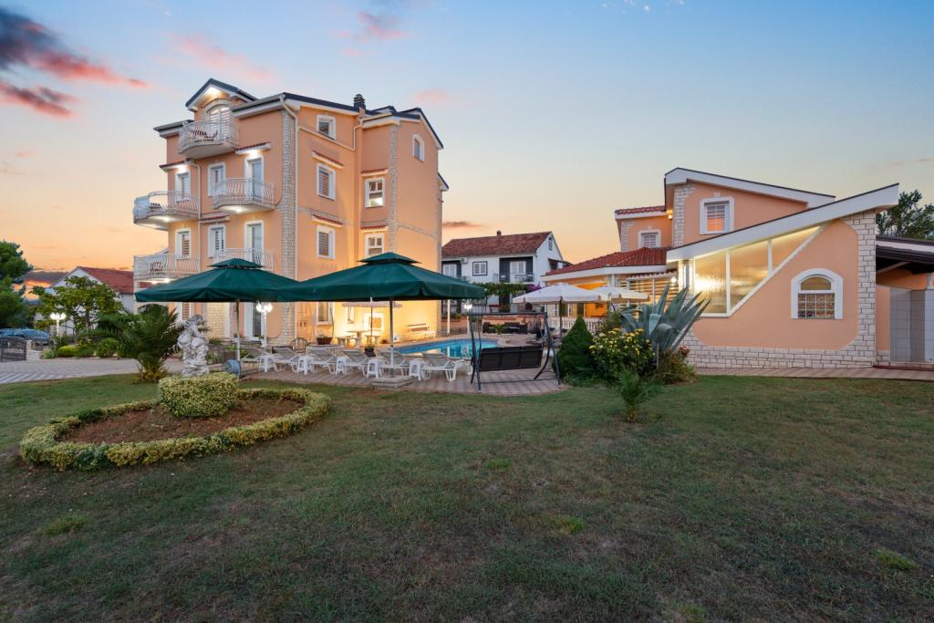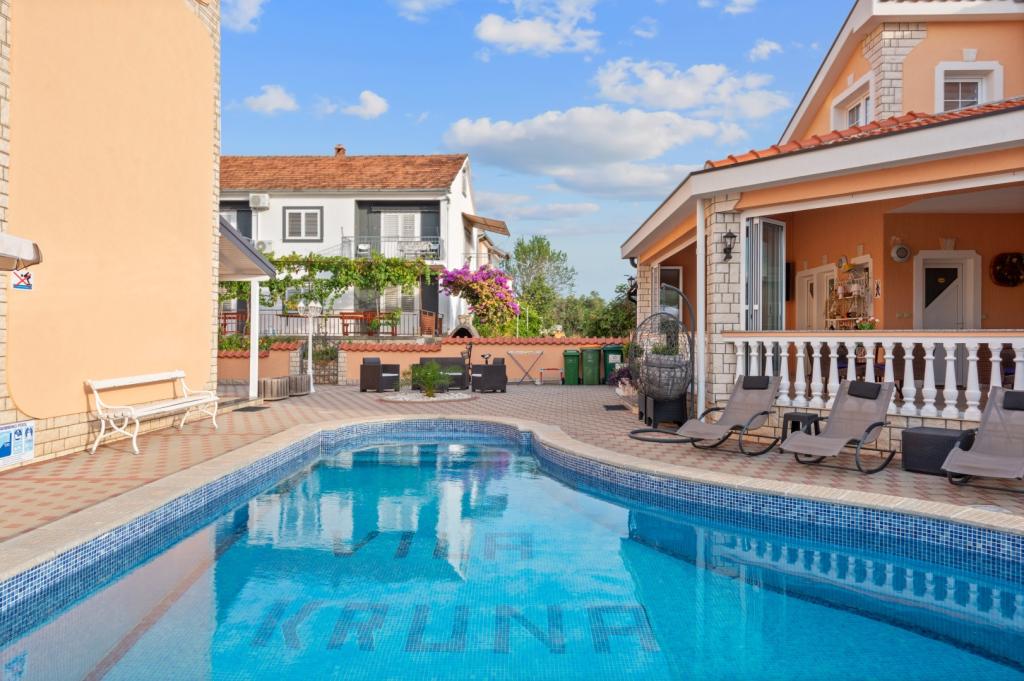 Crown Villa ist ein luxuriöses 4-Sterne-Unterkunft, die 30 Personen aufnehmen können. Villa ist der erste in einer Reihe, in einer wunderschönen Lage am Sandstrand mit Blick auf den Pasman Kanal eingestellt. Garten mit üppiger mediterraner Vegetation rund um das Haus und macht es besonders attraktiv. Im Garten befindet sich ein beheizbarer Pool mit Beleuchtung. Die Villa verfügt über 7 geräumige Suiten, die alle in besonderer Weise gestaltet. Jede Wohnung hat einen eigenen Balkon oder eine Terrasse mit Blick auf das Meer, den Strand und Garten-Villen.
