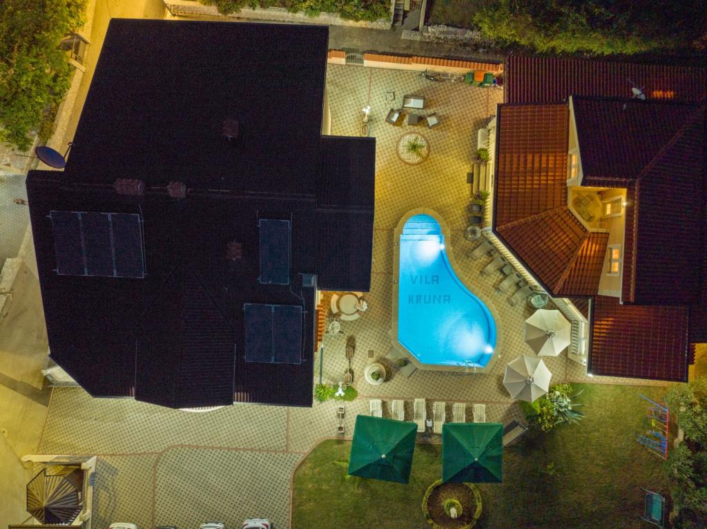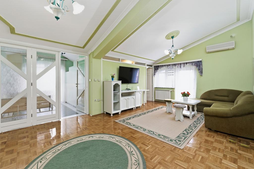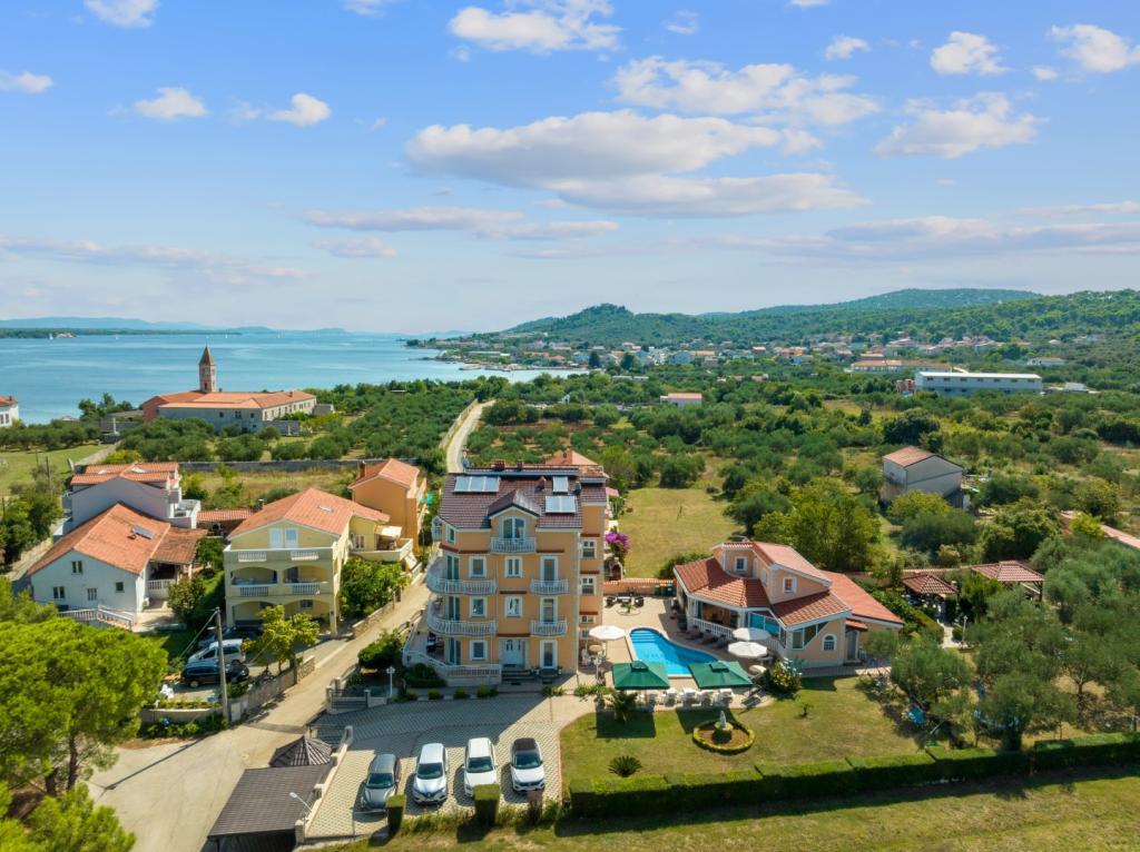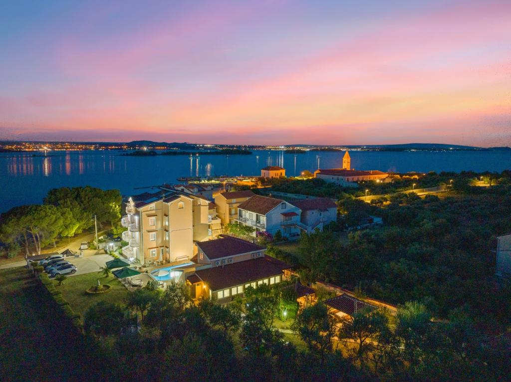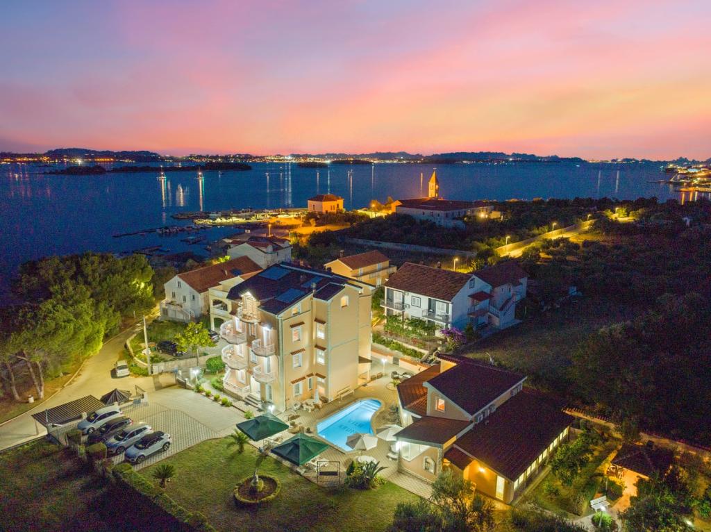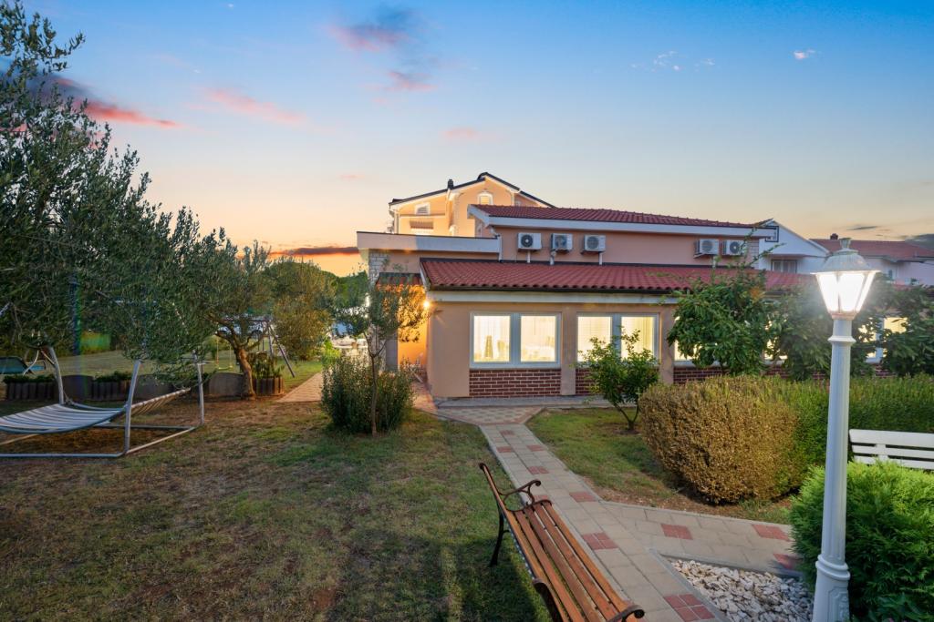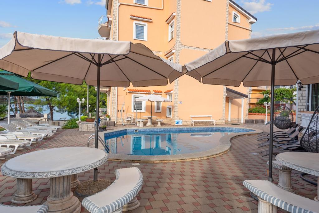 Crown Villa ist ein luxuriöses 4-Sterne-Unterkunft, die 30 Personen aufnehmen können. Villa ist der erste in einer Reihe, in einer wunderschönen Lage am Sandstrand mit Blick auf den Pasman Kanal eingestellt. Garten mit üppiger mediterraner Vegetation rund um das Haus und macht es besonders attraktiv. Im Garten befindet sich ein beheizbarer Pool mit Beleuchtung. Die Villa verfügt über 7 geräumige Suiten, die alle in besonderer Weise gestaltet. Jede Wohnung hat einen eigenen Balkon oder eine Terrasse mit Blick auf das Meer, den Strand und Garten-Villen.
