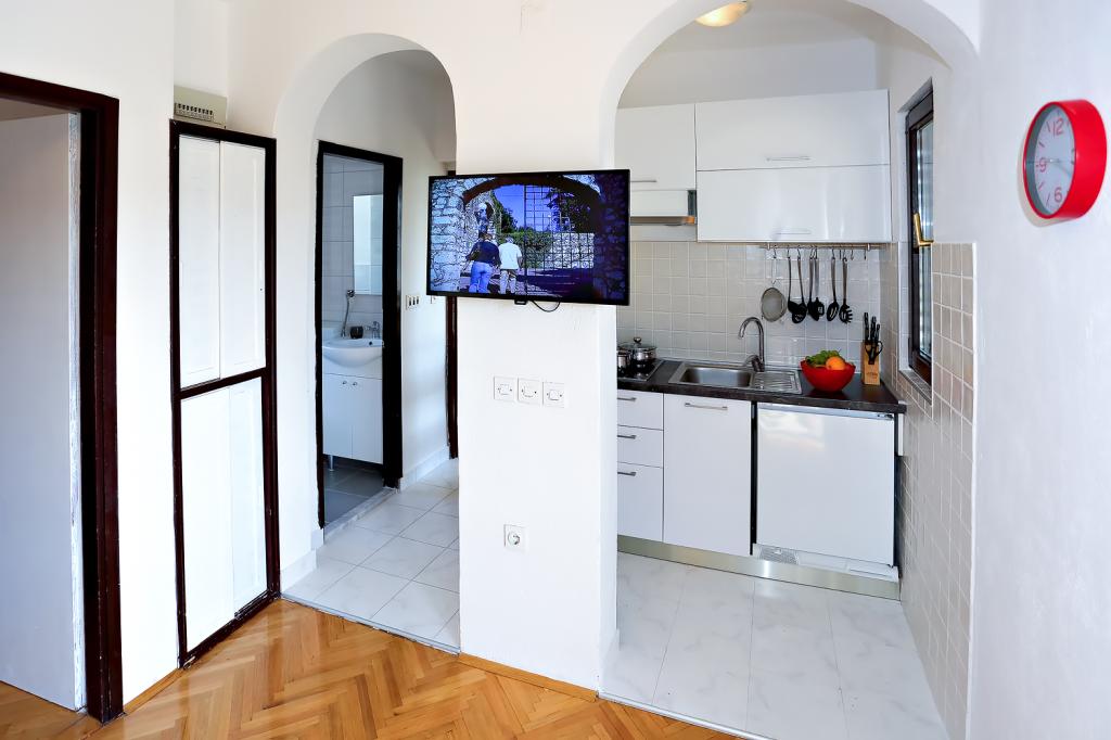 Die Apartments Nena befinden sich auf der Insel Ugljan in einem schönen und ruhigen Ort.Die Gäste können zwei Apartments mieten. Eines ist für 4+2 0 Zimmer und das andere für 2 Personen.Das 4+2 Apartment besteht aus zwei Schlafzimmern, einer Küche, einem Esszimmer und einem Wohnzimmer mit ausziehbarem Sofa.Die Küche ist modern mit allen Geräten ausgestattet (2 Kühlschränke, Geschirrspüler, Backofen, Mikrowelle.... Auf der großen Terrasse befindet sich ein Glaszaun, so dass es scheint, als ob Sie am Strand wären. zwei Personen 38m2 Es besteht aus einem kleinen Schlafzimmer, einem Badezimmer, einer Küche mit Esszimmer mit Balkon.