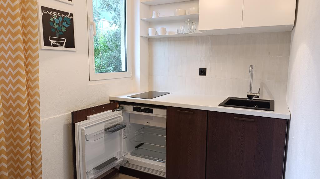 Die Wohnung ist bescheiden, bietet aber alles, was man im Urlaub braucht. Es gibt sogar ein Bügeleisen, sehr zur Freude meines Mannes, haha. Man kann problemlos in der Wohnung kochen und Wäsche mit der Hand waschen (vor dem Fenster hängen Wäscheleinen). Die Nachbarschaft ist ruhig und friedlich, mit Blick auf zwei wunderschöne Bäume: einen Feigenbaum und einen Olivenbaum, und den Berg dahinter. Kruno, unser Gastgeber, ist sehr freundlich und hilfsbereit. Er begrüßte uns mit einem Lächeln und verabschiedete sich mit demselben Lächeln. Vielen Dank, Kruno, für einen wundervollen Aufenthalt!