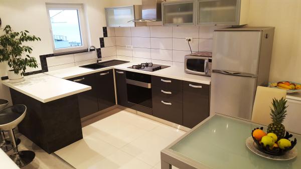 Das moderne und komplett eingerichtete Wohnung befindet sich im attraktivsten Teil von Makarska. Die Anlage befindet sich 5 Minuten zu Fuß zum Strand und der Promenade voll von verschiedenen Einrichtungen, wie Bars, Restaurants, Souvenirläden und so weiter. Im selben Haus, wo die Wohnung ist eine Apotheke und einen Supermarkt. In der Nähe als 10 bis 20 m sind ruhige Cafés, Bäckereien, Arzt, Kinderarzt, ATM, Kiosk und Geschäfte. Die Wohnung besteht aus Küche, Wohnzimmer, drei Schlafzimmer, drei Bäder, große Terrasse und Balkon. Die Wohnung verfügt über einen schönen Blick auf das Meer, Inseln, Stadtzentrum und dem Berghang. Die Wohnung ist mit einer Klimaanlage ausgestattet, die ein bisschen in der Wohnung ist, Geschirrspüler, Waschmaschine, TV Flachbild-TV, WLAN, Mikrowelle. Die Gäste haben Zugang zu Wäsche und Handtücher und andere verhandelbar.