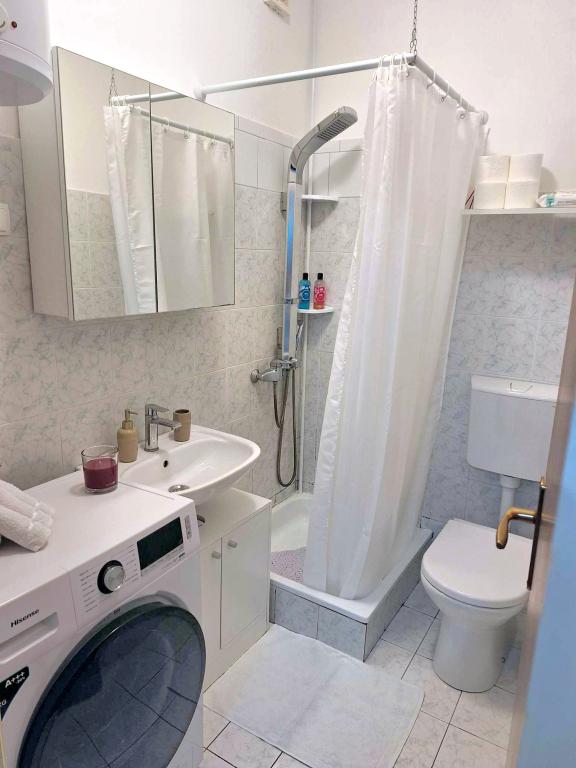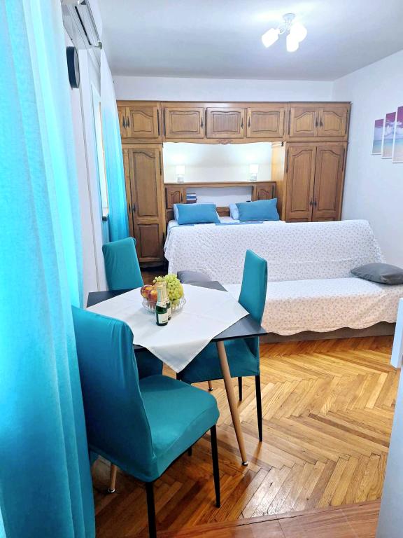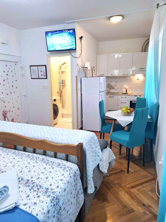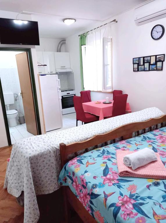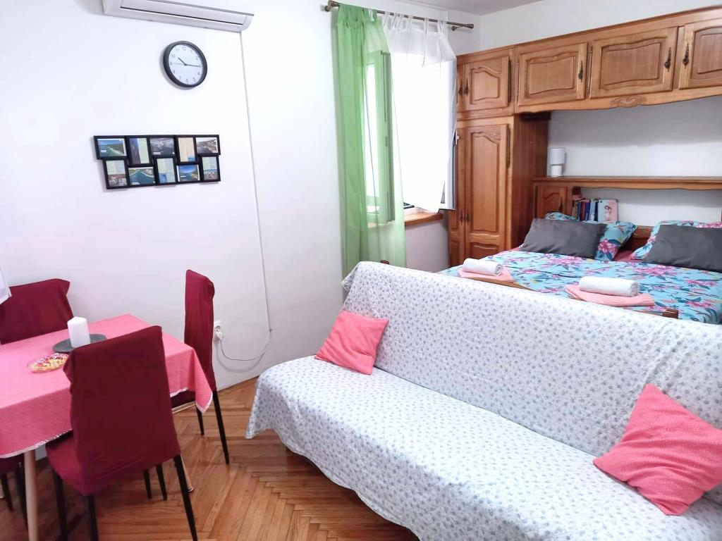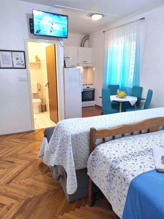 Studio-Apartment Donna hat drei Sterne. Es befindet sich im Erdgeschoss eines Gebäudes in einem ruhigen Teil der Stadt Mali Lošinj. Die Wohnung ist für zwei Personen mit einem Zusatzbett für eine weitere Person oder ein Kind vorgesehen. Kostenfreies WLAN und Parkplätze stehen innerhalb der Anlage zur Verfügung (Sie erhalten einen Schlüssel). Das Apartment verfügt über eine Terrasse, auf der Sie den Tag mit Ihrem ersten Morgenkaffee beginnen können. Die neu renovierte Wohnung ist mit den notwendigen kleinen und großen Haushaltsgeräten (Fernseher, Internet, Klimaanlage, Waschmaschine, Wasserkocher, Föhn, Bügeleisen) ausgestattet. Aufgrund des Aufkommens des Coronavirus haben wir alle vorbeugenden Maßnahmen ergriffen, um sicherzustellen, dass Sie während Ihres Aufenthalts in der Wohnung sicher sind. Am Eingang der Wohnung wartet Handdesinfektionsmittel auf Sie. Der nächste Valdarka-Strand ist 200 m entfernt. Der Strand hat natürlichen Schatten, sauberes Meer, einen gepflegten Eingang und einen Kinderspielplatz. Es gibt zahlreiche andere Strände in der Nähe, die Sie besuchen und etwas für sich finden können (Sonne, Schatten, Sand, Felsen, Bars, Restaurants usw.). Ihr Kind wird vom Aquapark Čikat angezogen, wo es Außenpools und eine Wasserrutsche gibt. Alles, was Sie für einen schönen und hochwertigen Urlaub benötigen, befindet sich nicht weit von der Wohnung entfernt (Geschäfte Lidl, Konzum, Jadranka, DM, Bipa, Apotheken und zahlreiche Restaurants). In der Nähe der Wohnung befindet sich einer der vielen sehenswerten Orte auf Lošinj, nämlich der Miomirisni vrt, der voller Pflanzenreichtum ist und wo Sie ein Souvenir kaufen können. Neben der Miomirisno vrta können Sie auch den thematischen Aussichtspunkt Providence besuchen, der einen schönen Blick auf die Stadt, ihre Buchten und Strände bietet. Wenn Sie während Ihres Urlaubs etwas lernen möchten, können Sie das Apoksiomena-Museum besuchen, das sich direkt am Wasser befindet. Wenn Sie