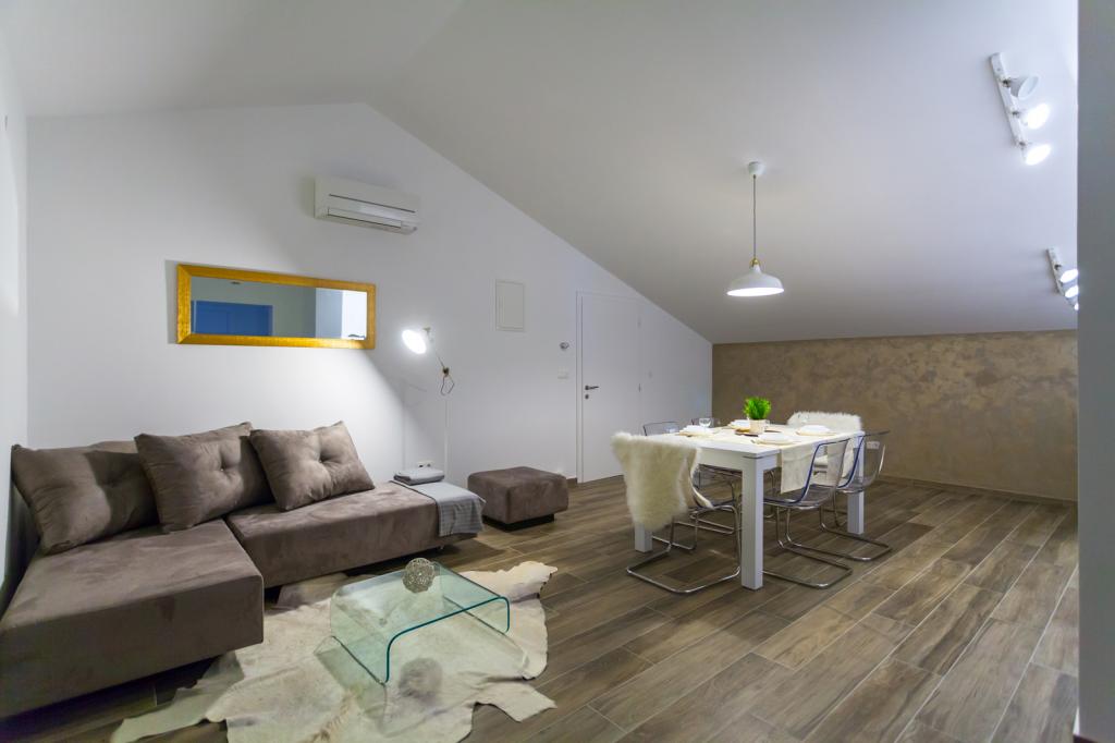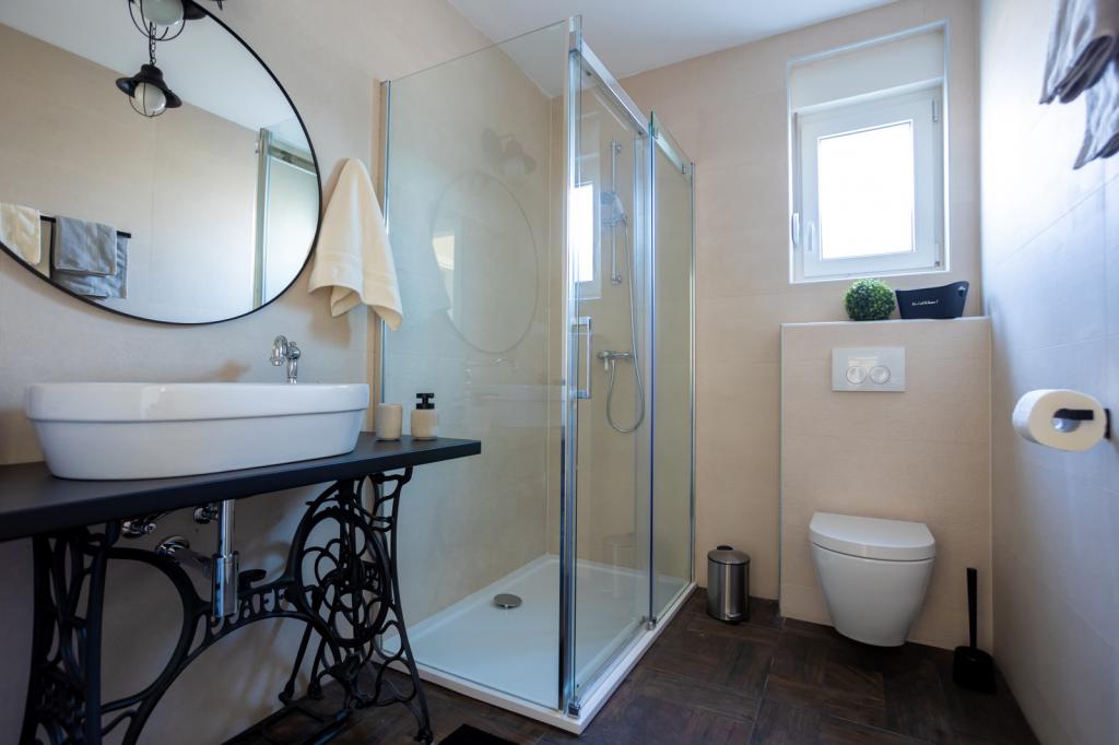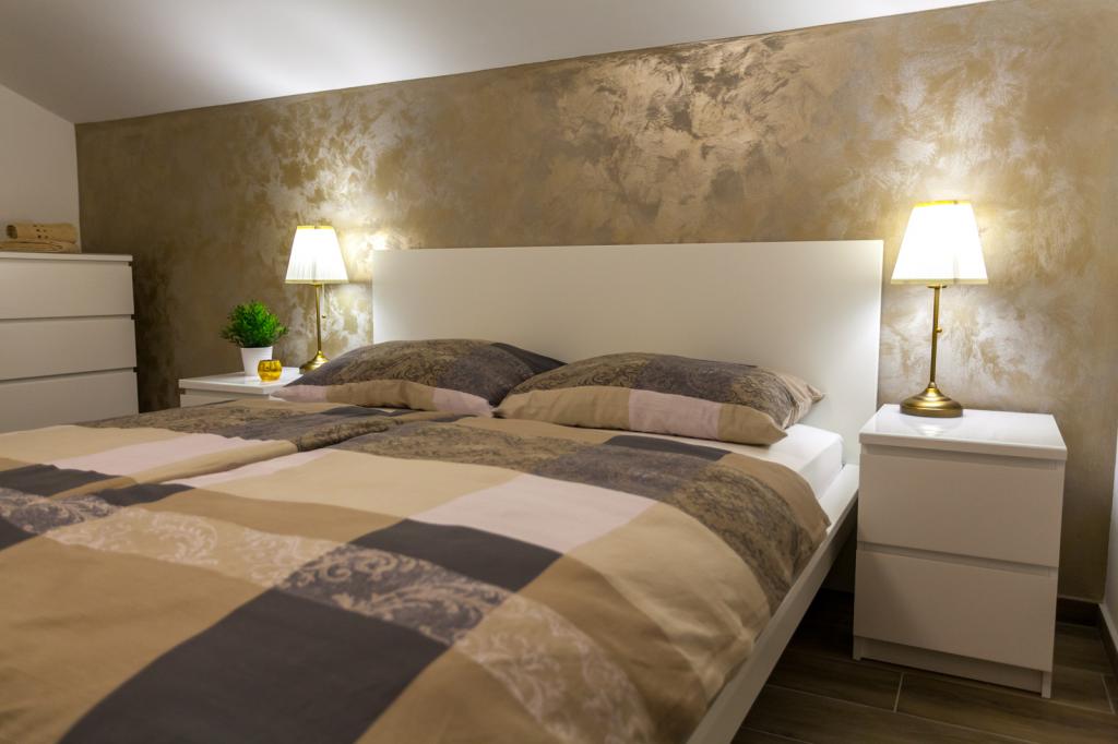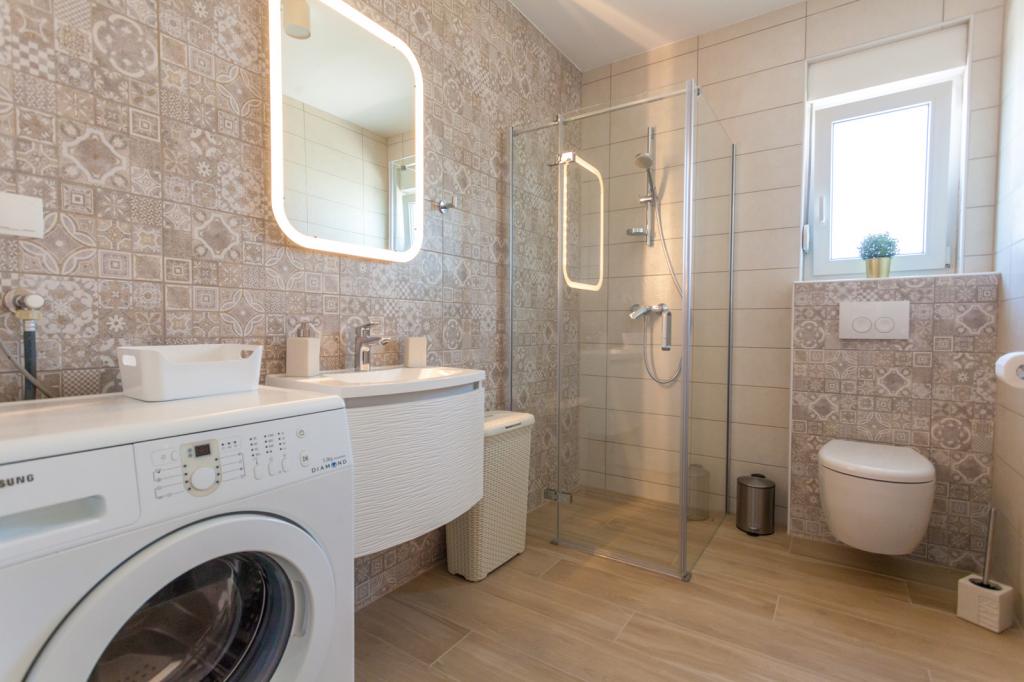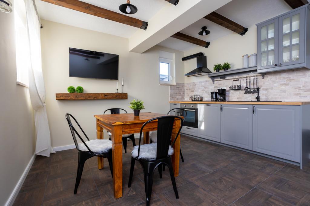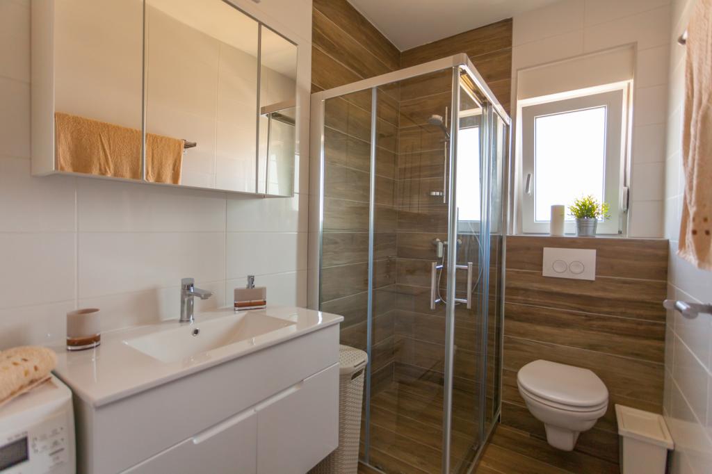 Die Villa FE bietet moderne und elegant eingerichtete Apartments mit herrlichem Meerblick in einem ruhigen und attraktiven Teil von Malinska-Rova, nur 300 Meter vom Strand entfernt. Die Villa besteht aus fünf modern ausgestatteten Apartments: eines im Untergeschoss, zwei im ersten und zwei im zweiten Stock. Die Apartments in den oberen Etagen verfügen über einen privaten Balkon, der zum Entspannen mit Blick auf die Adria einlädt. Die Inneneinrichtung ist modern und mit sorgfältig ausgewählten Möbeln gestaltet und garantiert einen komfortablen und angenehmen Aufenthalt. Zur Ausstattung gehören Klimaanlage in den Gemeinschaftsräumen und Schlafzimmern, ein Fernseher sowie kostenloses und schnelles WLAN im gesamten Gebäude. Dank ihrer hervorragenden Lage in der Nähe von Stränden, Restaurants und Einkaufsmöglichkeiten ist die Villa FE die perfekte Wahl für einen romantischen Urlaub, einen Familienurlaub oder eine erholsame Auszeit am Meer.