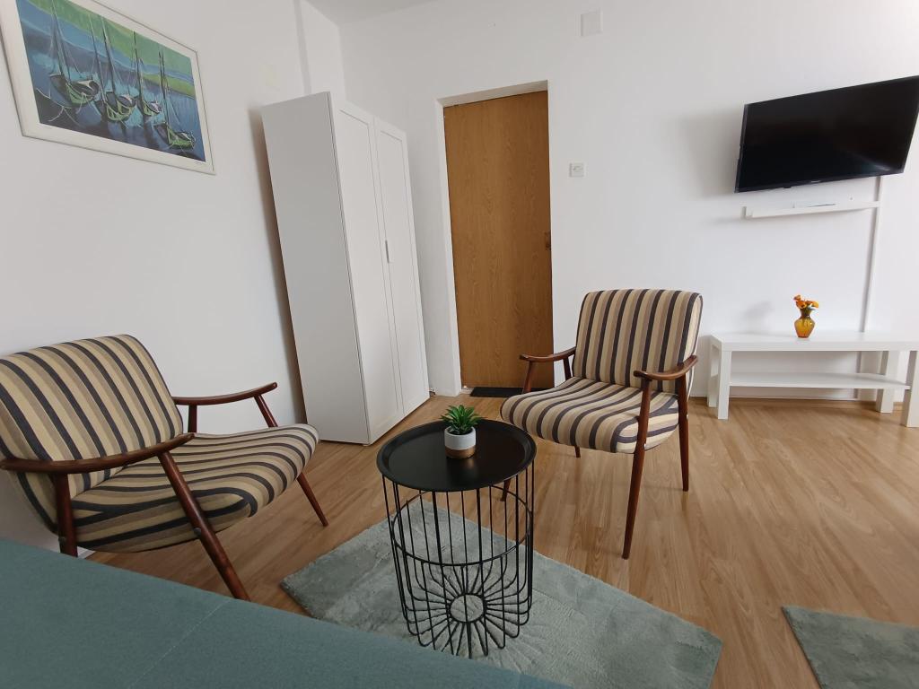 Studio-Apartment für maximal 3 Personen, besteht aus einem Zimmer mit einem Doppelbett und einem Zustellbett, einer Küche, einem Badezimmer und einer Terrasse. Parkplatz für das Auto befindet sich im Hof des Hauses. Die Wohnung ist voll möbliert. Es dauert 5-8 Minuten zu Fuß zum nächsten Strand, und in der Nähe gibt es Geschäfte, einen Markt, ein Zentrum, Restaurants, eine Bushaltestelle... Die Strände sind hauptsächlich Kies und Beton. Ruhige Lage.