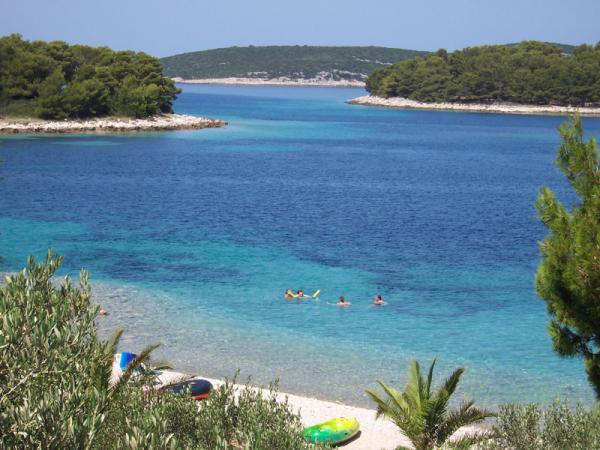 Im Haus Saskinja im neuen Teil des Fischerdorfes Maslinica, direkt neben einem wunderschönen Kieselstrand, befinden sich vier wunderschön eingerichtete Ferienwohnungen mit großen Terrassen, teils zum Sonnenbaden, teils im Schatten von Pinien. Alle sind nach Westen ausgerichtet und bieten einen wunderschönen Blick auf das Meer und die vor Maslinica gelegenen Inselchen. Jede Ferienwohnung verfügt über eine Terrasse, von der aus Sie die schönsten Sonnenuntergänge der Insel erleben können. Neben dem Haus befindet sich ein Innenhof mit Parkplätzen im Schatten von Pinien. Den Gästen steht auch der Grill im Garten zur Verfügung. Das Stadtzentrum mit Markt, Tavernen, Pizzerien und Restaurants, darunter einige der gehobenen Klasse (das Restaurant im Schloss Martinis Marchi bietet neben berühmten kroatischen Weinen auch Spitzenweine aus aller Welt), ist nur einen 15-minütigen Spaziergang entlang der Küste entfernt. Wenn Sie lieber allein sein möchten, können Sie schwimmen oder mit dem Kajak zu den Inselchen Saskinja oder Polebrnjak paddeln, die nur 15 Schwimmminuten vom Strand entfernt sind. Für Sandliebhaber befindet sich der Sandstrand in der Nachbarbucht.