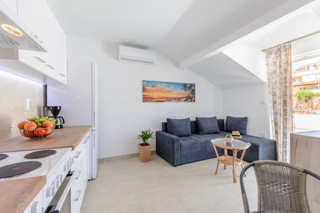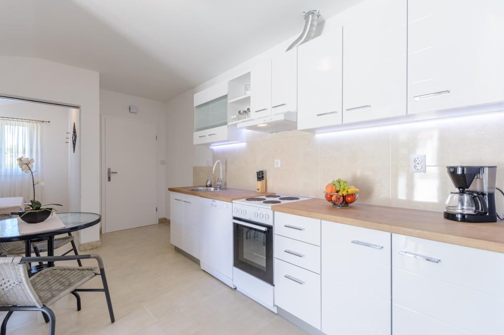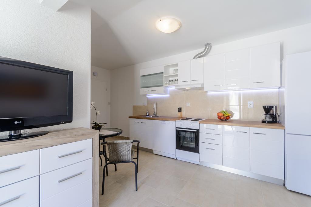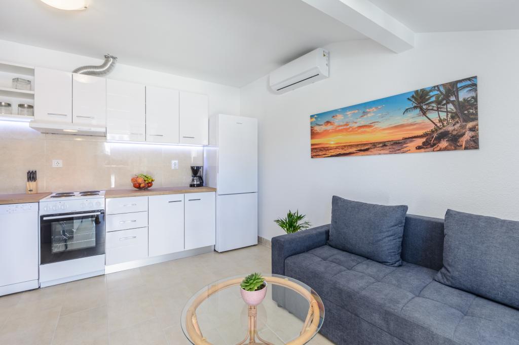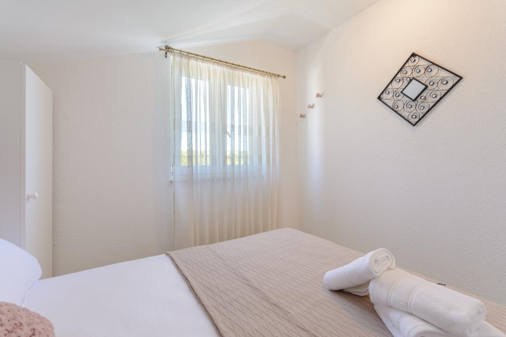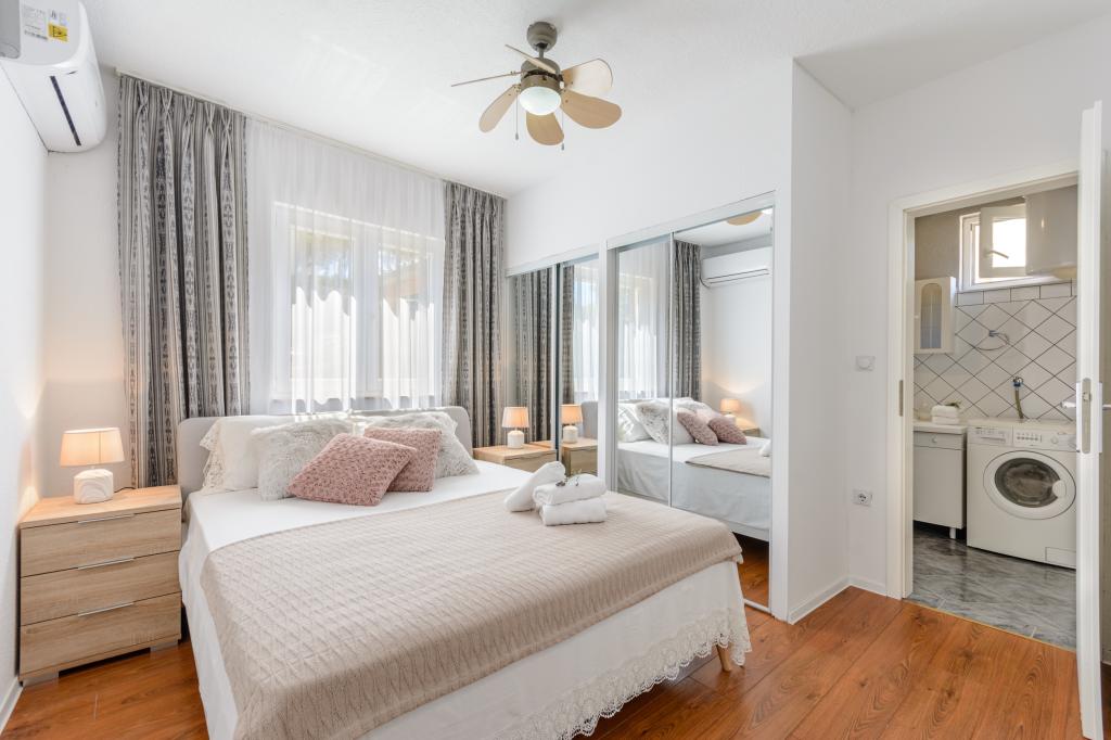 Top Lage, nah am Meer. Große Terrasse mit Meerblick. Die Wohnung ist sehr schön eingerichtet und sauber. Das Bett ist sehr bequem. Die Wohnung bietet alles, was man braucht. Liegen, Sonnenschirme und Handtücher für den Strand sind vorhanden. Das Meer ist wunderschön und die Strände sind gepflegt und kinderfreundlich. Frau Ivanka ist eine sehr freundliche und herzliche Person. Sehr zu empfehlen!