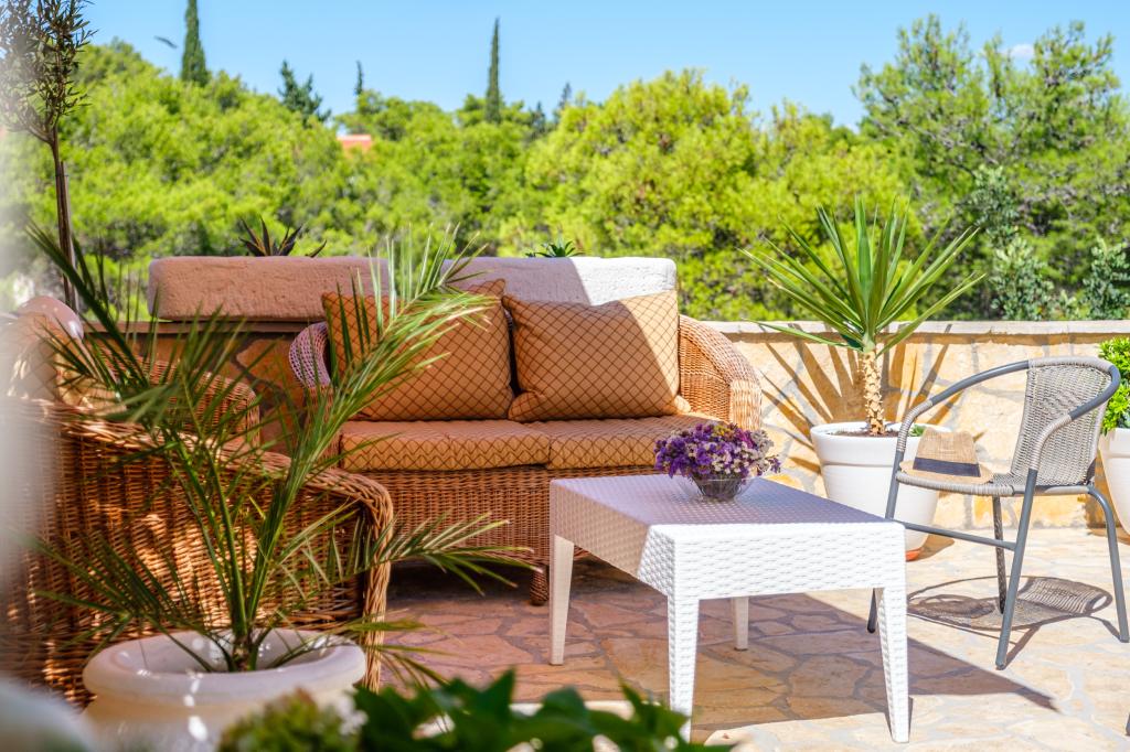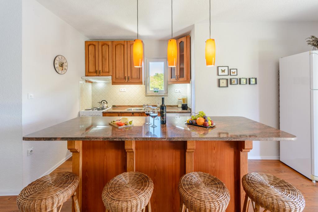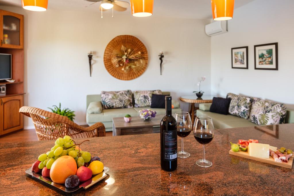 Direkt am Meer, nur 28 m vom Strand in der Bucht von Osibova entfernt, befinden sich neue, luxuriöse und modern ausgestattete Apartments mit Klimaanlage, WLAN, TV, separatem Eingang, Parkplatz und wunderschönen privaten Terrassen mit Meerblick. Alle Fenster und Terrassentüren sind mit Moskitonetzen ausgestattet. Apartment Nr. 1 (4+2 Personen) verfügt neben einer geräumigen Küche, einem Wohnzimmer und einer überdachten Terrasse (12 m²) über zwei Schlafzimmer mit jeweils einem angrenzenden Badezimmer, eines davon mit Waschmaschine. Apartment Nr. 2 (2+2 Personen) bietet ein Schlafzimmer, ein Badezimmer, eine Küche, ein Wohnzimmer und eine große (30 m²) Terrasse, die teilweise mit Weinreben bewachsen ist. Neben hochwertigen Matratzen sind die Apartments mit luxuriöser Satinbettwäsche und Handtüchern, Föhn und Bügeleisen ausgestattet. Die Küche verfügt über Geschirr, Gläser, Koch- und Essbesteck, einen Geschirrspüler, einen großen Kühl- und Gefrierschrank, einen Herd mit Backofen, eine Kaffeemaschine, einen Toaster, eine Mikrowelle und einen Wasserkocher. Für die Gäste stehen Handtücher, Sonnenliegen und Sonnenschirme für den Strand sowie eine Waschmaschine und ein Gasgrill kostenlos zur Verfügung.