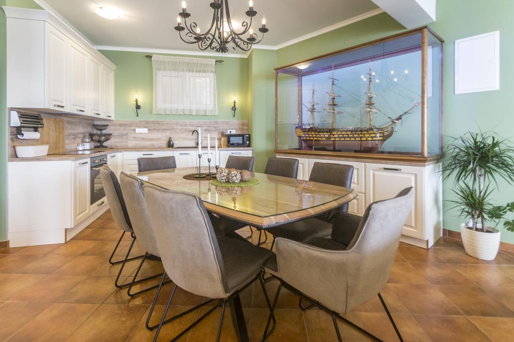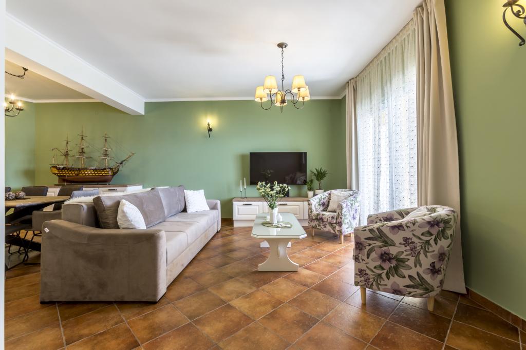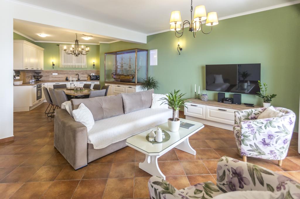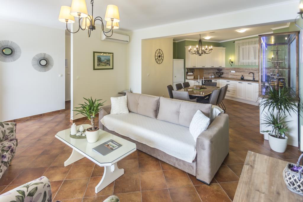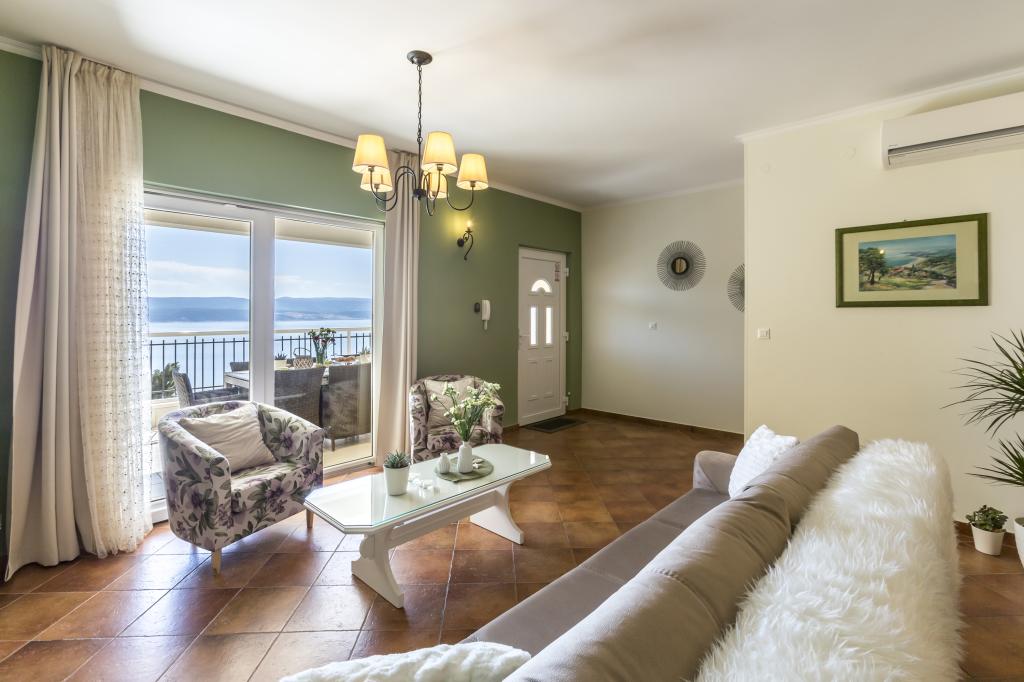 Das Apartment VICTORY befindet sich in einer freistehenden Villa in der Nähe des ruhigen Dorfes Mimice mit wunderschönem Meerblick vor und herrlicher Bergnatur hinter der Villa. Ein idealer Ort und Standort für Familienreisende, die den überfüllten und lauten Touristengebieten entfliehen möchten. Die örtlichen Strände mit Restaurants, Strandbars und einem örtlichen Markt sind nur 10 Gehminuten entfernt. Das Apartment ist luxuriös mit brandneuen Möbeln und allen notwendigen Geräten eingerichtet. Die Apartmentgröße beträgt 120 m², bietet Platz für maximal 8 Gäste und besteht aus: * Drei (3) Schlafzimmern mit Klimaanlage und neuen Möbeln. * Zwei (2) Badezimmern mit Toilette und Waschmaschine. * Großes Esszimmer (für 8 Personen) mit brandneuer Küche, die mit allem notwendigen Geschirr ausgestattet ist. * Großes Wohnzimmer mit großem Sofa und zwei Sesseln. * Großer Balkon (20 m²) mit wunderschönem Meerblick und Esstisch für 8 Personen. Das Apartment ist mit einem großen 55-Zoll-Smart-LED-Sat-TV und Audiosystem sowie Klimaanlage ausgestattet.