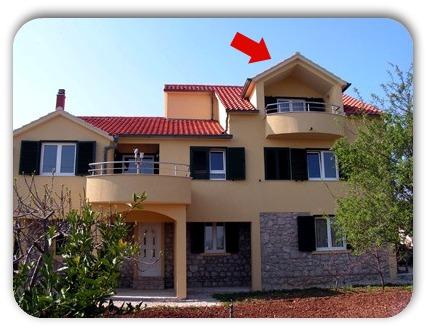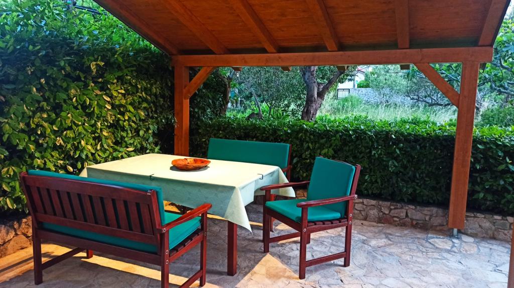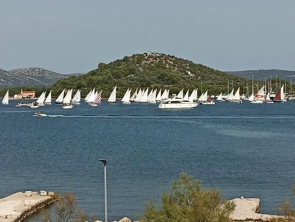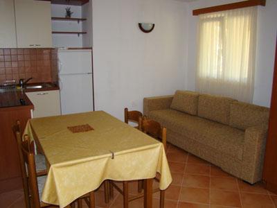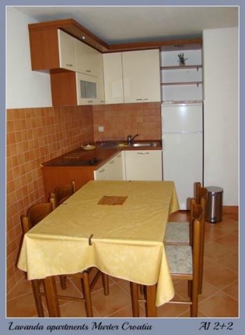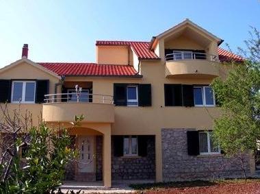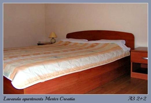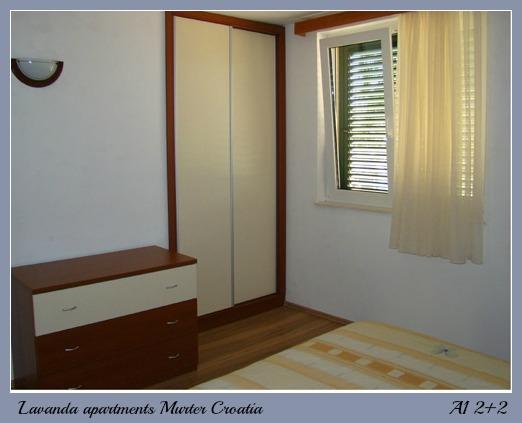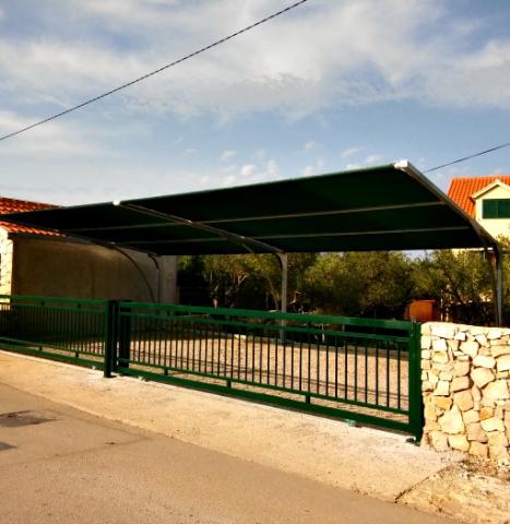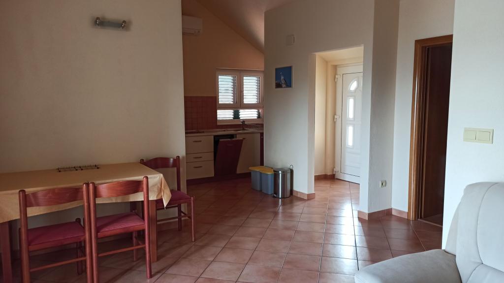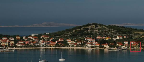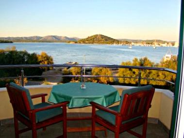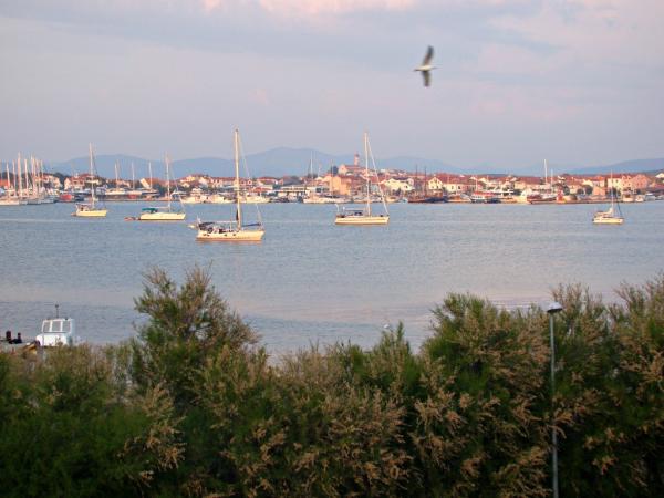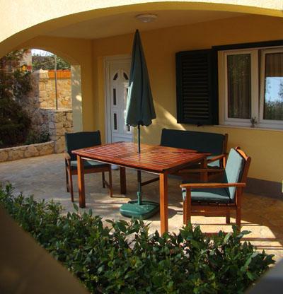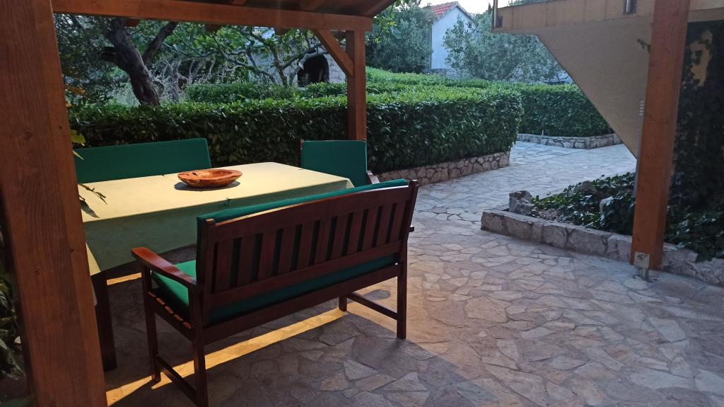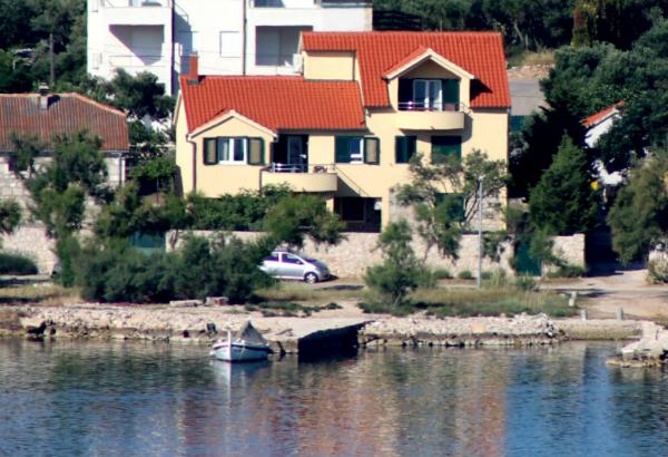 Murter, klimatisierte Apartments für 2-4 Personen direkt am Meer, jeder mit seiner eigenen Terrasse oder einen Balkon in einem großen Innenhof mit einem mediterranen Garten in einer ruhigen Gegend. Der Parkplatz.