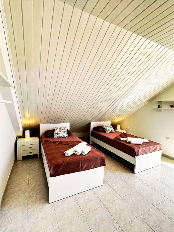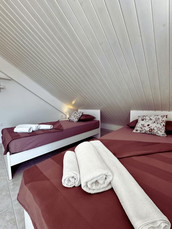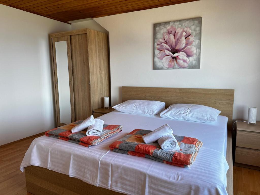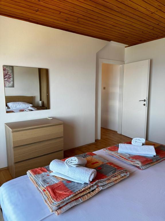 Zweifellos sind unsere Wohnungen zu den besten in Murter, wünschenswert wegen der schönen Aussicht, attraktive Lage und den Komfort, sondern auch wegen unserer offenen Herzen und Gastfreundschaft. Der Klang der Wellen, der Geruch des Meeres und der schönen Aussicht auf den Nationalpark Kornati und Murter Archipel, werden Ihren Urlaub schön und unvergessliches Erlebnis für die ganze Familie. Grün, großer Hausgarten, Ruhe und Haus nur 150 Meter vom Meer und den Stränden Sole ist der Hauptgrund unserer Gäste besuchen und kommen jedes Jahr wieder. Im Haus befinden sich drei Wohnungen, die vermietet werden. Eine große Wohnung für 4 Personen AP (4 1) mit 2 Schlafzimmern, Wohnzimmer, Esszimmer, Küche und Bad, und zwei kleinere Wohnungen mit 1 Schlafzimmer, 1 Bad und ein Wohnzimmer mit Küche: AP 1 (2 1) und AP 2 (2 1). Jede Wohnung hat eine Terrasse mit Blick auf das Meer.