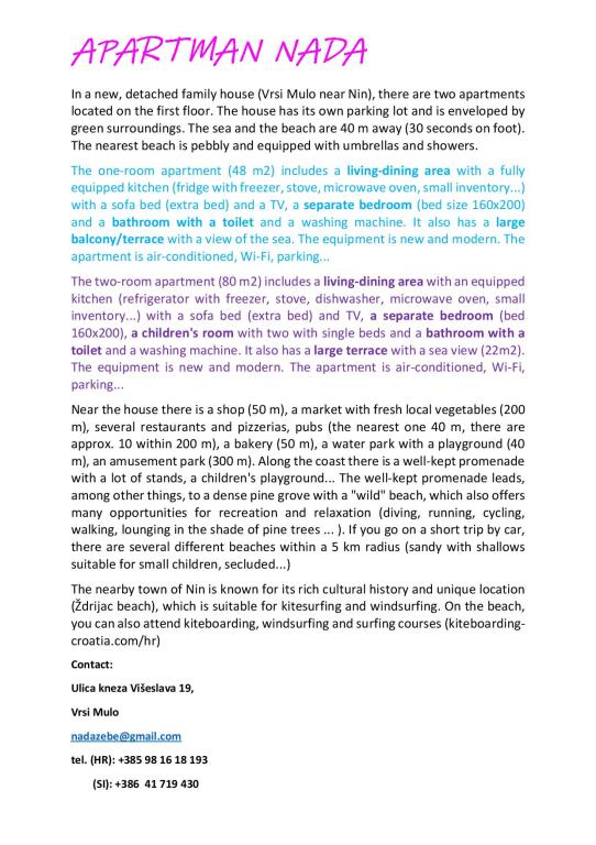 Kurtaxe ist im Preis inbegriffen. Buchungsbestätigungsdokument bei ReservierungIn der Nähe der Wohnung gibt es ein Geschäft (50 m), einen Markt (200 m), mehrere Restaurants, Pizzerien und Bars. Wenn Sie nicht kochen möchten, können Sie sich ein Fertiggericht ins Haus bestellen. Für die Unterhaltung junger Leute gibt es einen Wasserpark mit Spielplatz (40 m). Entlang der Küste verläuft eine Promenade mit Ständen, einem Kinderspielplatz und einer Freizeitecke. Die Promenade führt zu einem dichten Kiefernwald mit „wilden“ Stränden, die ebenfalls zahlreiche Möglichkeiten zur Erholung und Entspannung bieten (Laufen, Radfahren, Spaziergänge im Schatten der Kiefern...). Die weitere Umgebung bietet 34 km verschiedene Strände: Sand-, Kies- und Felsstrände mit vielen versteckten Buchten. Das nahe gelegene Nin ist als antike Stadt mit römischen Ruinen bekannt und bietet Strände mit Heilschlamm und eine Lagune zum Kitesurfen. Die weitere Umgebung verfügt über gut ausgebaute Radwege. Ausflüge in die Umgebung werden von uns aus organisiert.