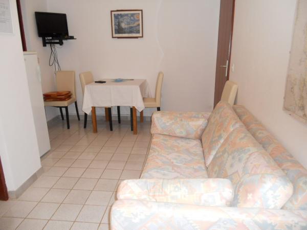 Sehr schönes älteres Ehepaar, Appartements groß, makellos sauber, sehr gut ausgestattet. Betten sehr komfortabel. Viele Schränke. Großer Kühlschrank mit Gefrierfach. Mikrowelle. Jede Wohnung verfügt über eine schattige Terrasse, die sehr kühl und komfortabel ist, können Sie eine Mahlzeit im Schatten genießen können. Sehr cooler Ort, um vor allem mit kleinen Kindern befehlen, Küche komplett ausgestattet (kann Töpfe, Pfannen, Besteck, Teller, Pfannen, Schneidbretter-one Mahlzeiten selbst zubereiten). Es gibt keine Klimaanlage, die ich für ein Plus, vor allem für unsere Kehlen, und die Wohnungen ist cool, man musste nur daran denken, ein blinder Jalousien einzuschalten. Die Ausgänge der Wohnungen auf den Garten, von der Straße weg (wichtig für Kinder). Überdachte Parkplätze. Ich wirklich jedem empfehlen!