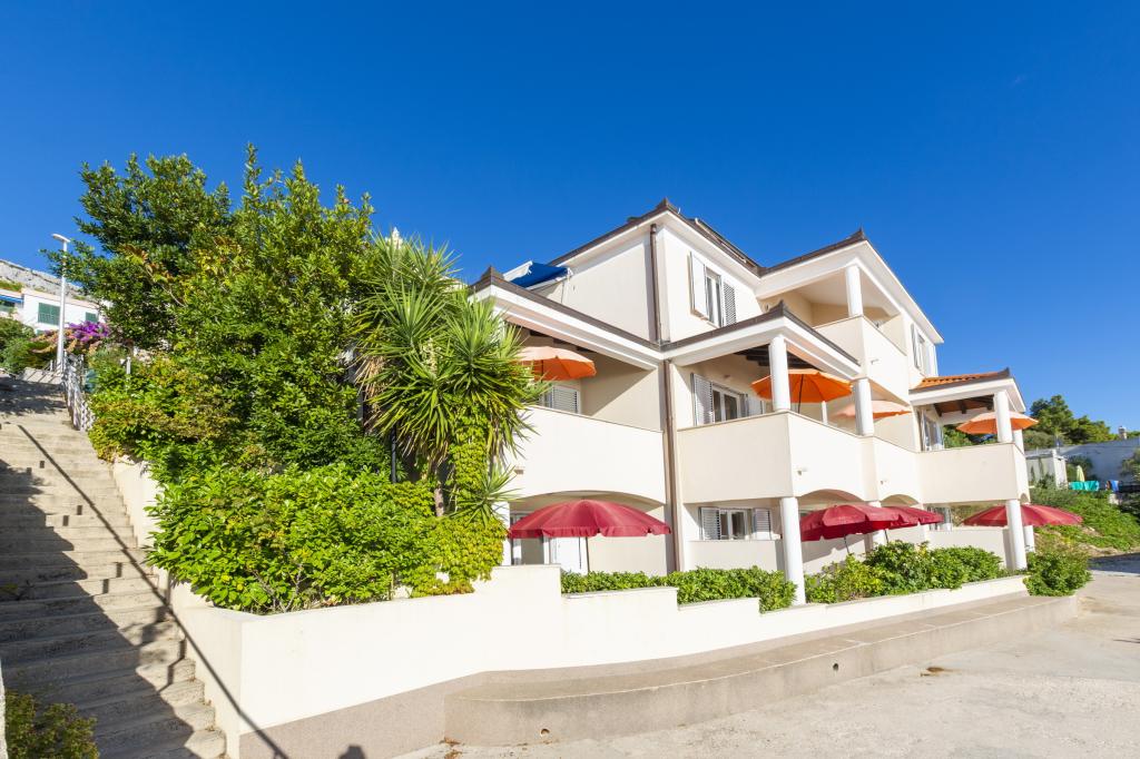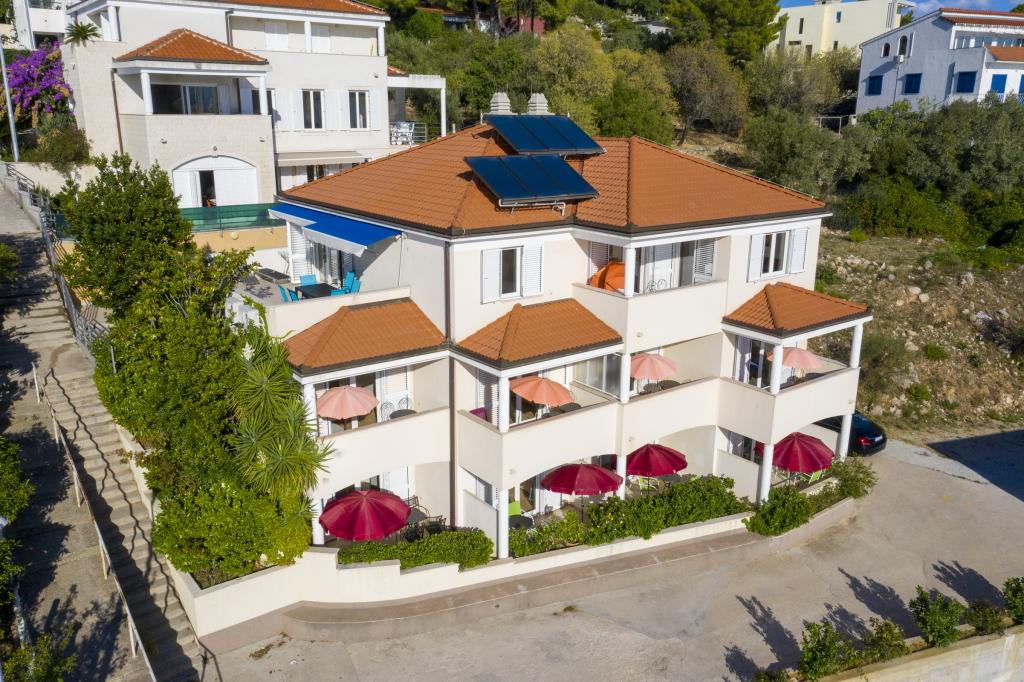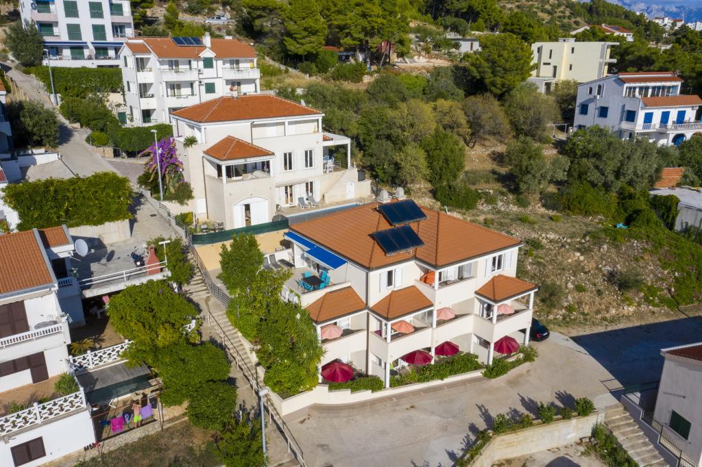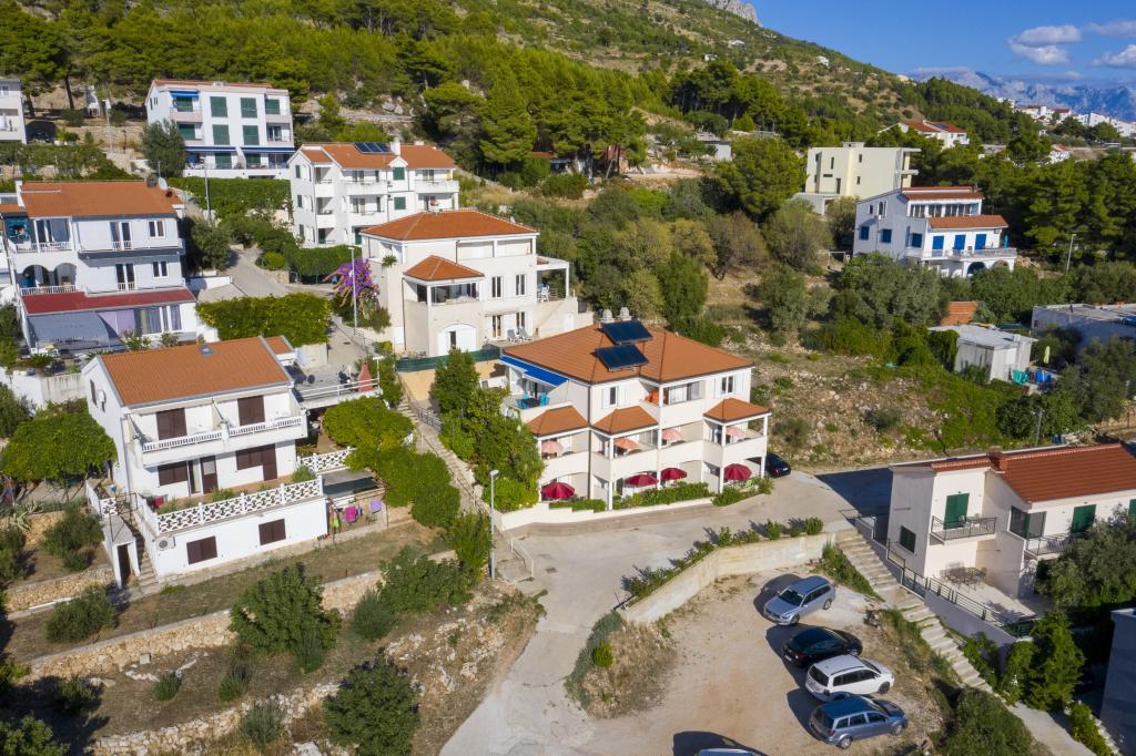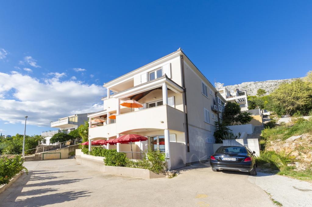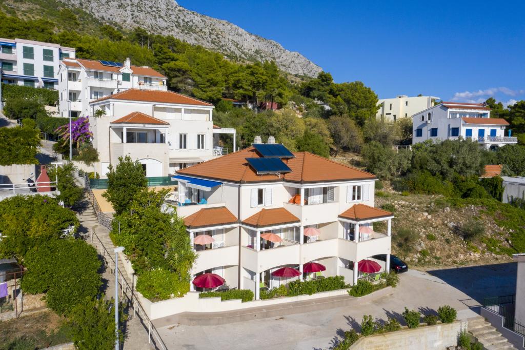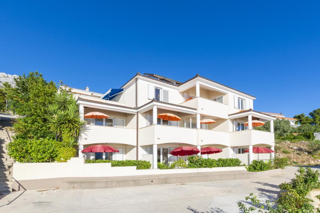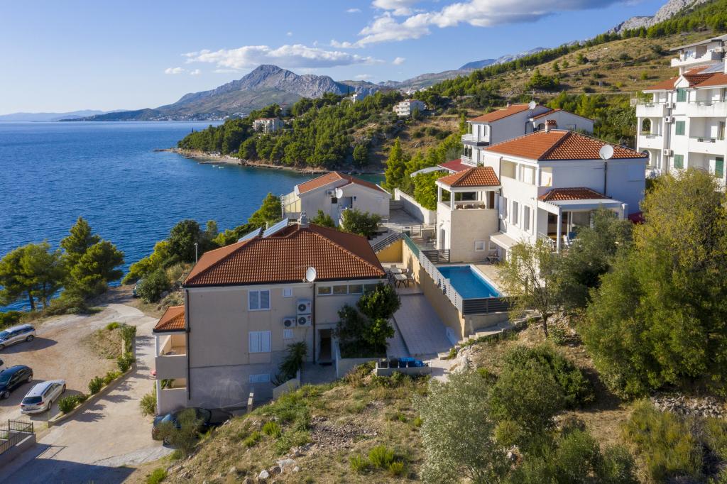 Unterkunft in neu gebauten, äußerst komfortablen und hervorragend ausgestatteten Apartments. Die Anlage liegt 3 km vom Zentrum von Omiš entfernt. Insgesamt acht Apartments in erster Reihe zum Meer. Alle Apartments verfügen über große Terrassen mit Blick auf das Meer und die Insel Brač. Parkplätze befinden sich direkt neben der Anlage. Die Apartments liegen unterhalb der Hauptstraße (300 Meter), direkt am Meer und einem großen Kiesstrand. Es gibt vier Apartmenttypen: Typ 2+2 mit einem separaten Schlafzimmer mit Doppelbett und einem Wohnzimmer mit zwei Betten, Typ 2+2 großes Studio, Typ 4+2 große Luxus-Apartments mit zwei Schlafzimmern mit Doppelbett und einem großen Wohnzimmer mit zwei Ausziehbetten sowie ein weiteres großes Deluxe-Apartment. Die Wohnung vom Typ 14+2 ist in Wirklichkeit eine dreistöckige Villa mit 300 m² Wohnfläche. Sie verfügt über einen 9 x 4 Meter großen, beheizten Swimmingpool, sieben Doppelzimmer, zwei große Wohnzimmer mit Balkonen und Terrassen, vier Badezimmer, ein separates WC, einen Außengrill, eine Sauna, einen Fitnessraum usw. Der Pool steht ausschließlich den Bewohnern der Wohnung A 14+2 zur Verfügung.